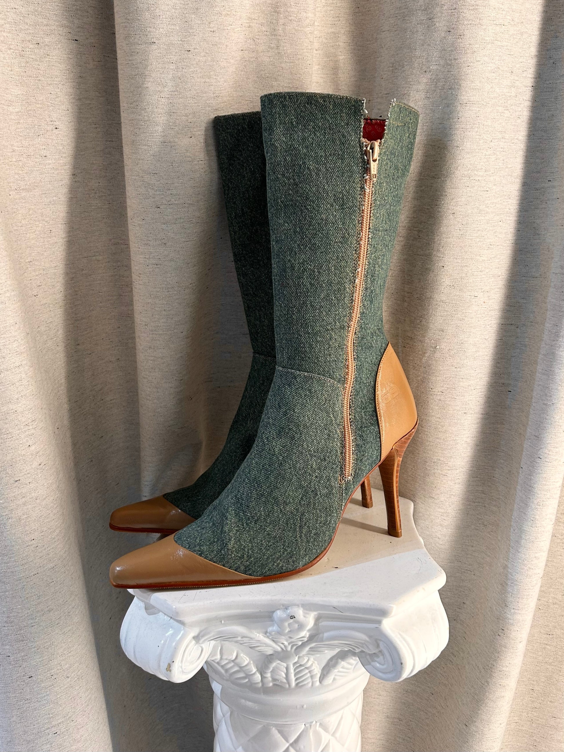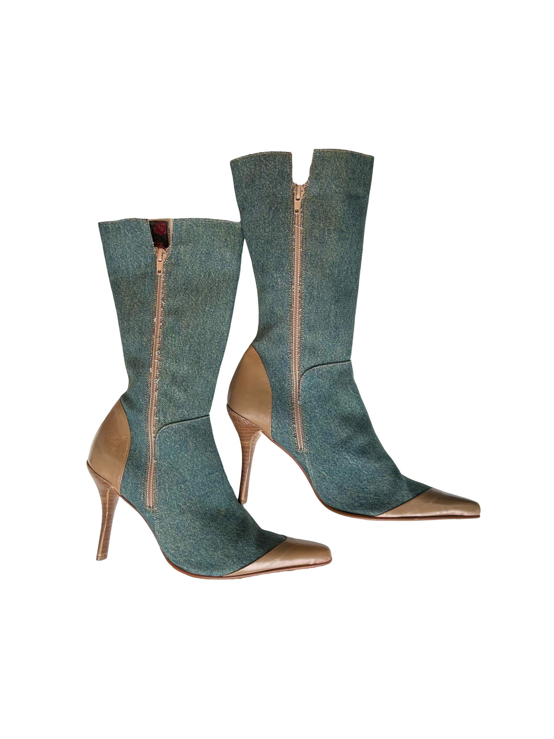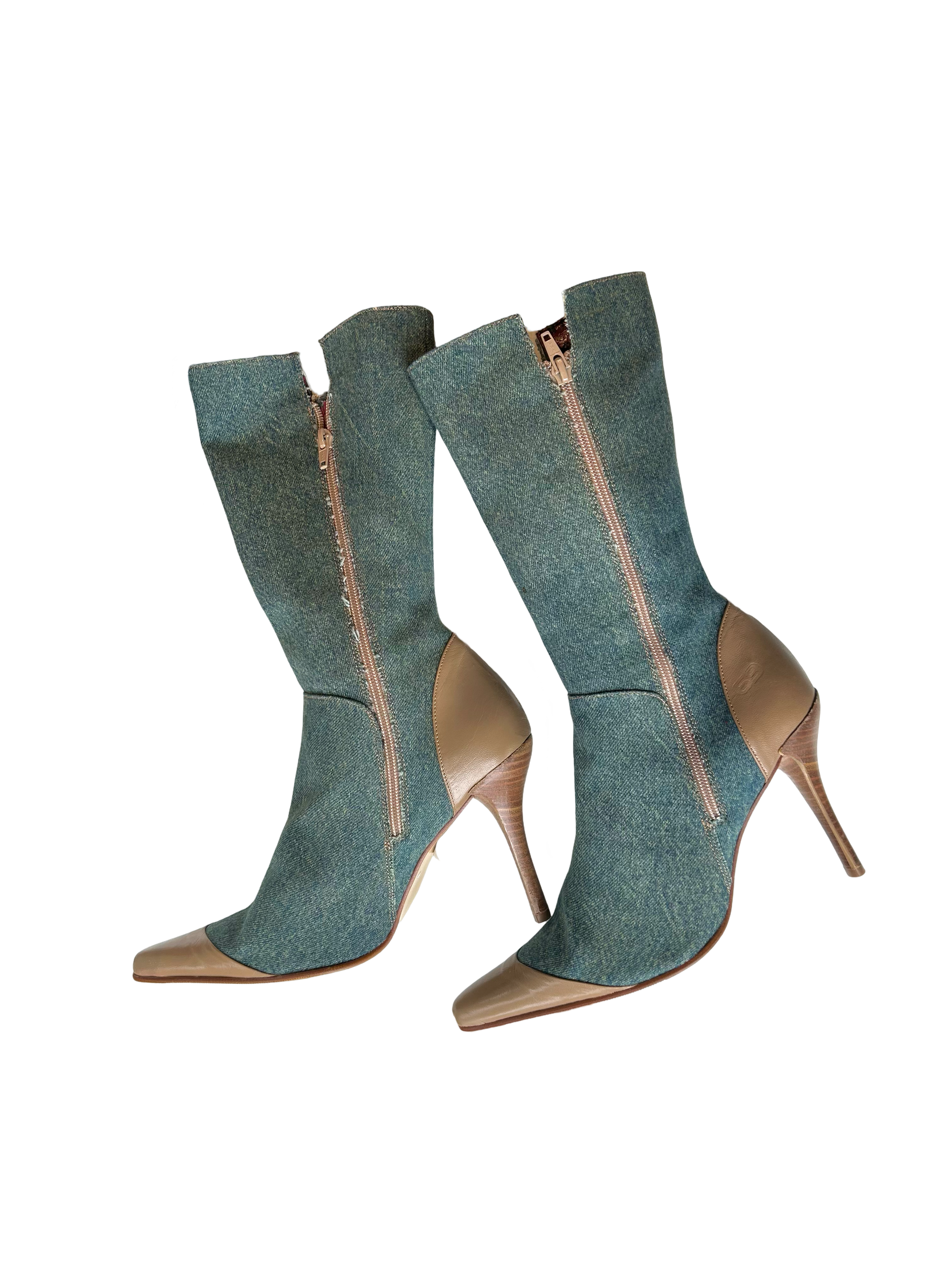 Pointy stiletto heels in calf length and cut out detail. Blue green denim and cut out details in beige leather.