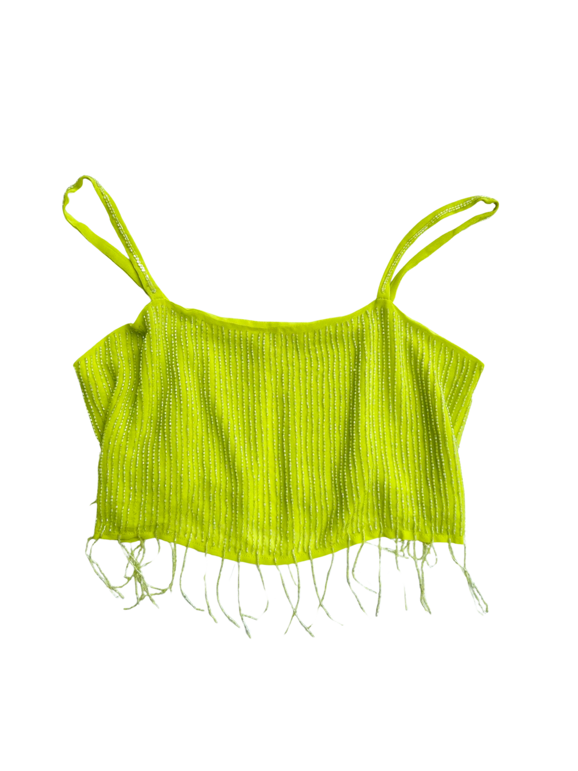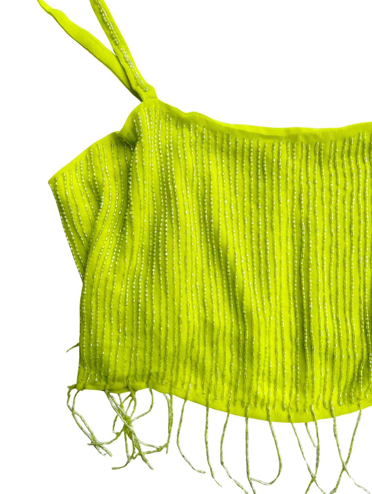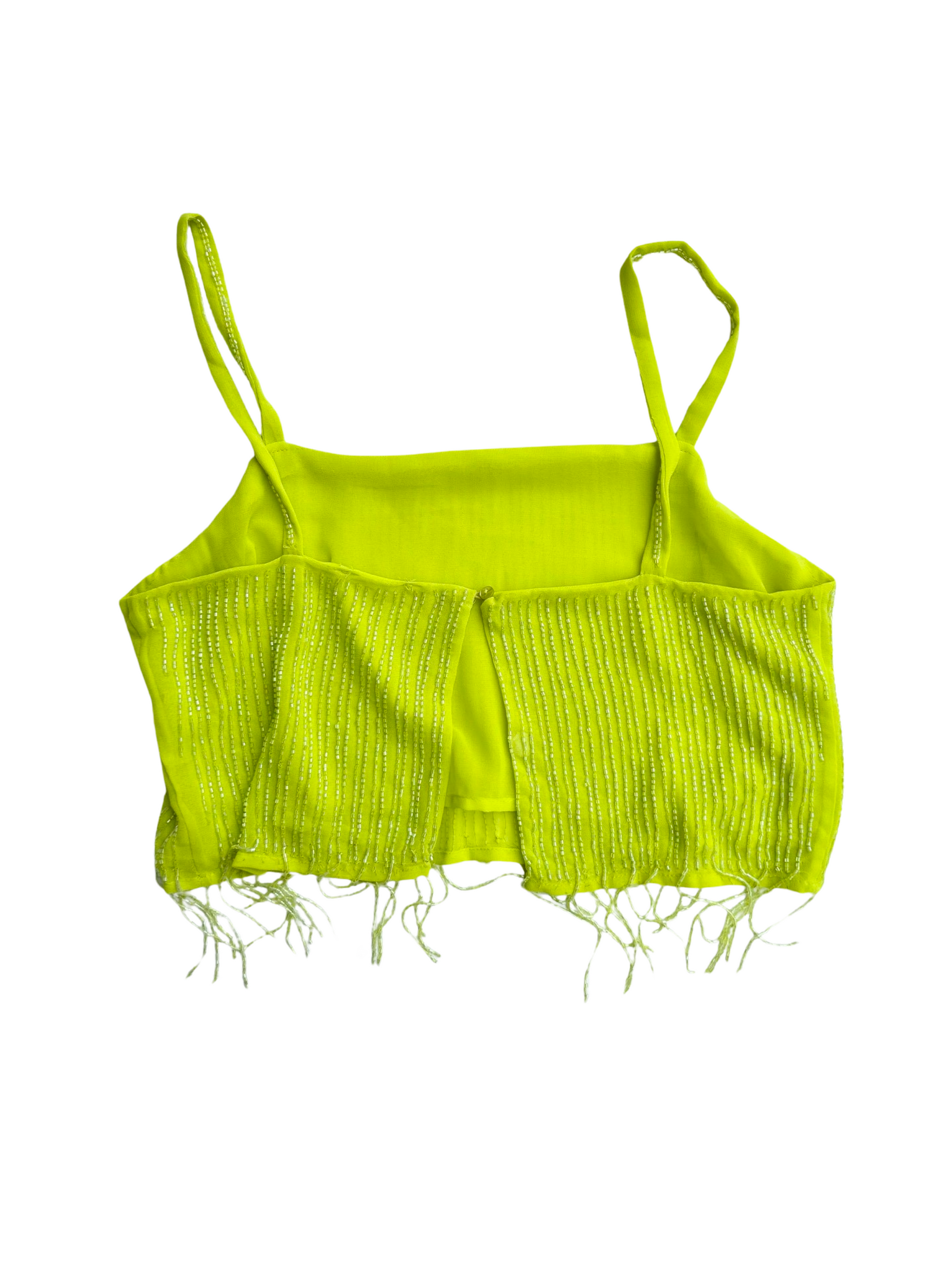 A show stopper! Neon yellow cropped top, embellished all over and fringes on the hem, button in the back leaves an open back effect.