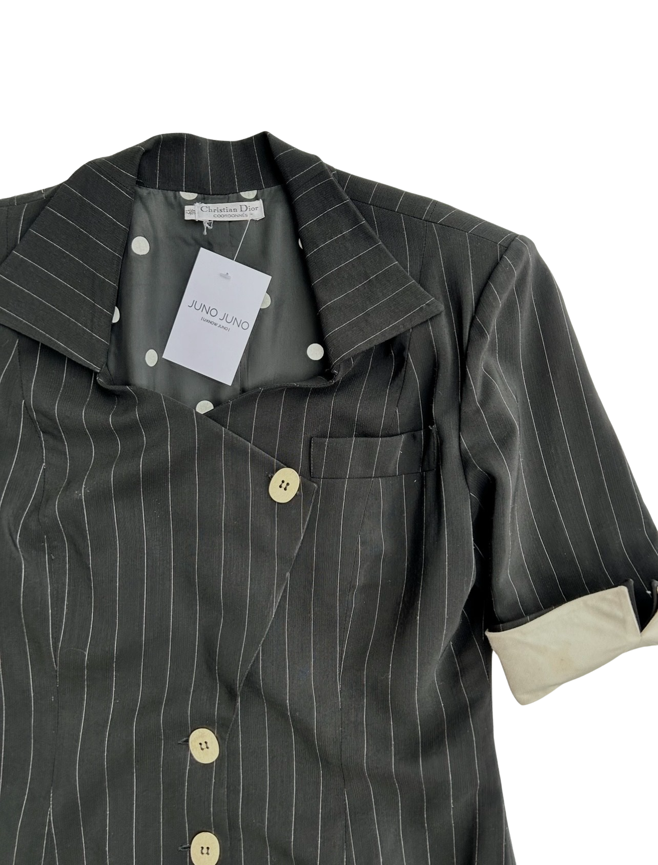 One of a kind pinstripe tailored mid length blazer dress by Christian Dior. A fitted design with golden buttons in the front, layers of white fabric on the sleeves.