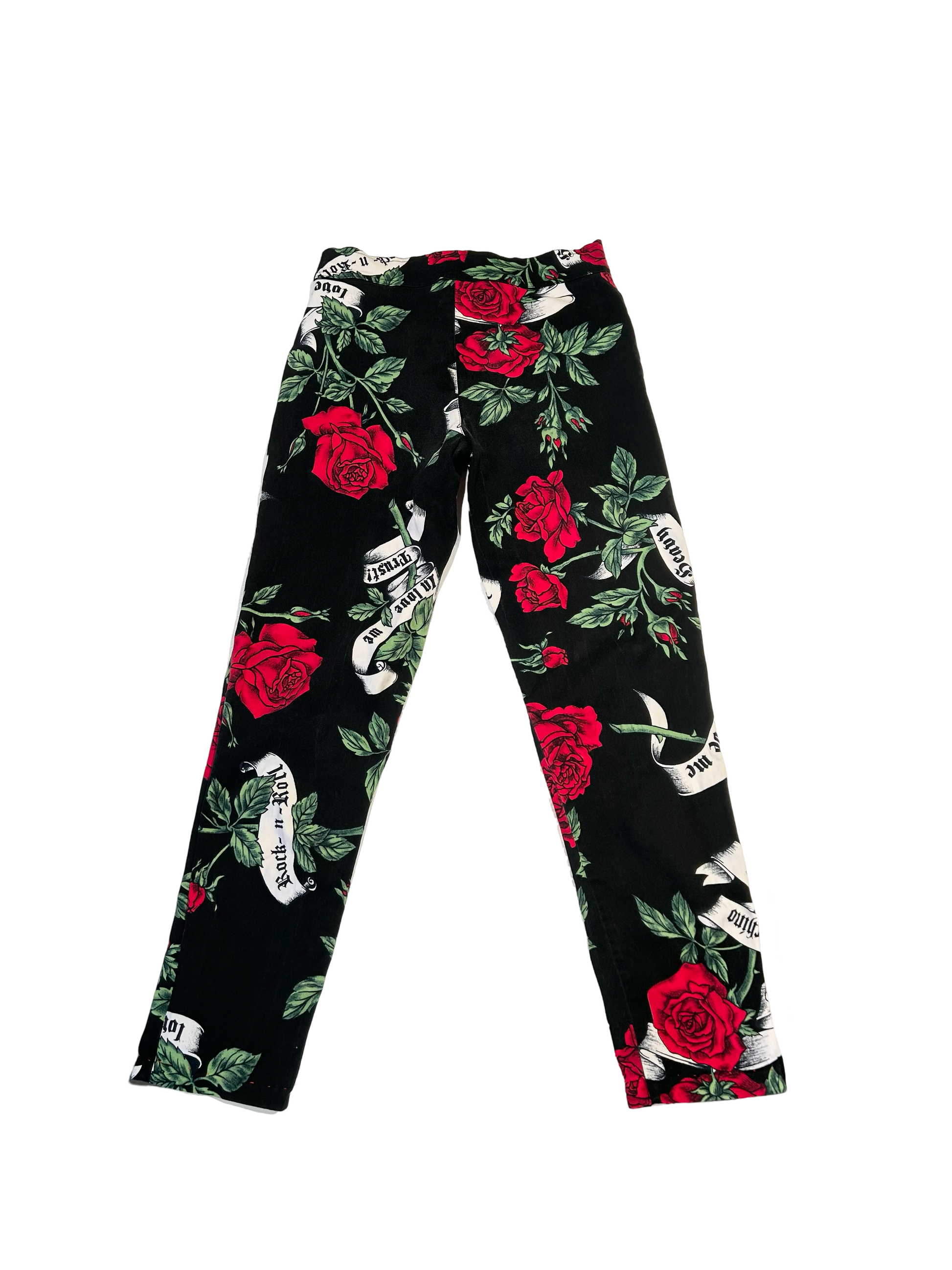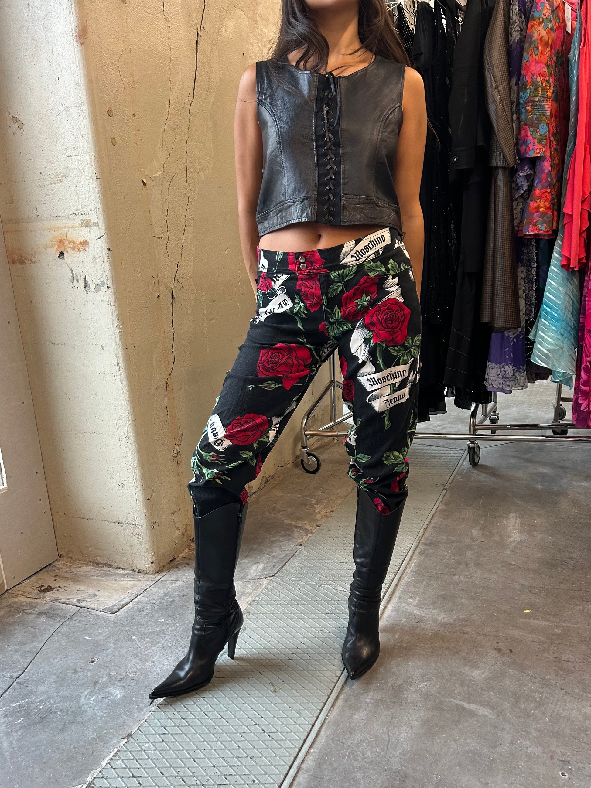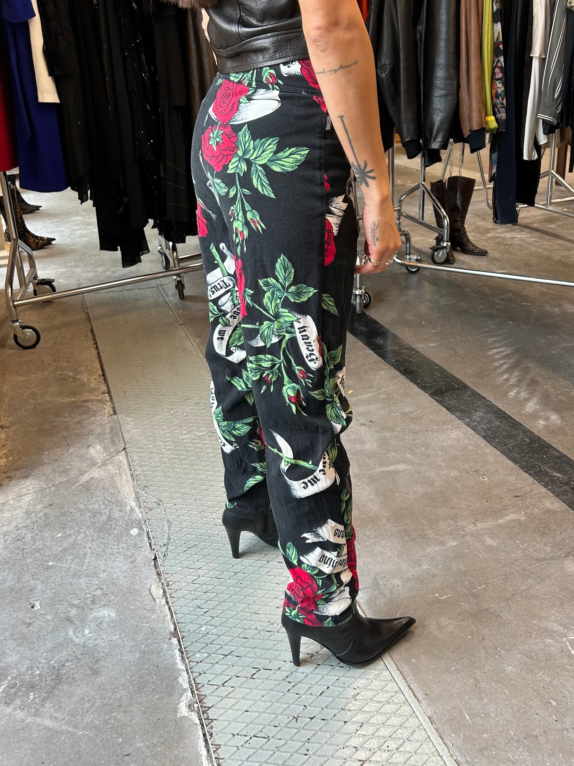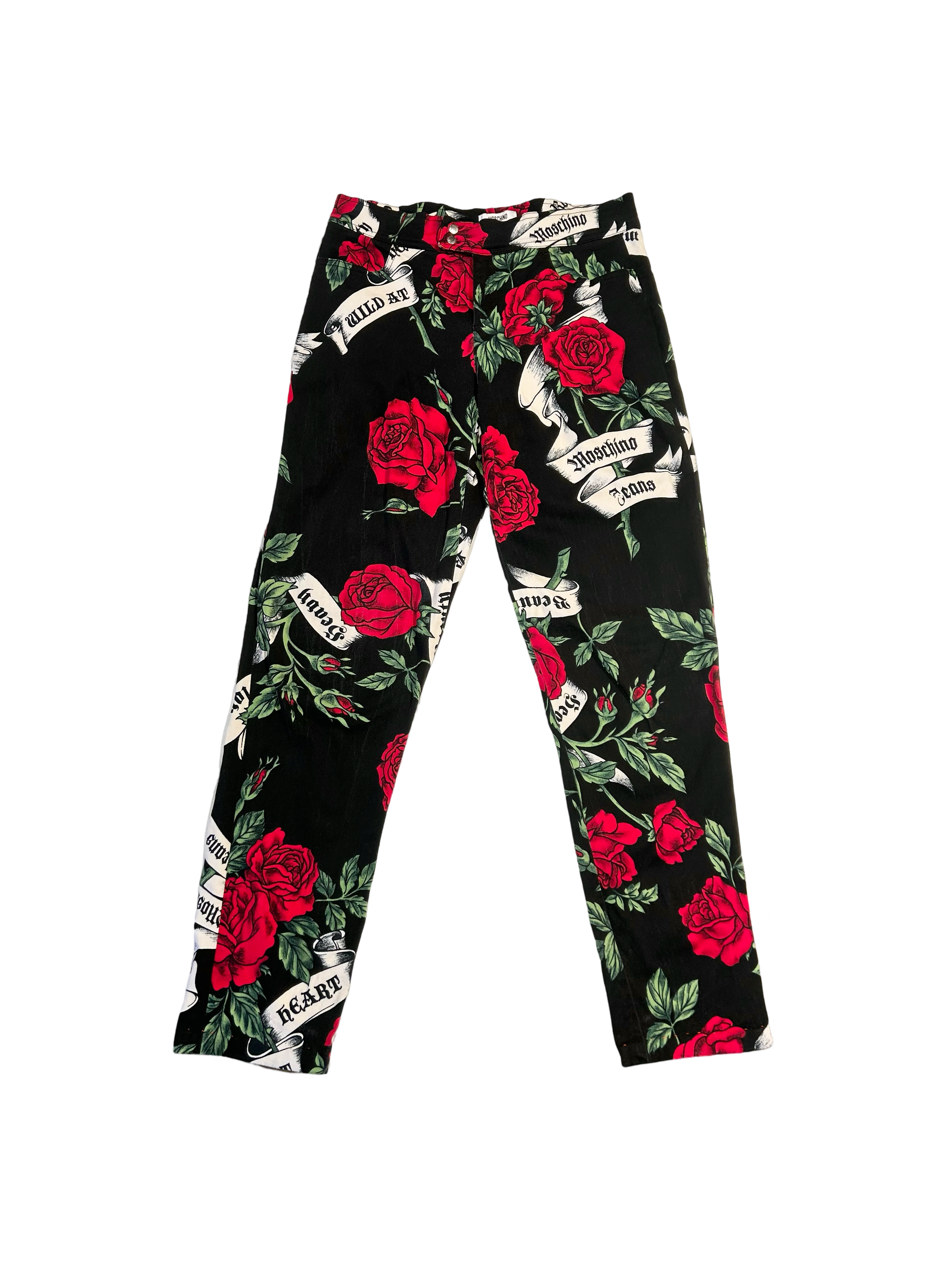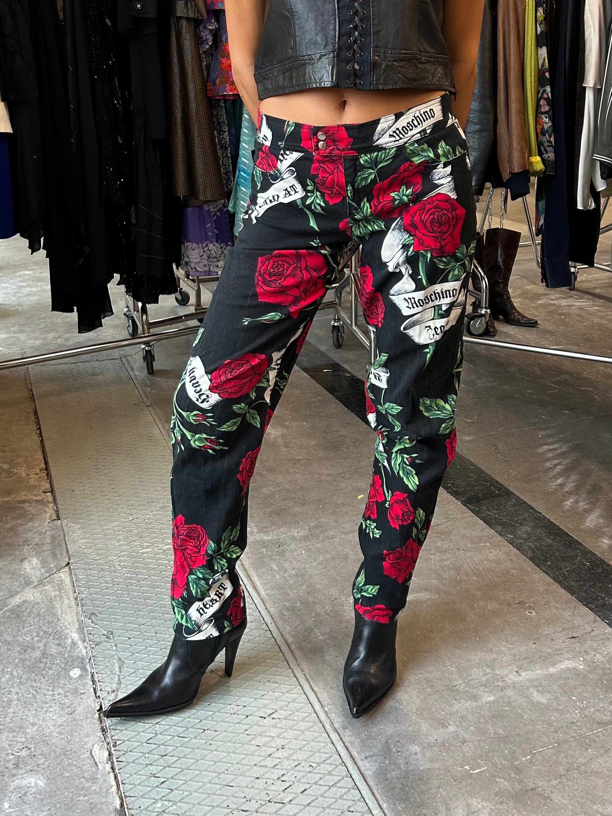 Rare and unique 1990’s Moschino tatto pants in black backdrop and tattoo print in white and rose red with the “Moschino jeans” monogram. A soft denim fabric and mid waist, leg is straight/pen.