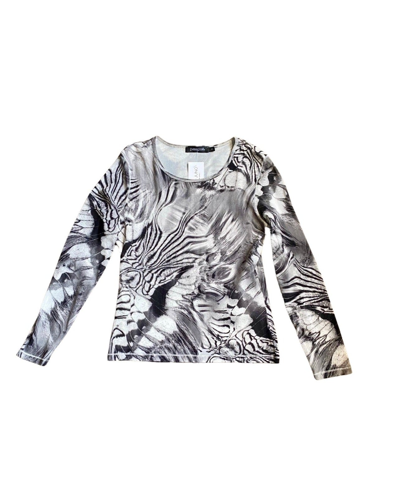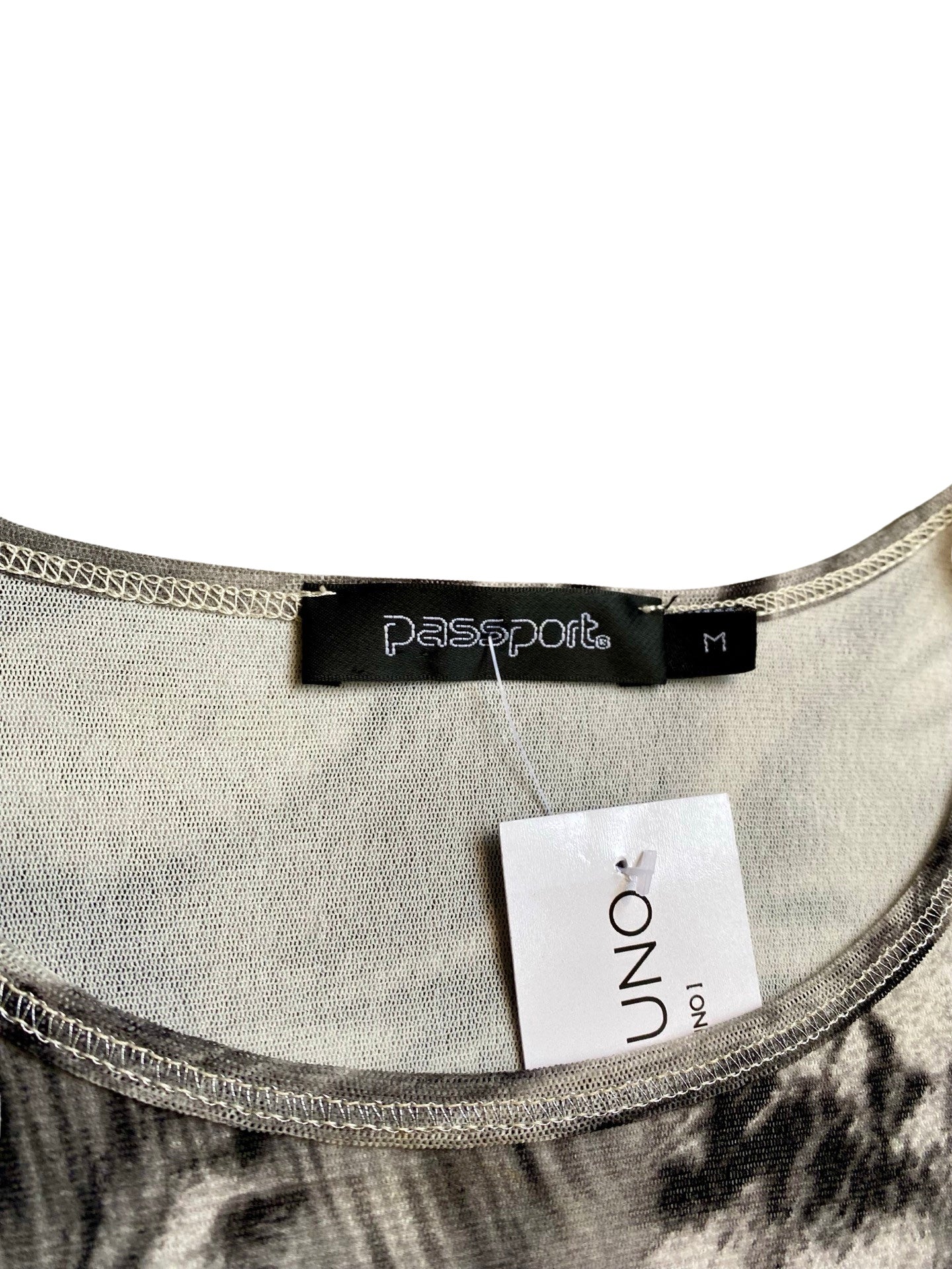 This dreamy mesh top is printed with abstract, organic shapes in different shades of gray. Embellished with shiny silver thread in the seams.