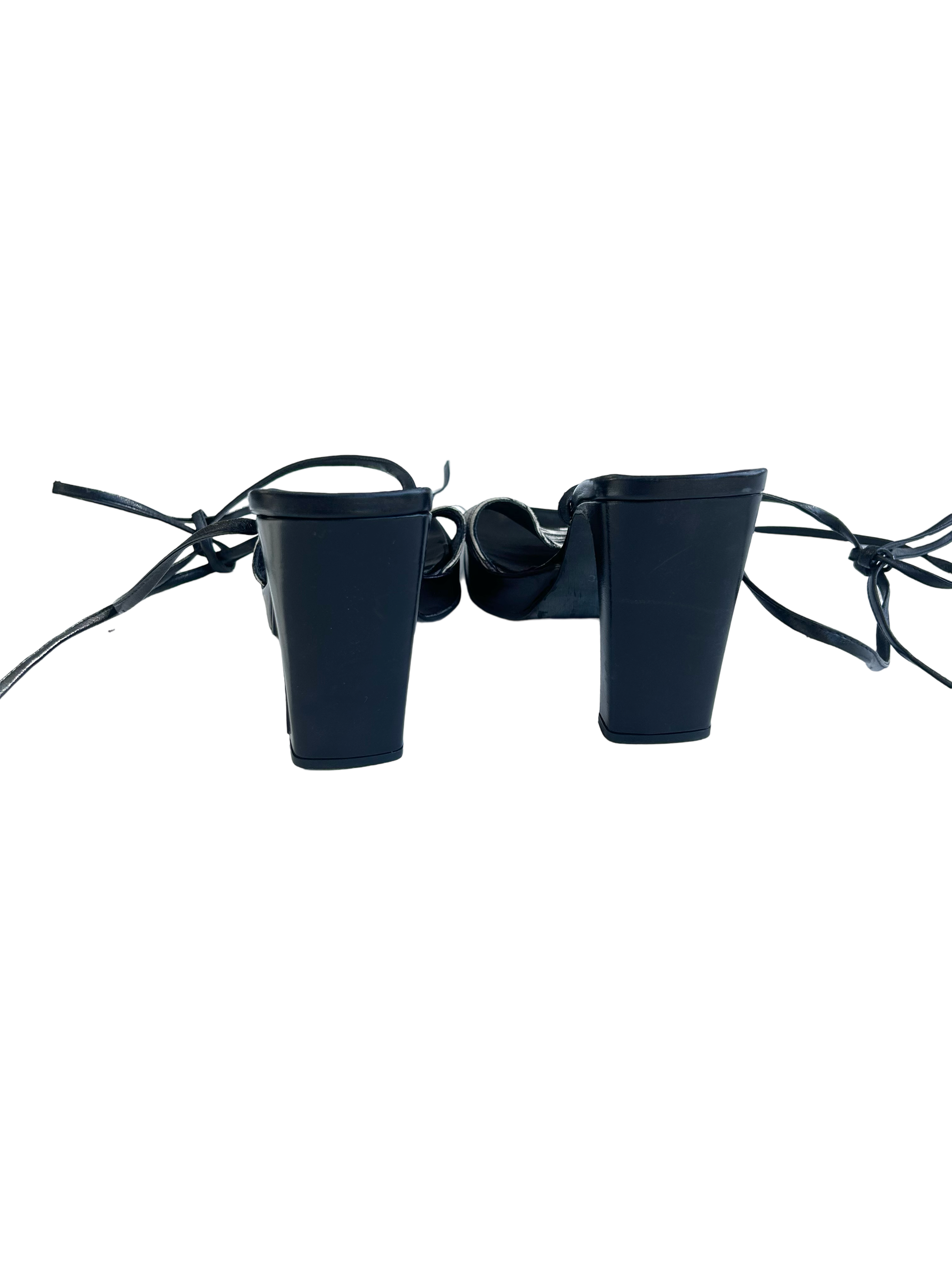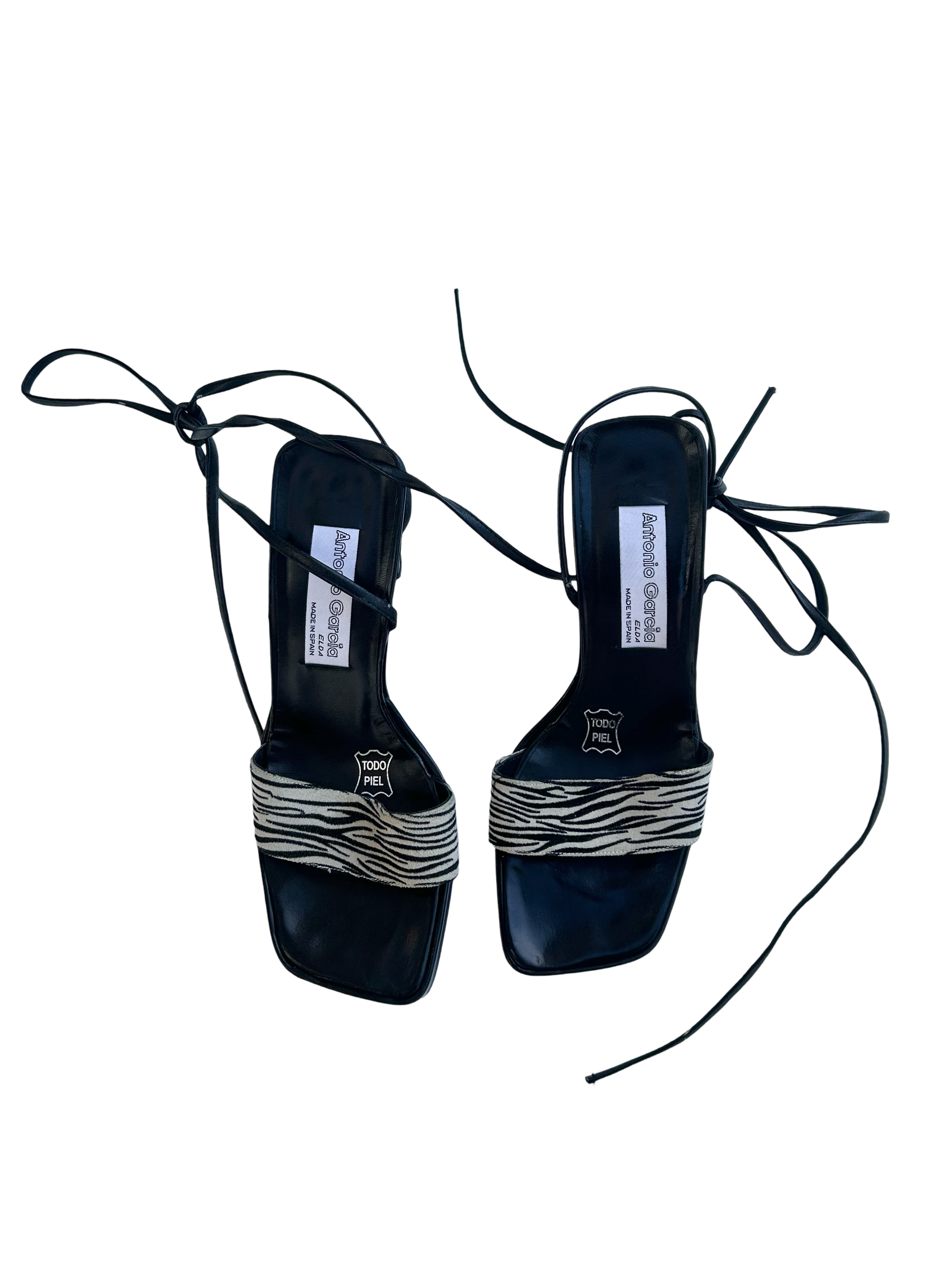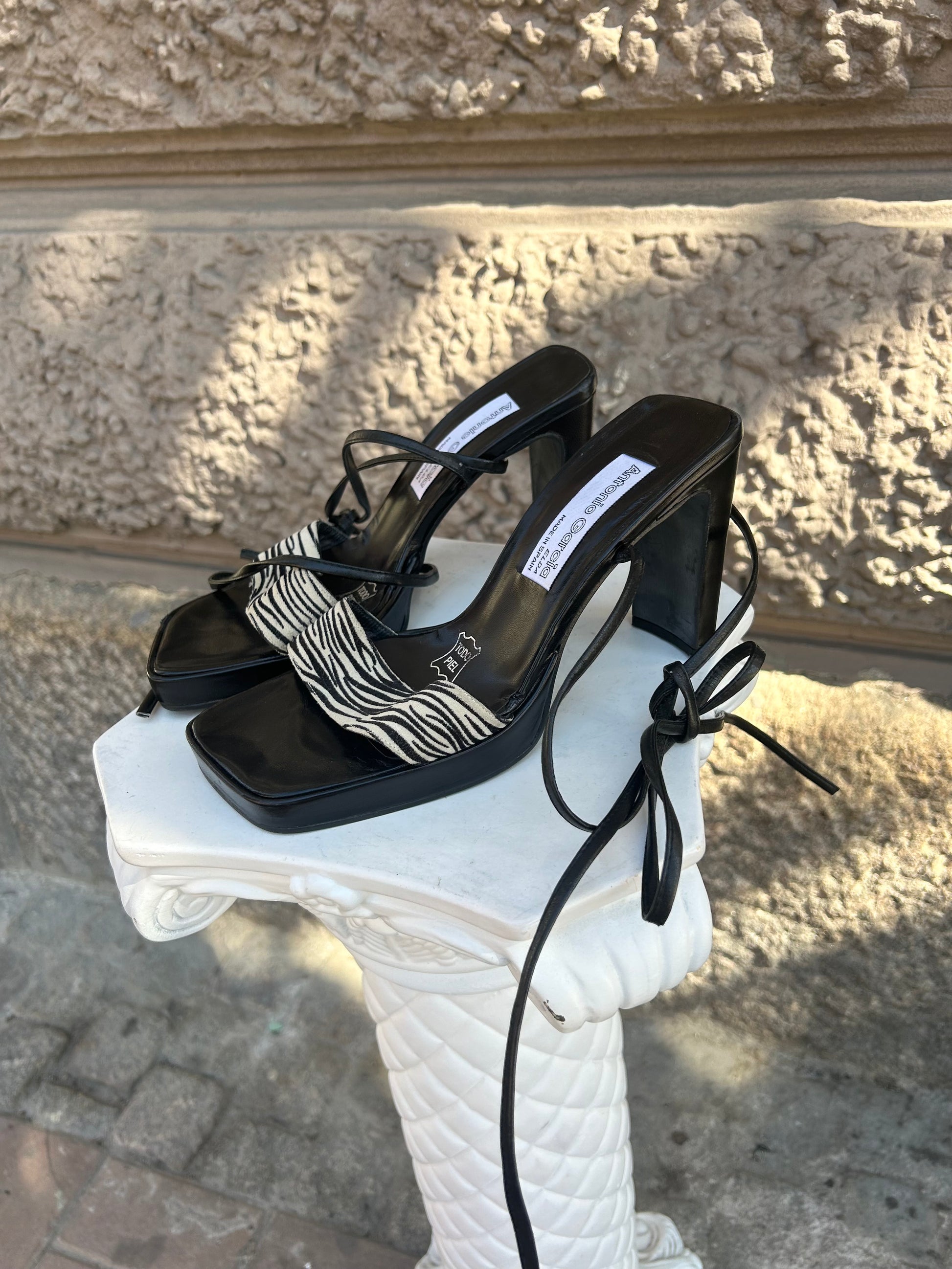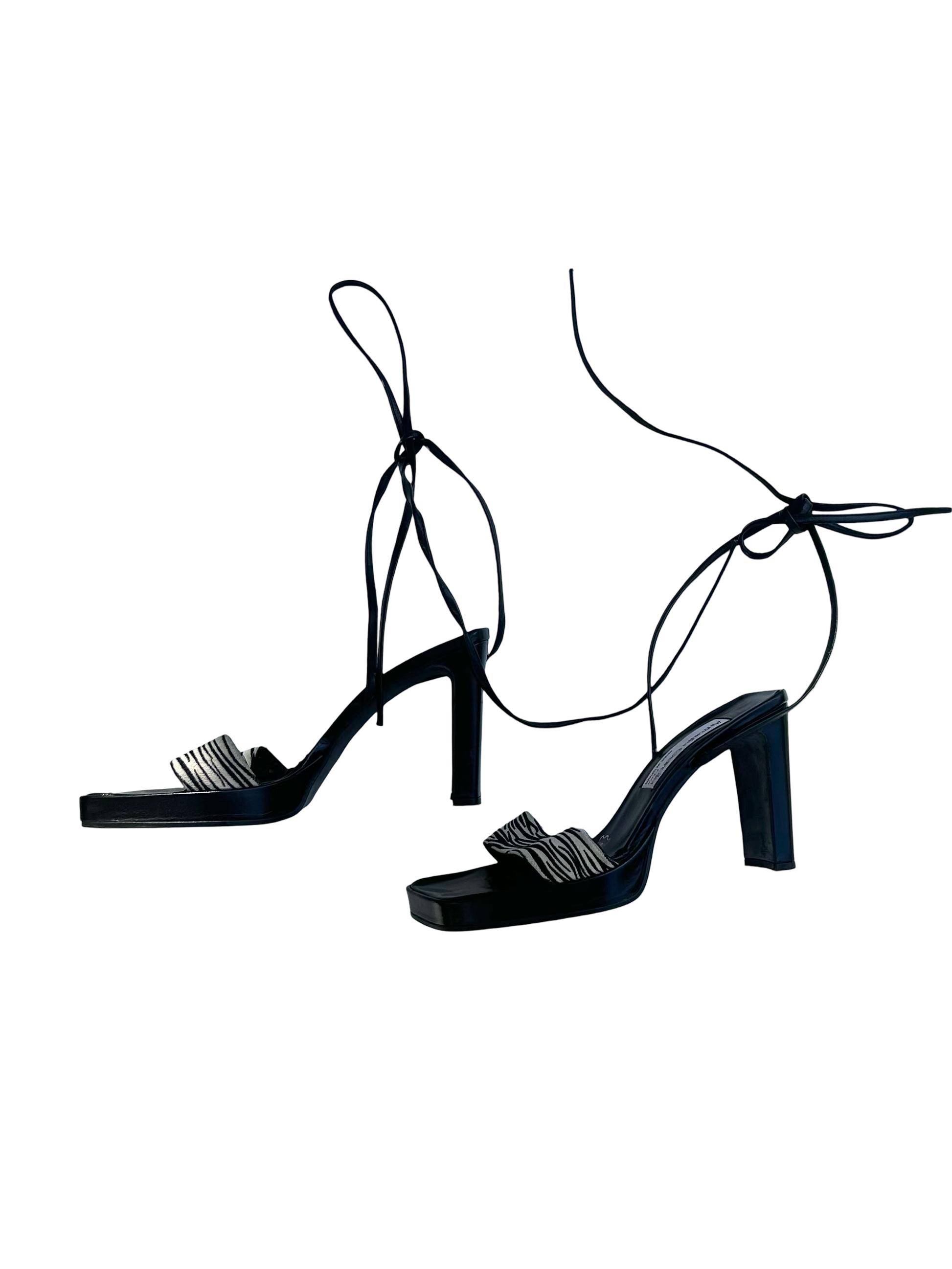Zebra platforms by Antonia Garcia, estimated from the Y2K era. Square toe and block heel with tie straps.