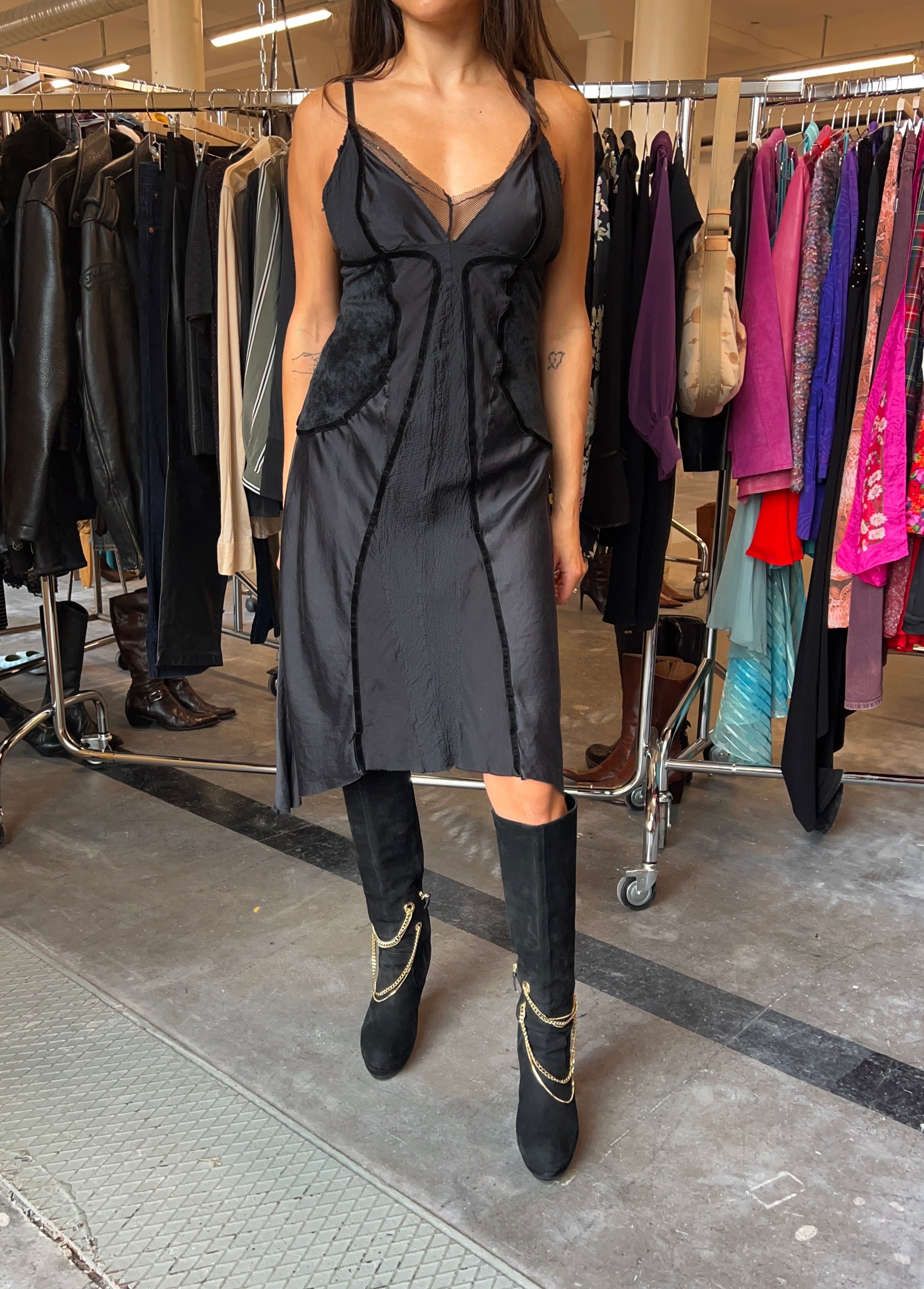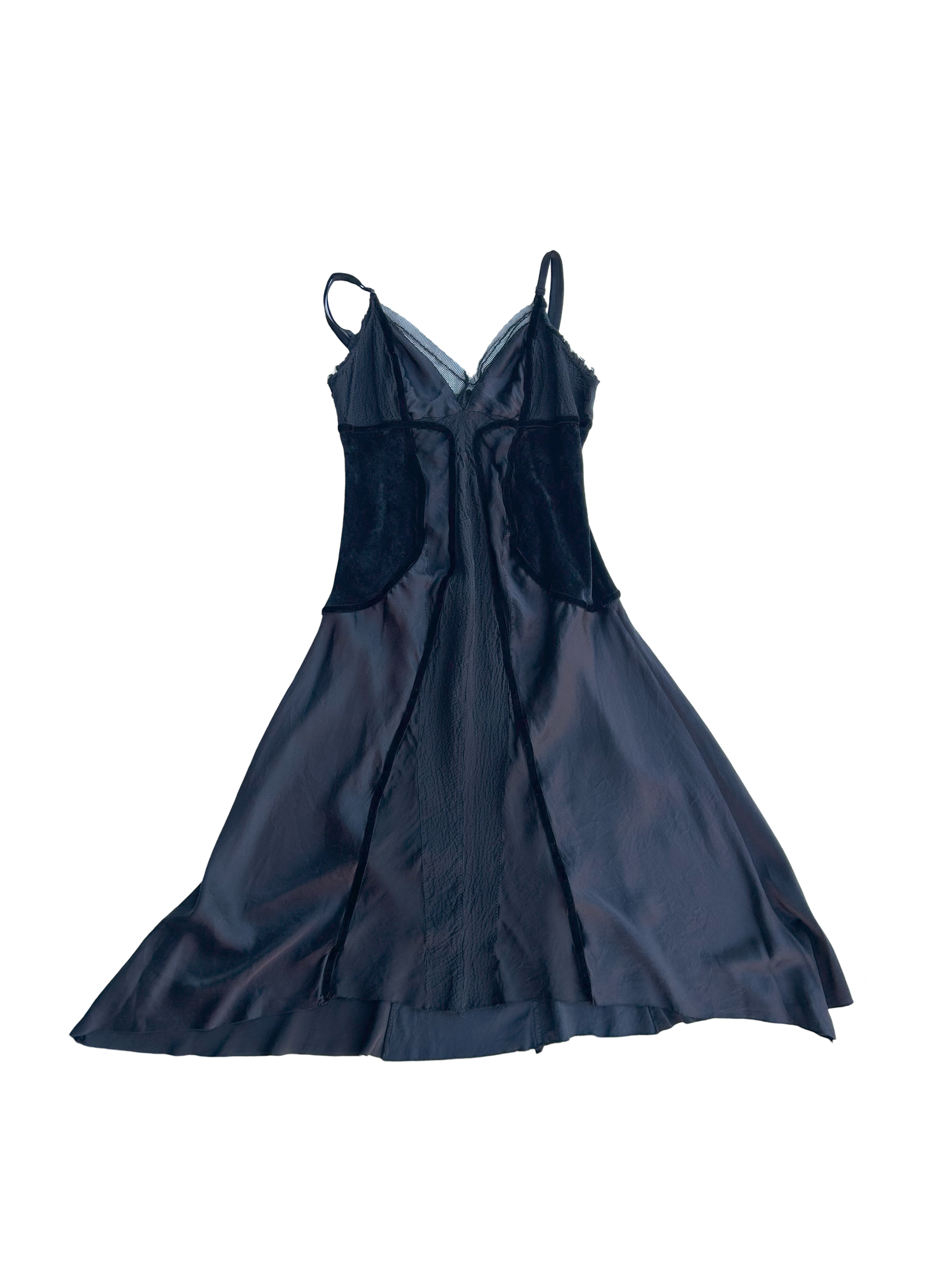 Asymmetrical dress in silk, velvet and some lace details made in Italy. A type off patchwork on fabric design and adjustable shoulder straps.