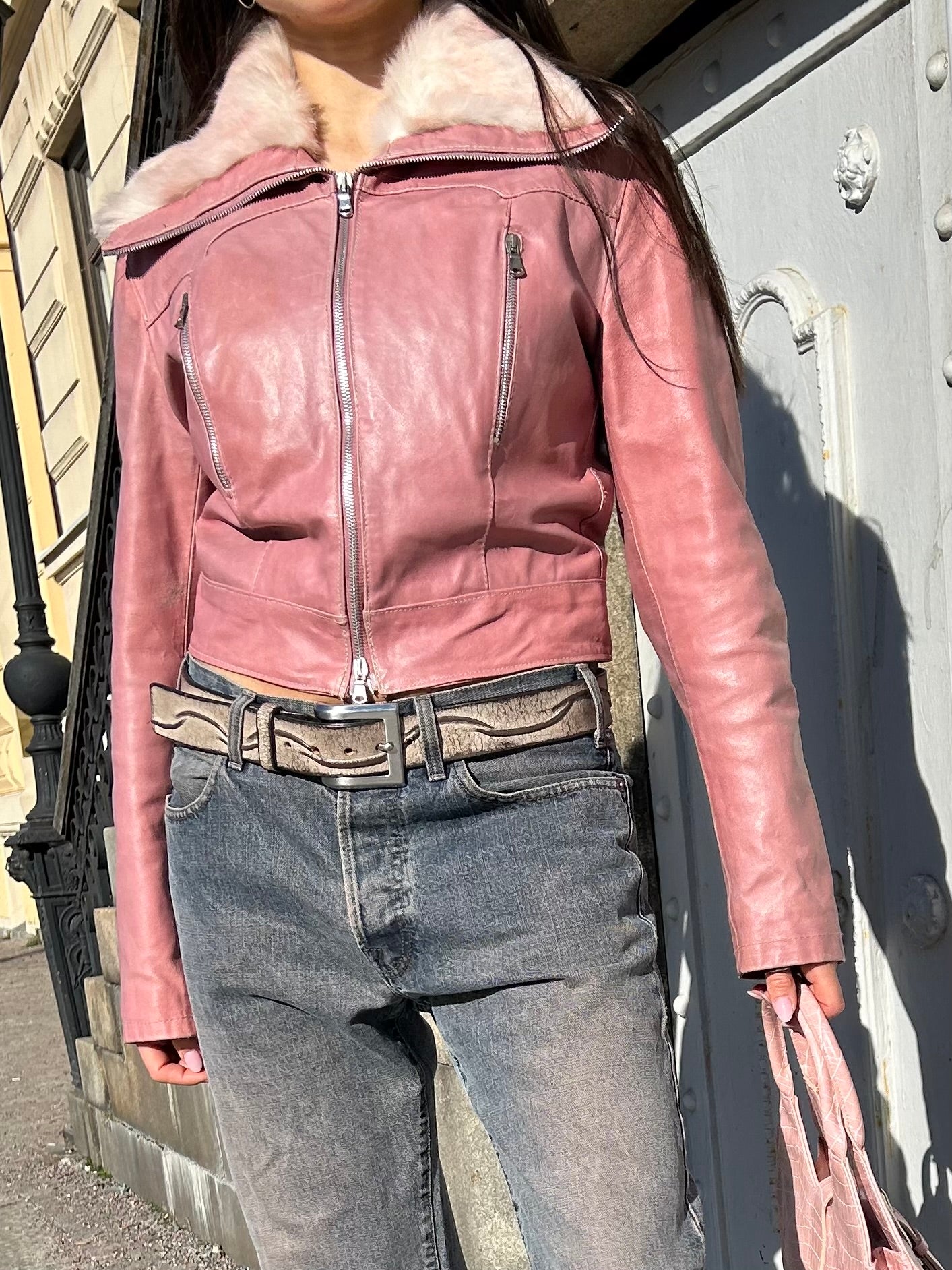 This jacket by SASCH is short and fitted, the design is simple but the color and fur collar gives it that extra!! The fur on the collar is a beautiful mix of white and pink gives it a cloud print. The jacket zips in the front and goes all the way up, wear it down for a big collar effect or all the way up to get a big polo collar.