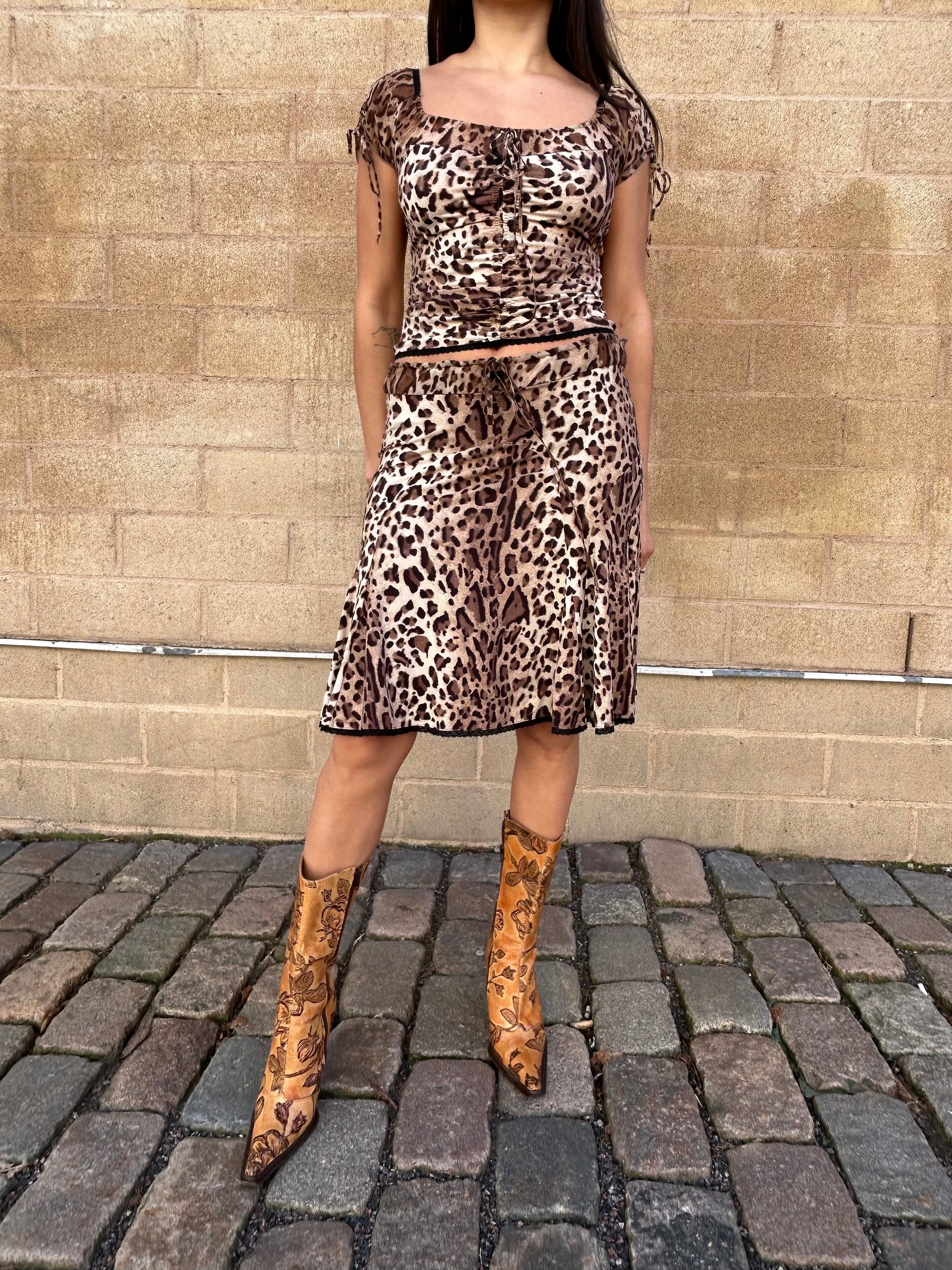 A 90’s silk set, skirt and top by Blumarine. The top is in a milkmaid design with tie diaries and skirt is a mini length with tie in the front.