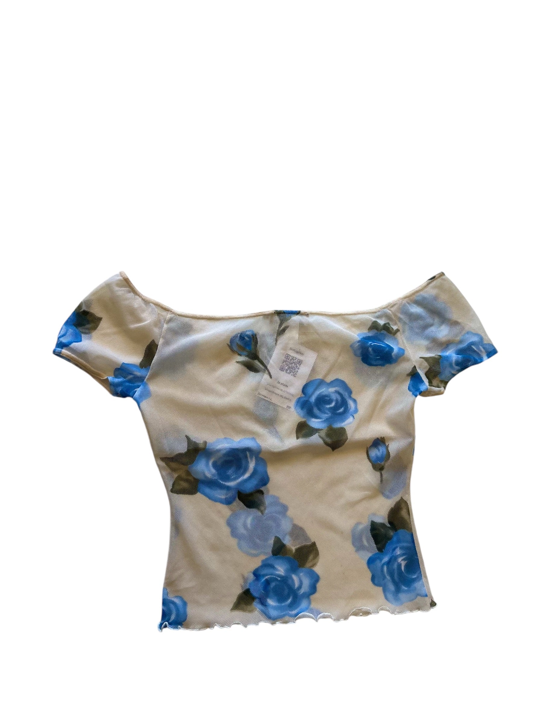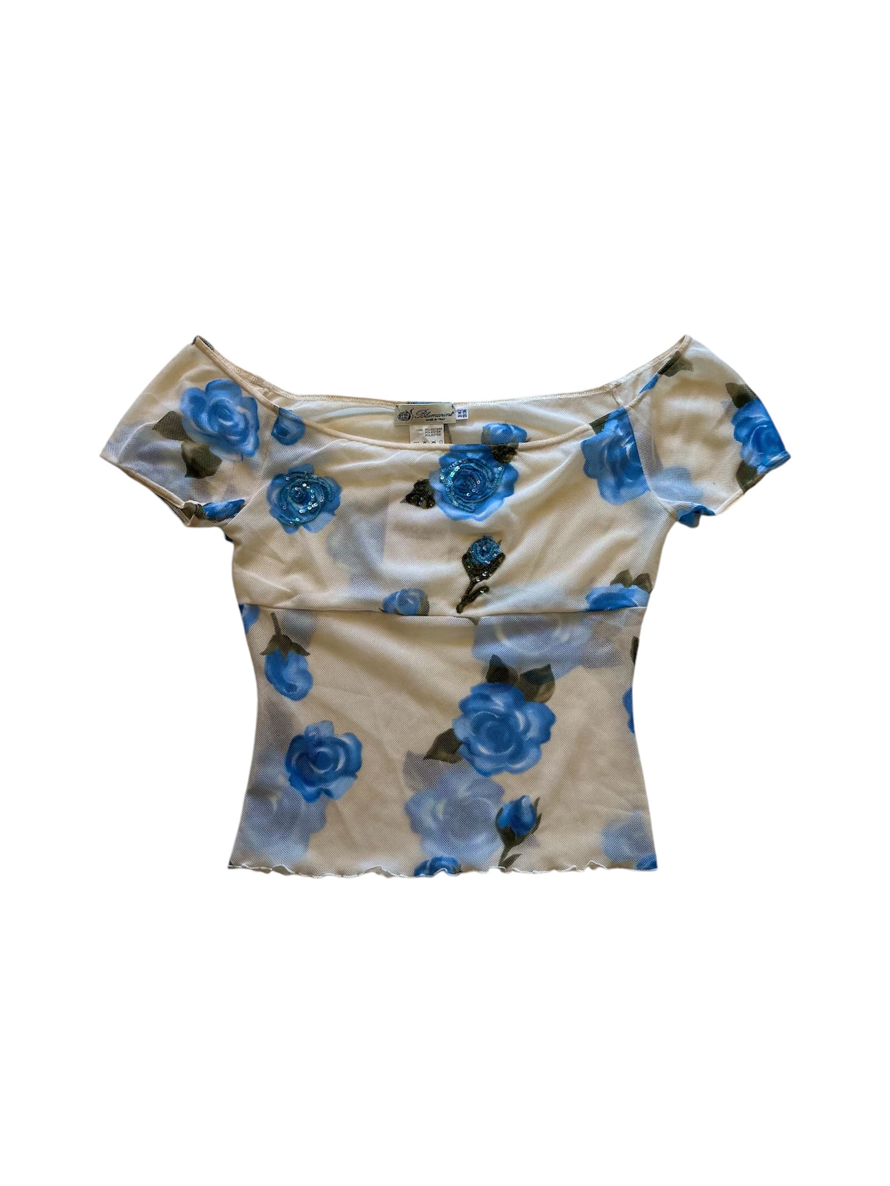 An off shoulder mesh top signed Blumarine. The top is light beige and has a blue and green floral print. The flowers are partly embellished with sequins.