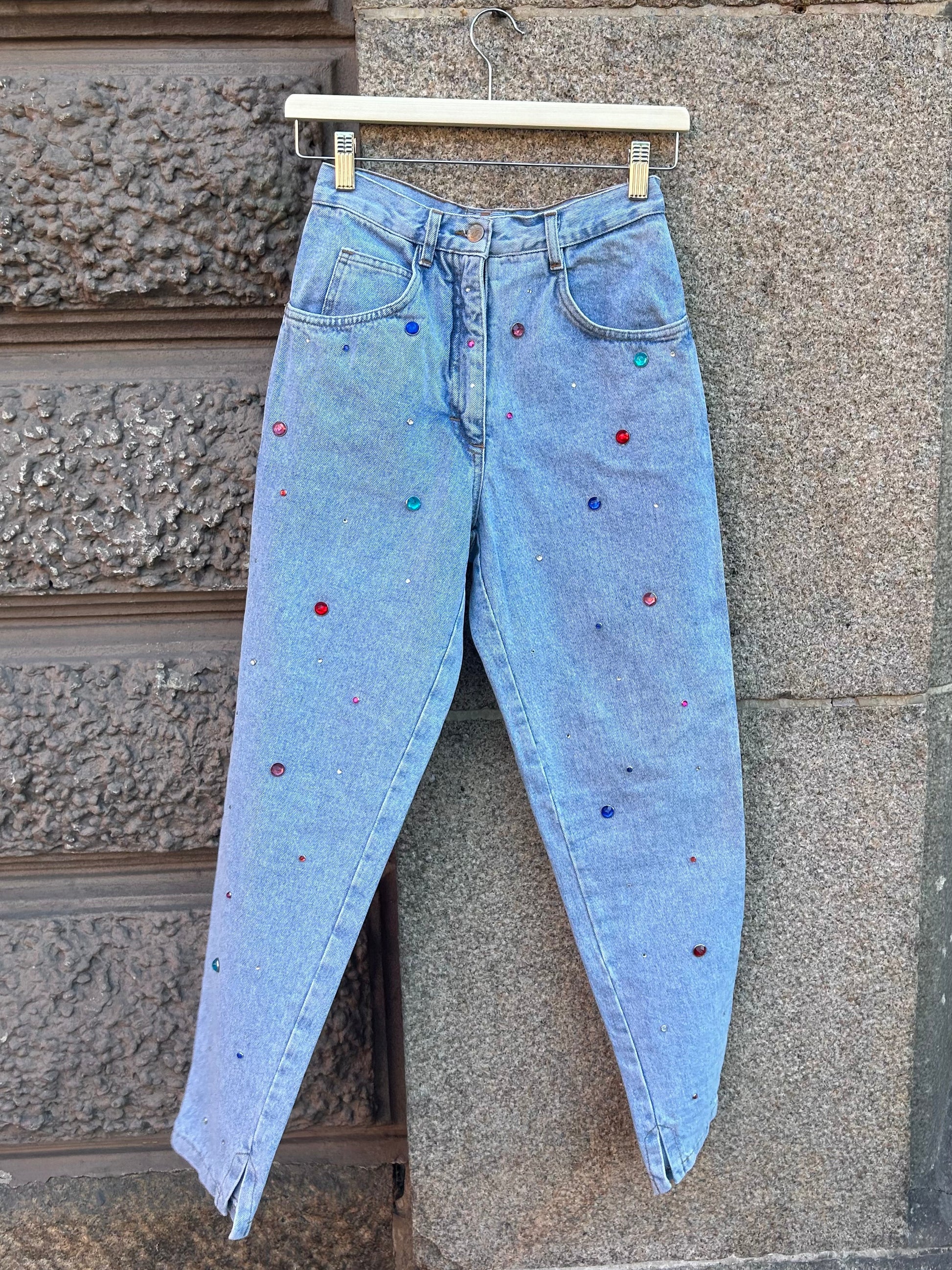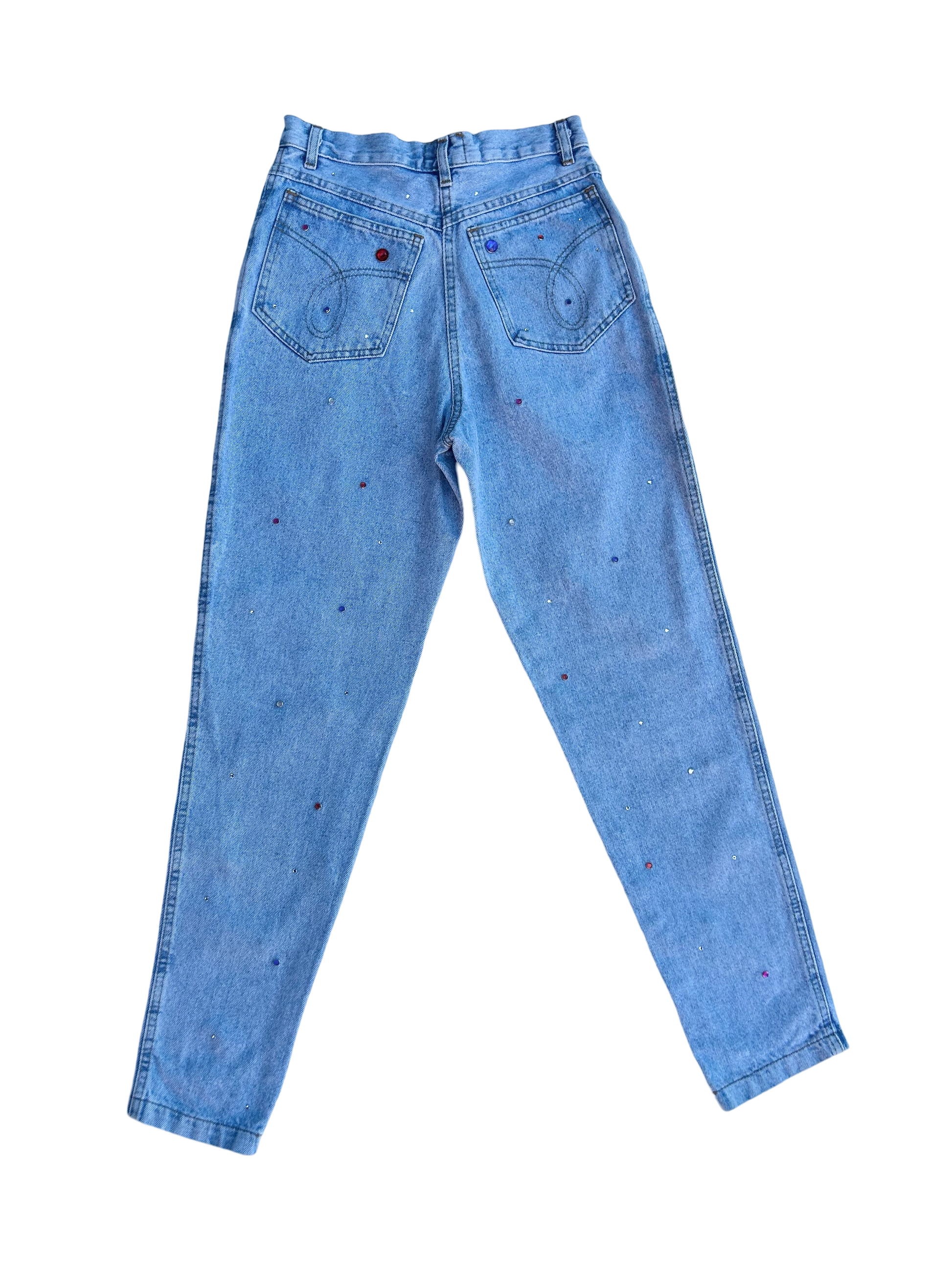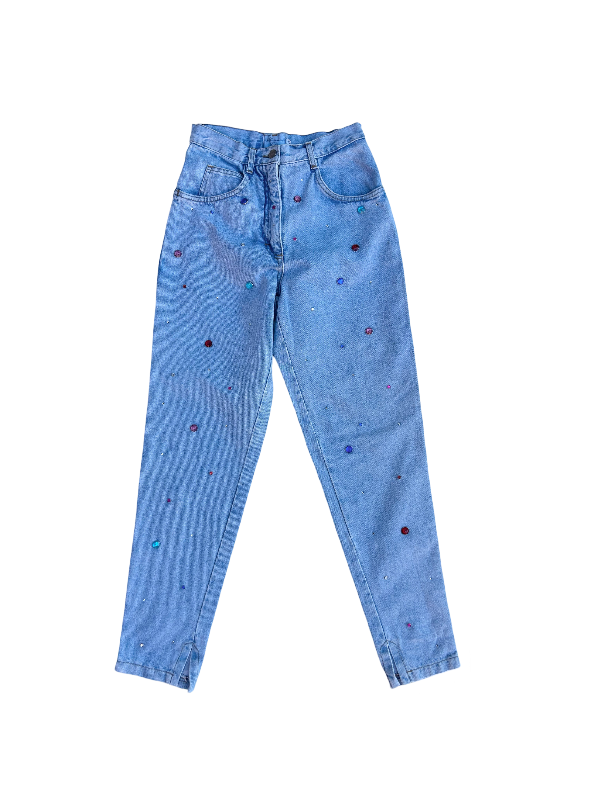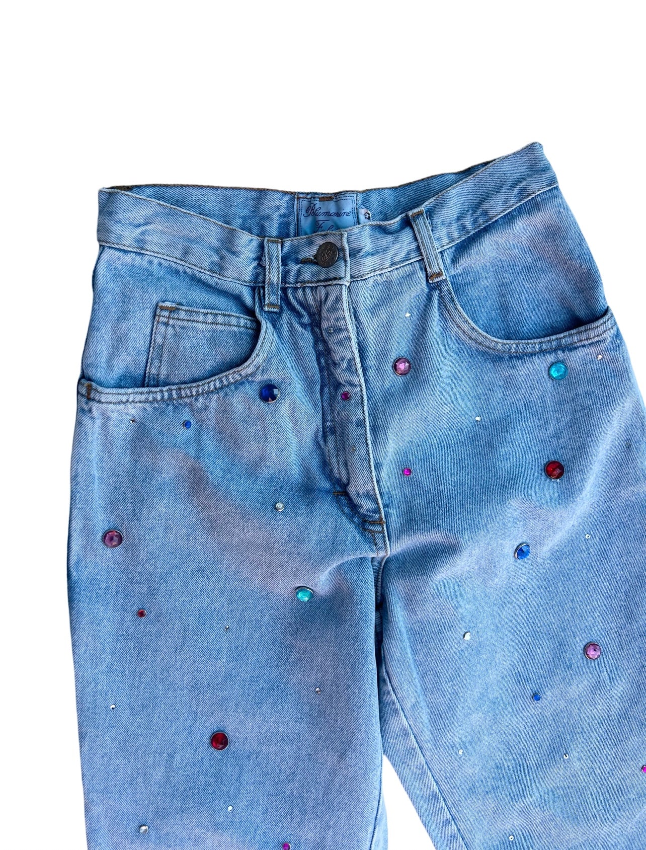 A fun pair of jeans in a light washed denim color with rhinestones in various colors and sizes all over.