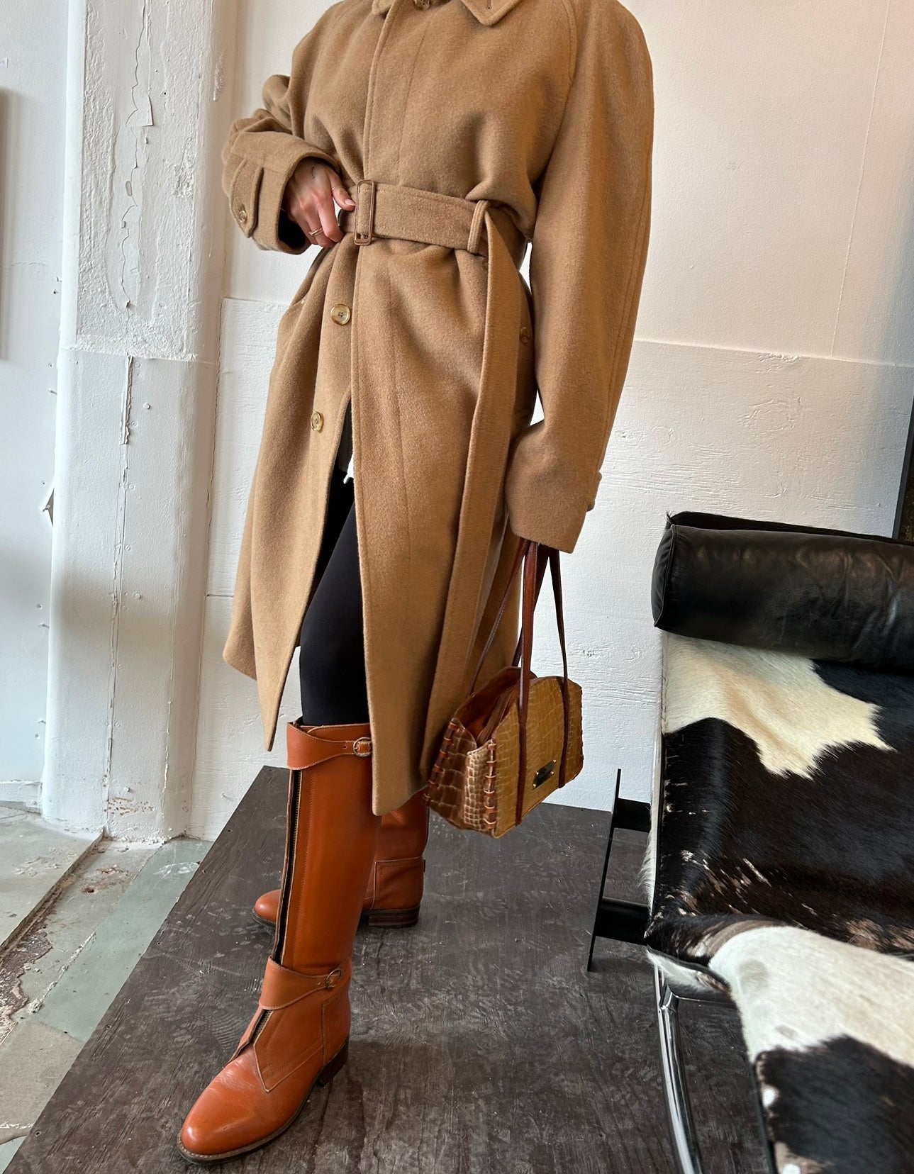 A staple coat of our wardrobe dreams. This thick and luxurious coat mixed with cashmere, wool and camel will forever be in style and keep you warm. A classy design with covered buttons in the front, pockets on the sides and a belt with leather buckle in the waist.