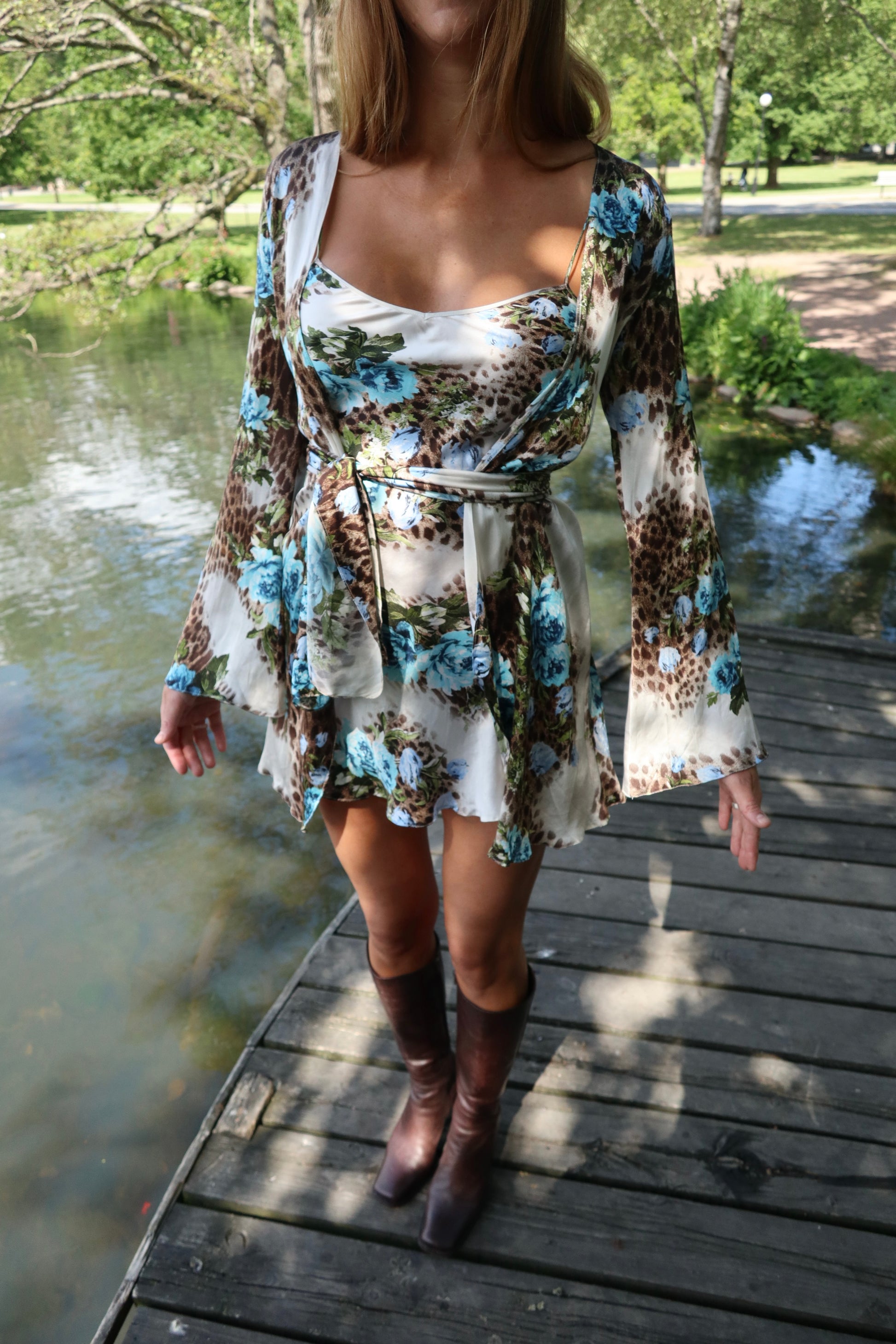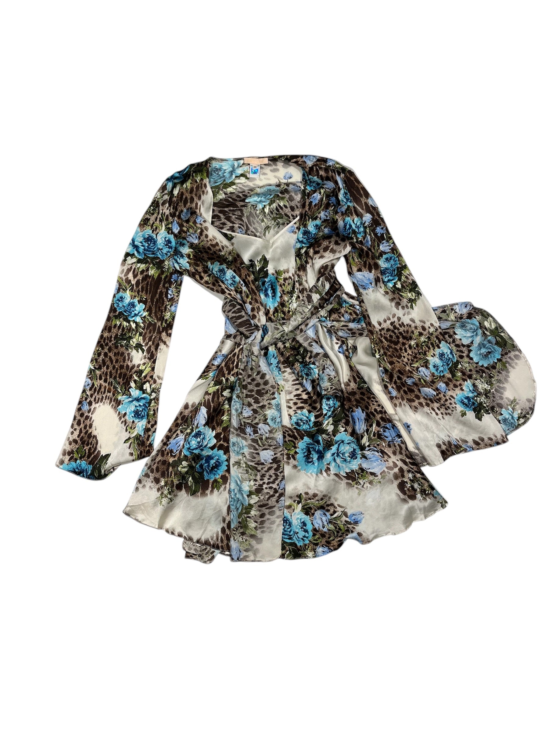 A gorgeous 3-piece set from Roberto Cavalli. The set is in 100% silk, and has a leo pattern with blue flowers. The set consists of a slip dress, a long sleeved blouse and a waist belt.