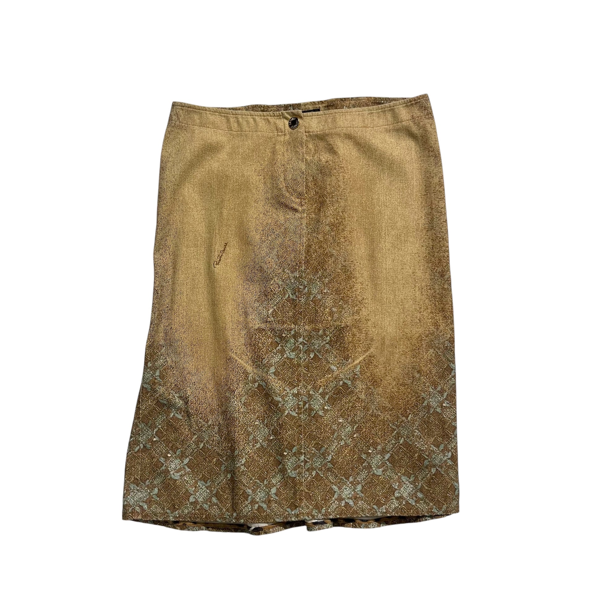 Cool skirt from Roberto Cavalli in a shimmery, golden fabric. Prints in light blue and light brown. Midi length. Pleated in the back. Closes with a button and zipper in the front.