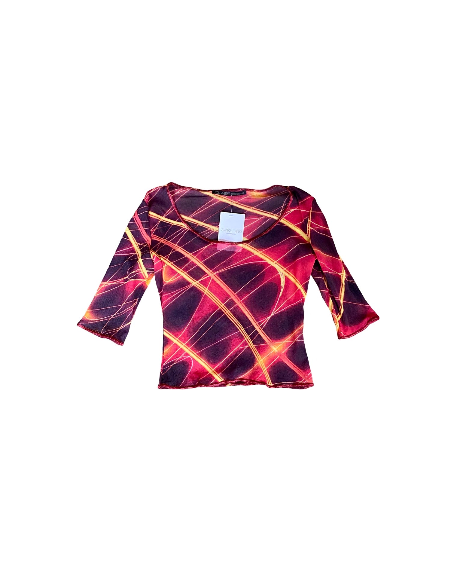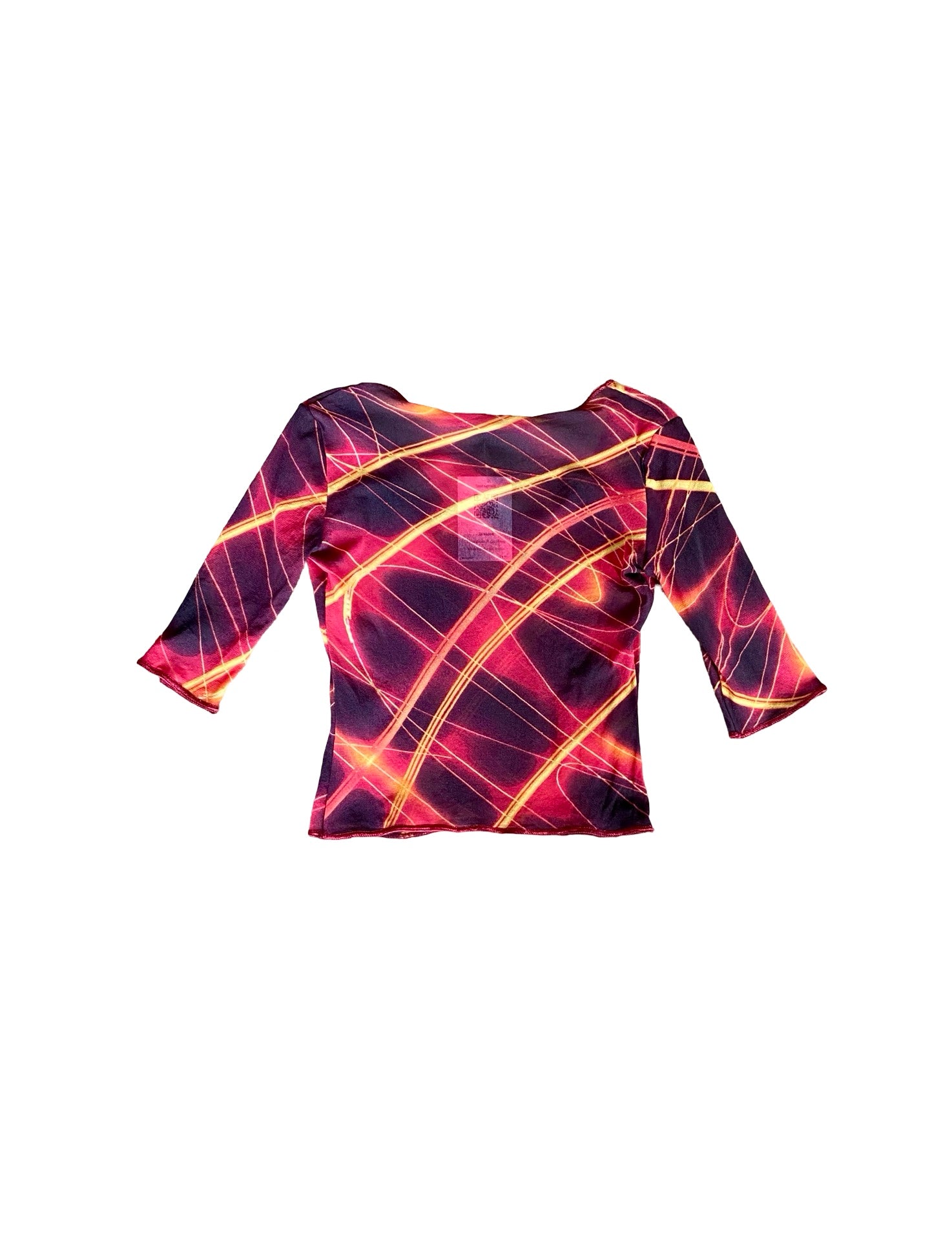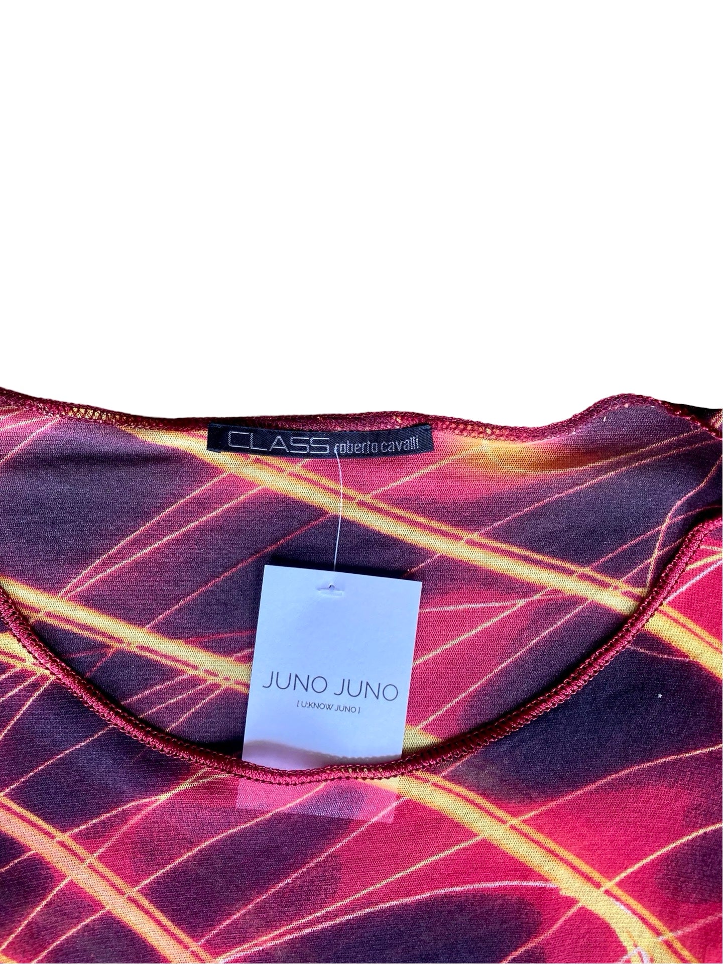 Class by Roberto Cavalli. Vibrant top with neon light print. Wide neckline, above elbow sleeve, thin mesh fabric.