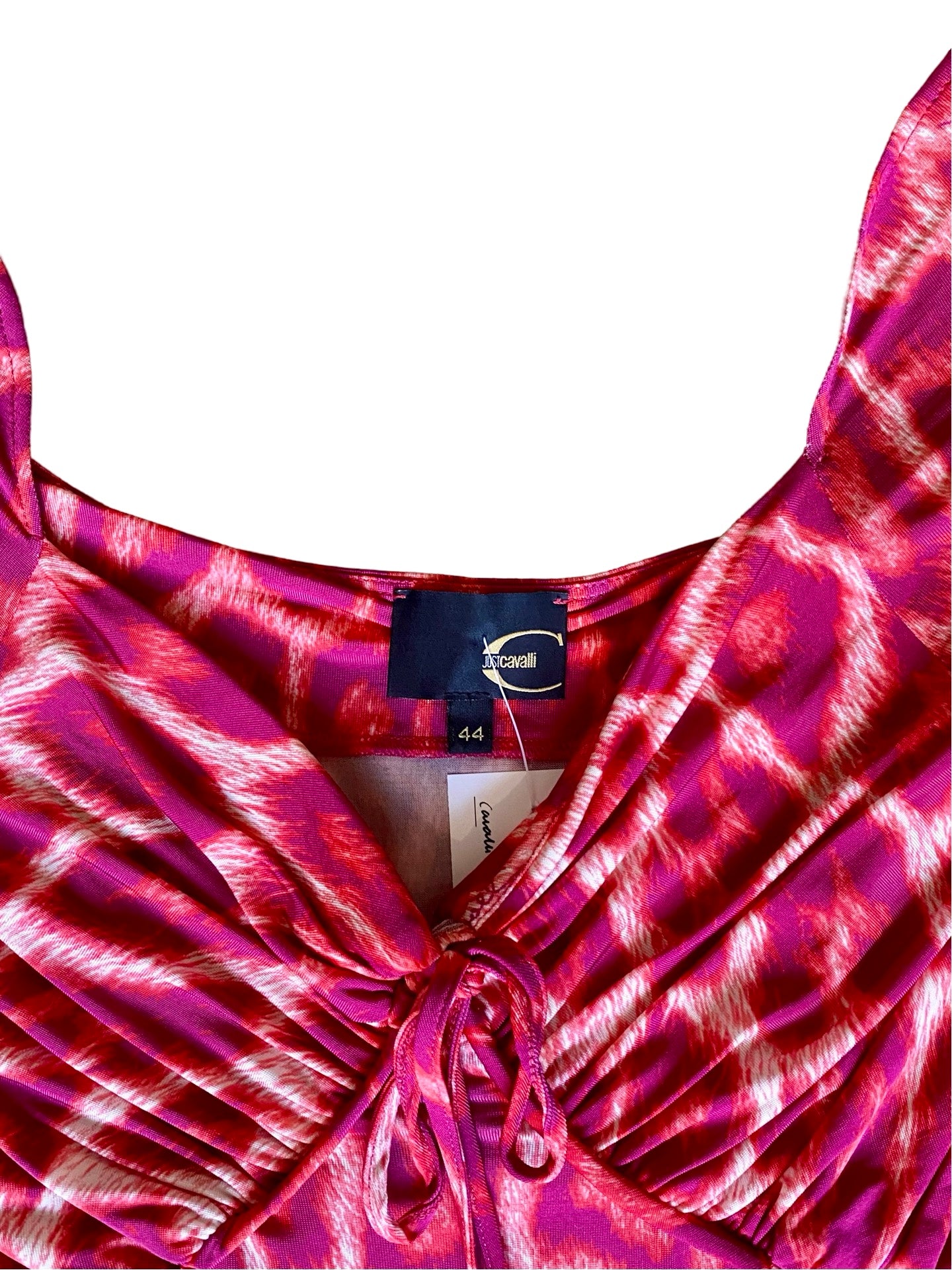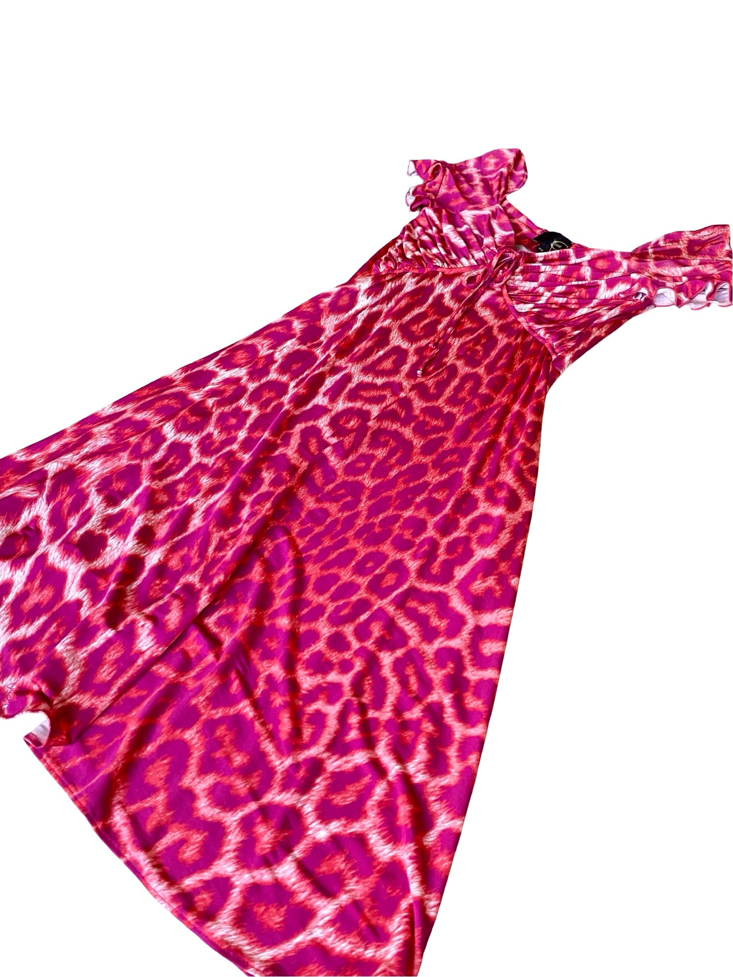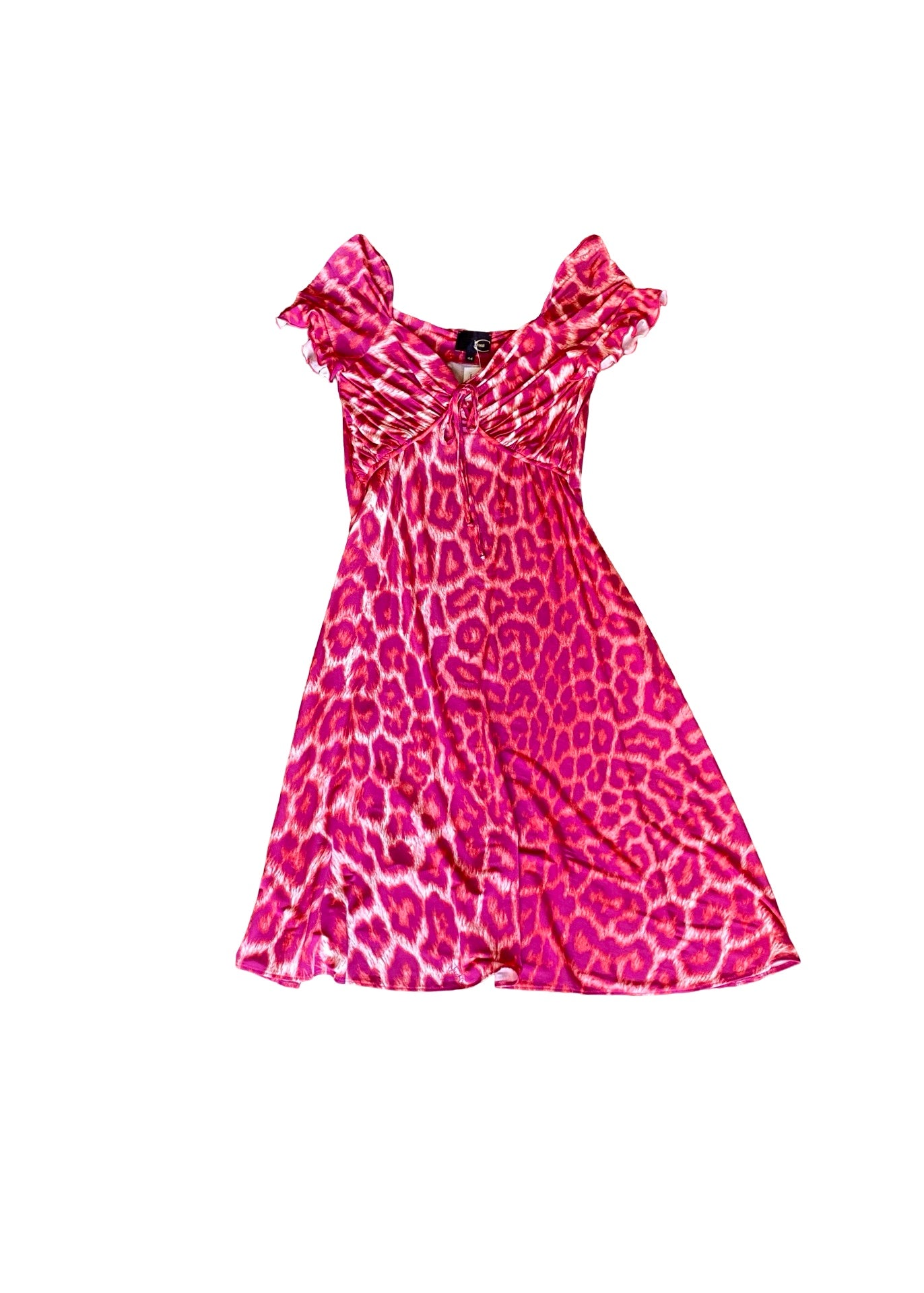 Just Cavalli strawberry pink cheetah dress. Cute strap with bow in the neckline, draped over bust, short flounce sleeves. Stretchy material. Cute and comfy!