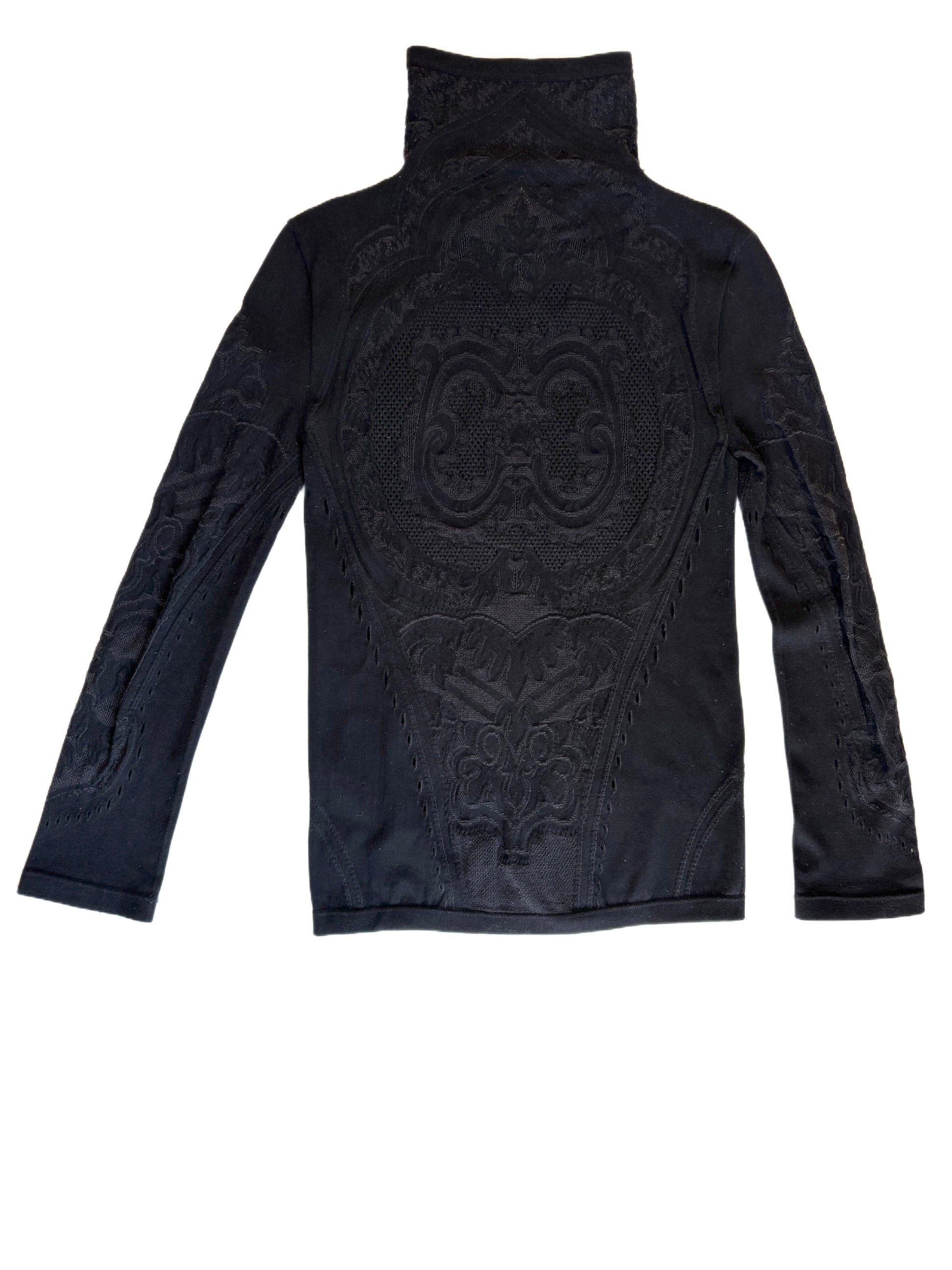 This vintage CLASS Roberto Cavalli turtleneck is a masterpiece in texture and shape. Featuring intricate embroidery that mimics a corset structure, it sculpts the silhouette with a refined edge. The body-hugging fit and high neck make it perfect for pairing with anything from denim to satin skirts. A striking piece from Cavalli’s more conceptual era.