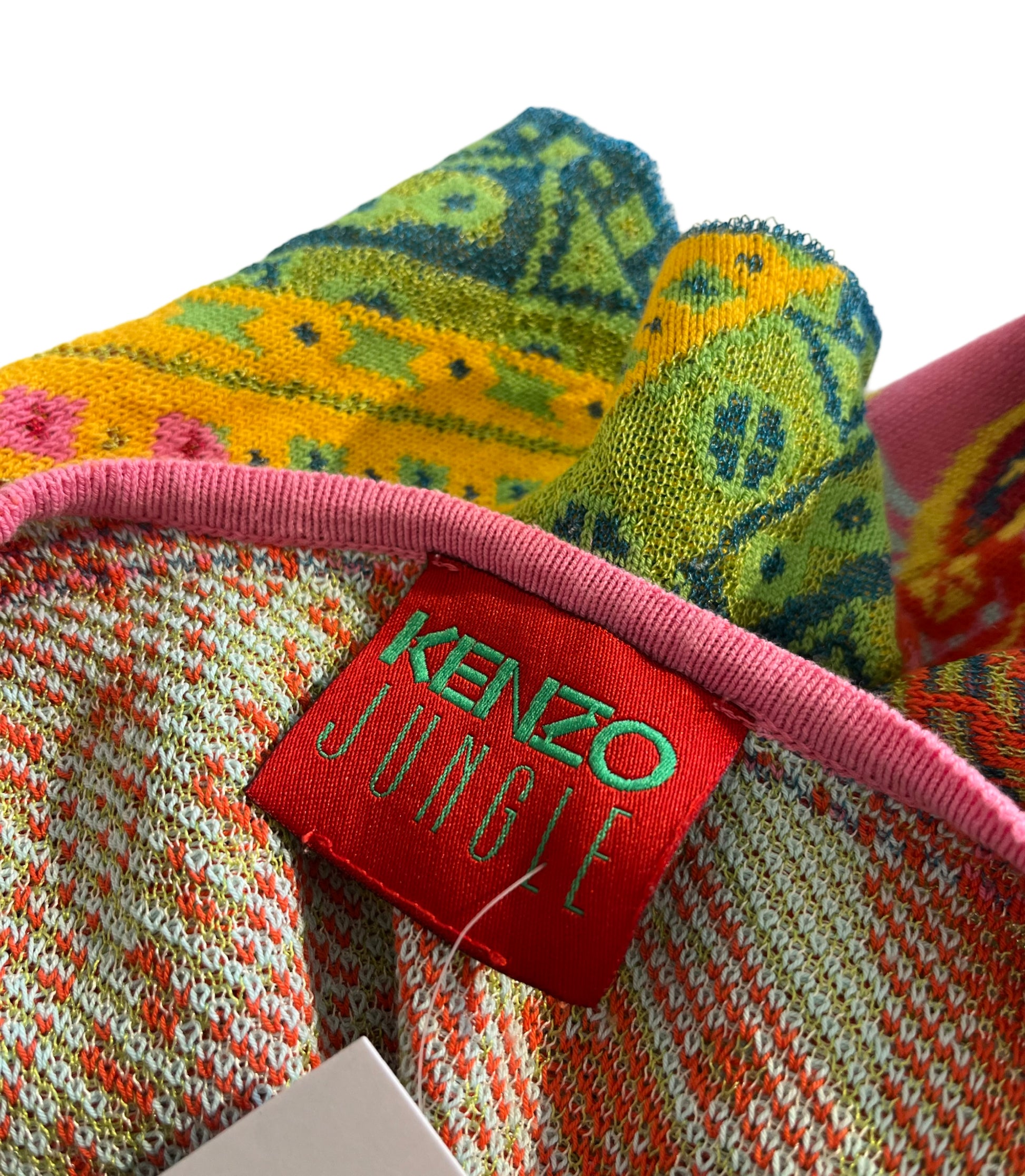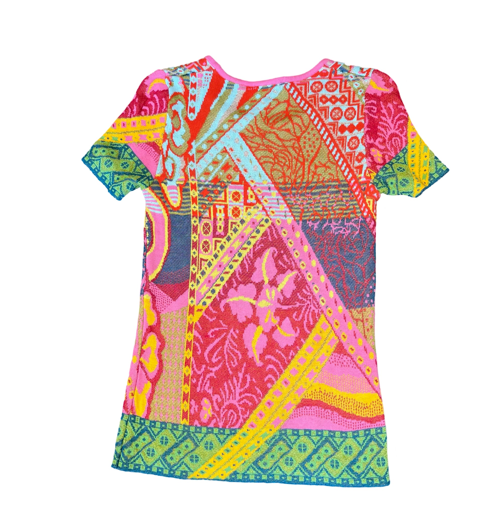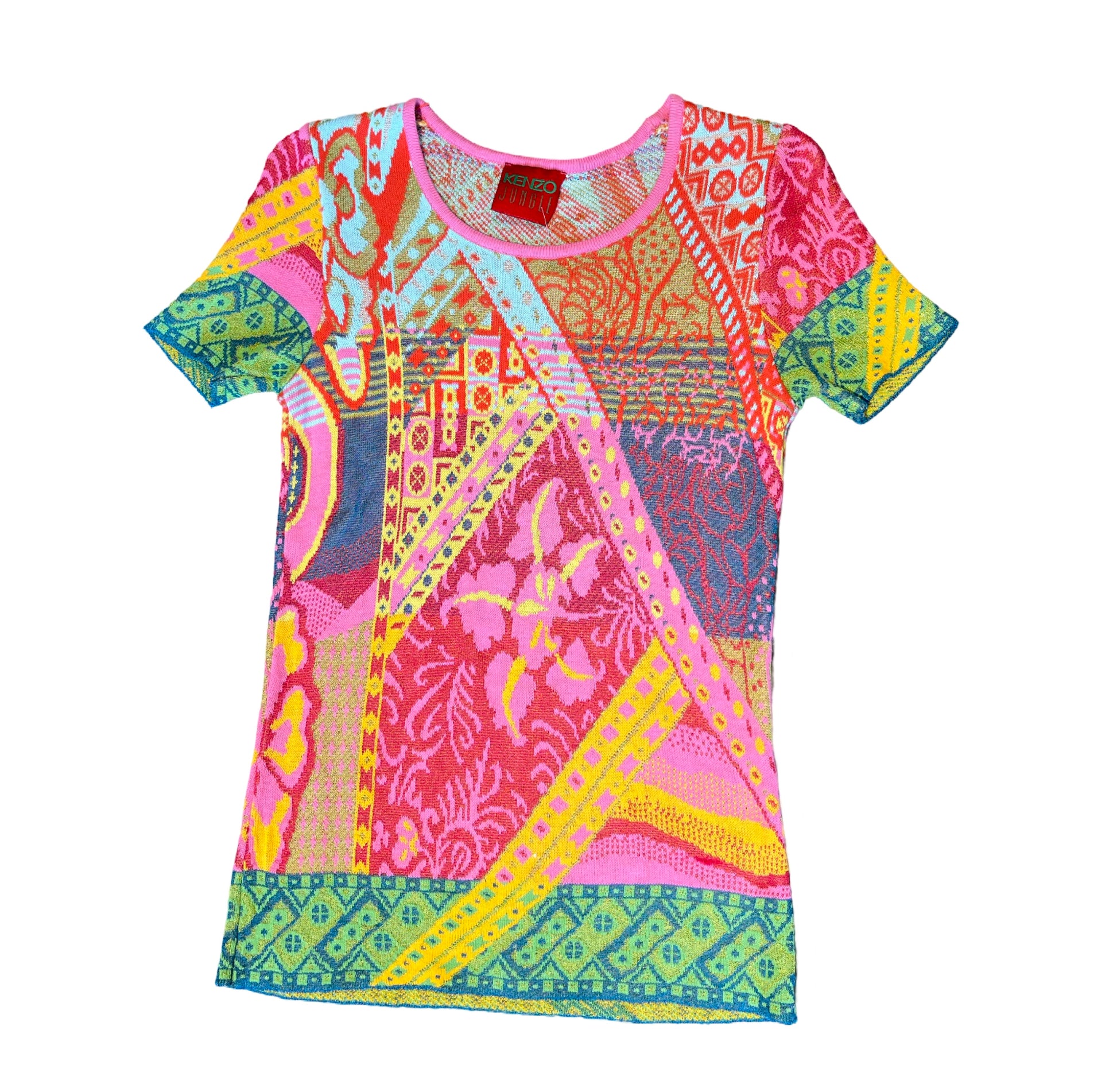 Colorful finely knitted Kenzo top with different patterns. Shades of pink, blue, green, yellow and orange. Short sleeves.