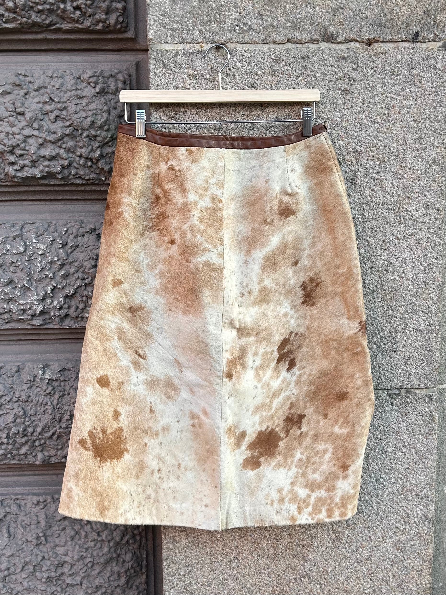 A beautiful midi skirt in beige and brown colors with a brown leather hem in the waist. Closes with zipper and button in side.