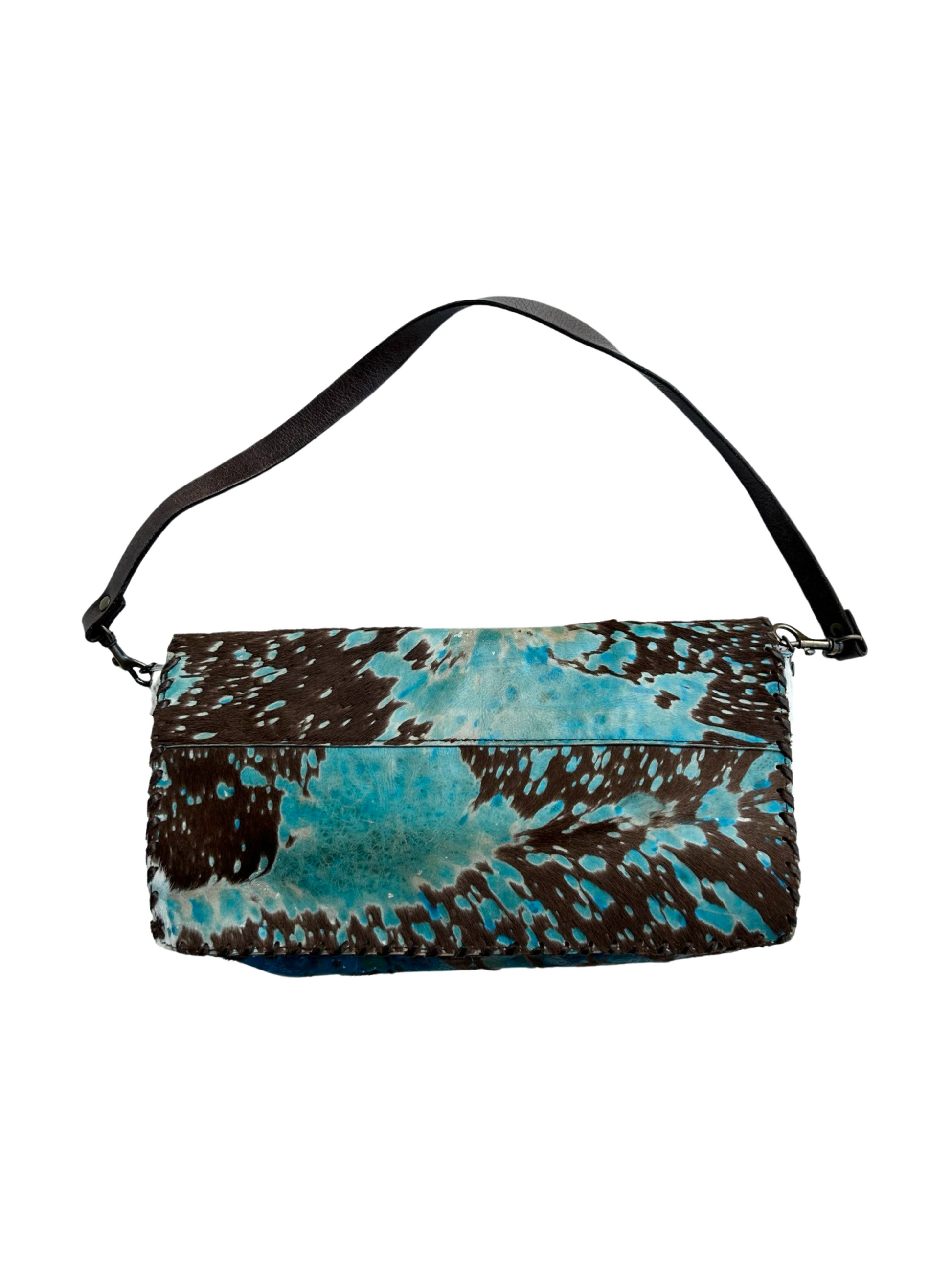 This bag has a detachable strap so you can wear it as both a shoulder bag and as clutch bag! Made in beautiful painted cows skin in the colors turquoise, white and brown.