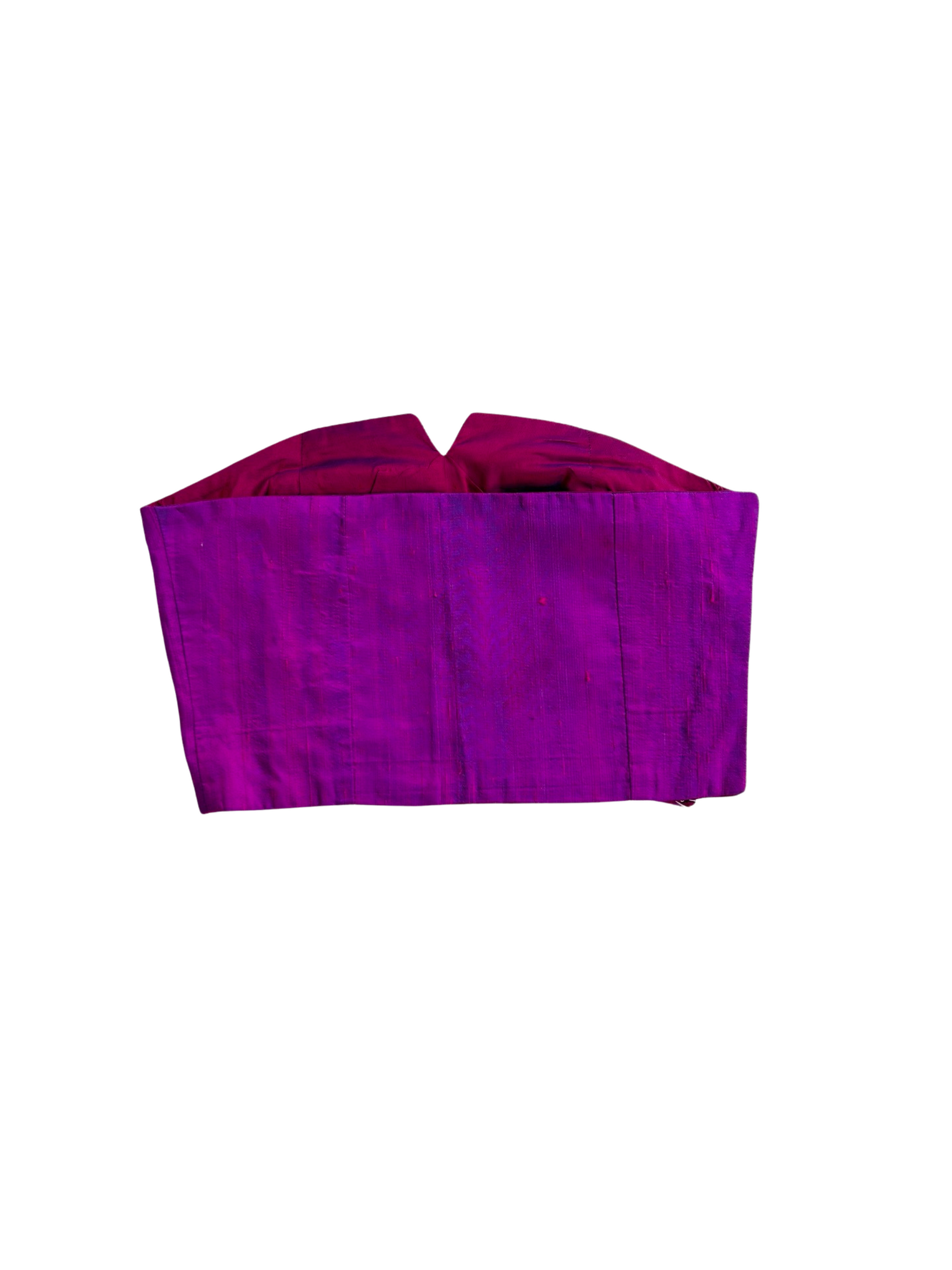In the most amazing shifting color of purple and fuchsia pink. Cropped fit and with corset snaps on side.