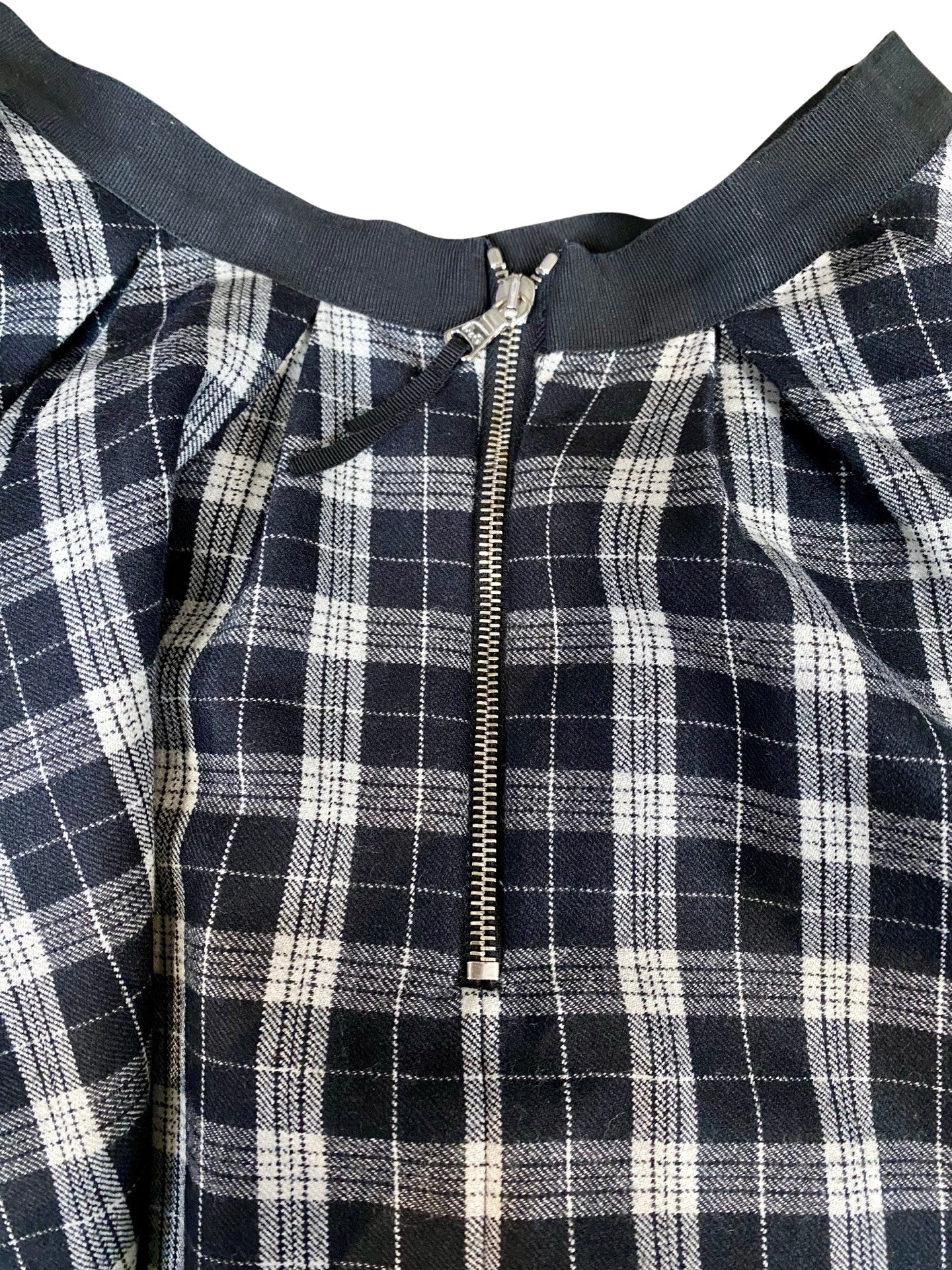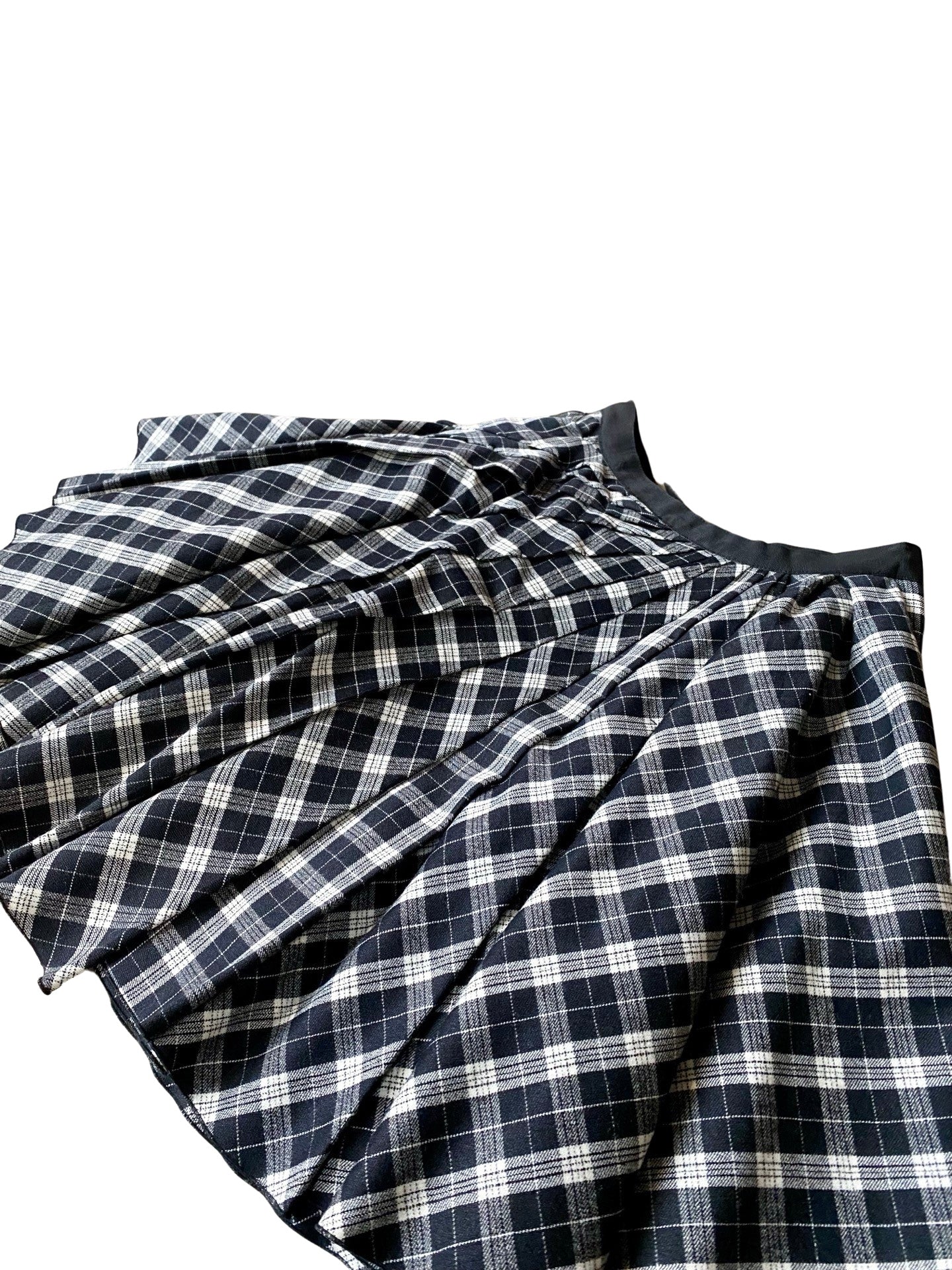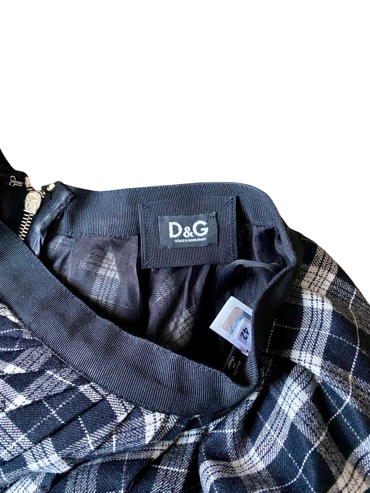 Dolce & Gabbana pleated wool skirt with a black and white plaid pattern. Soft and sheer black silk lining. The perfect mix between timeless and trendy. Asymmetrical pined down pleated pattern and volumes of fabric gives this skirt its unique look.