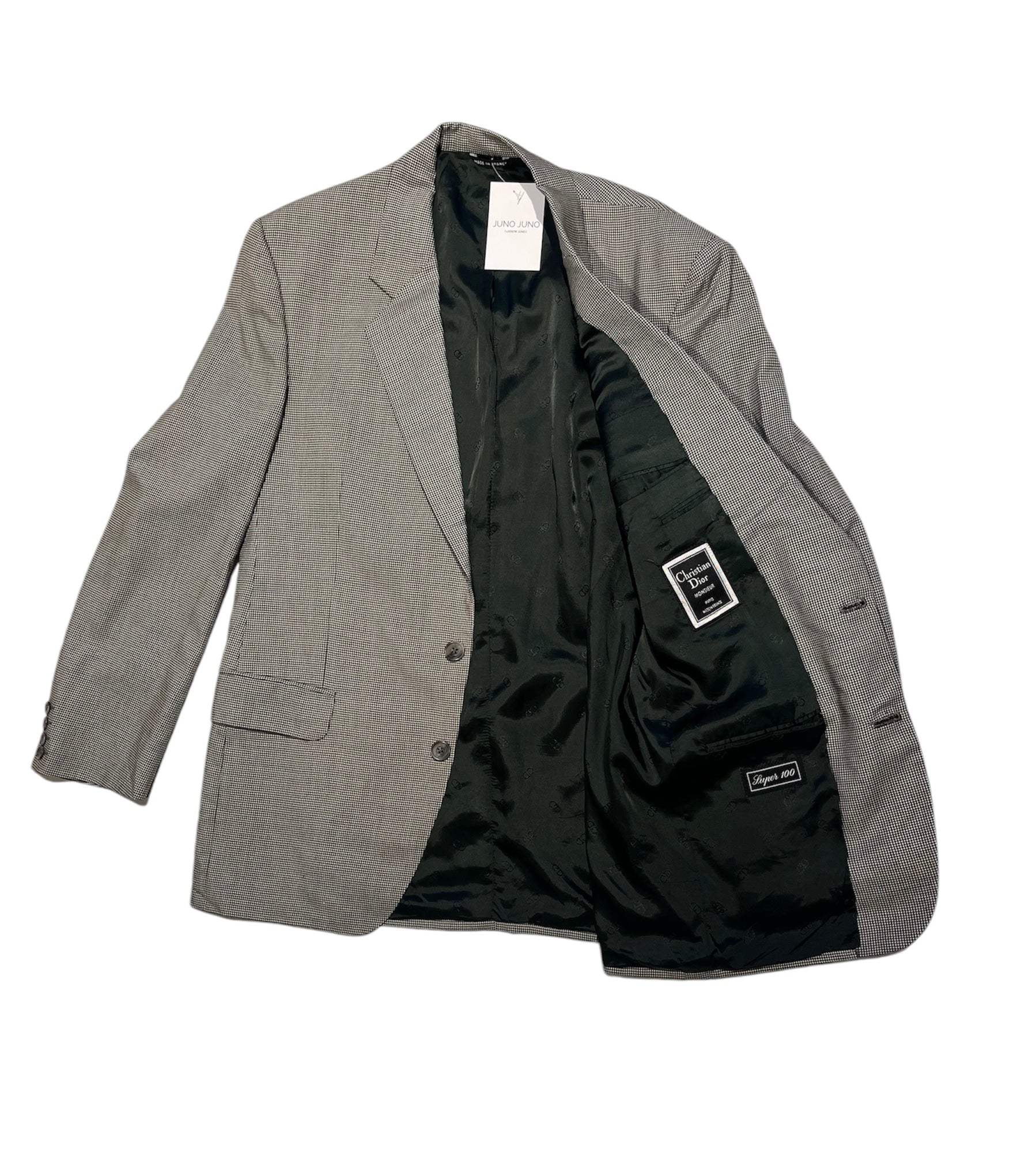 A classic black and white checkered blazer signed Dior. Two front pockets and one smaller breast pocket, with buttoned details and two buttons in the front to close. Smaller hidden pockets on the inside of the blazer. This blazer also has shoulder pads for a cool, boxy look.