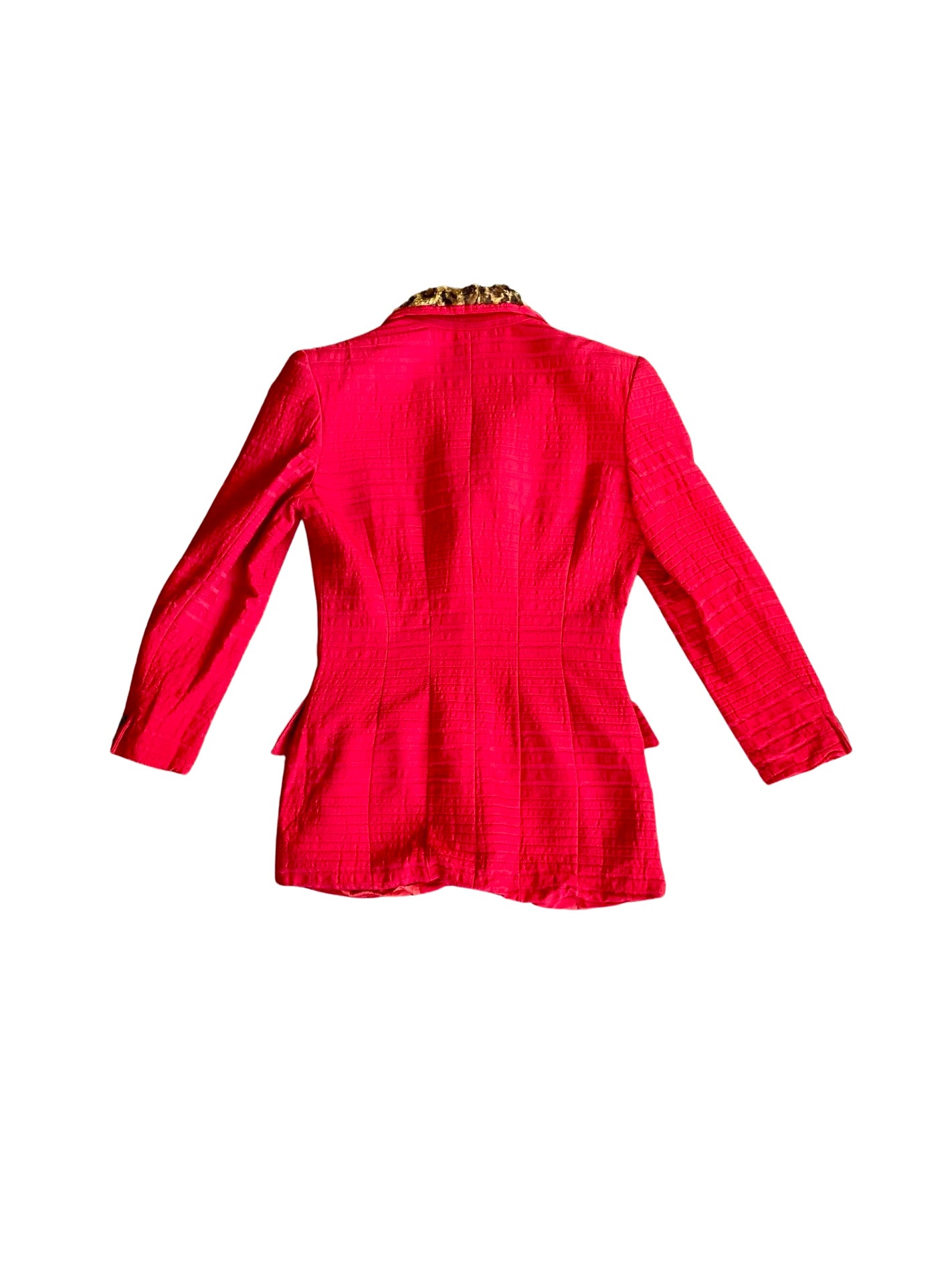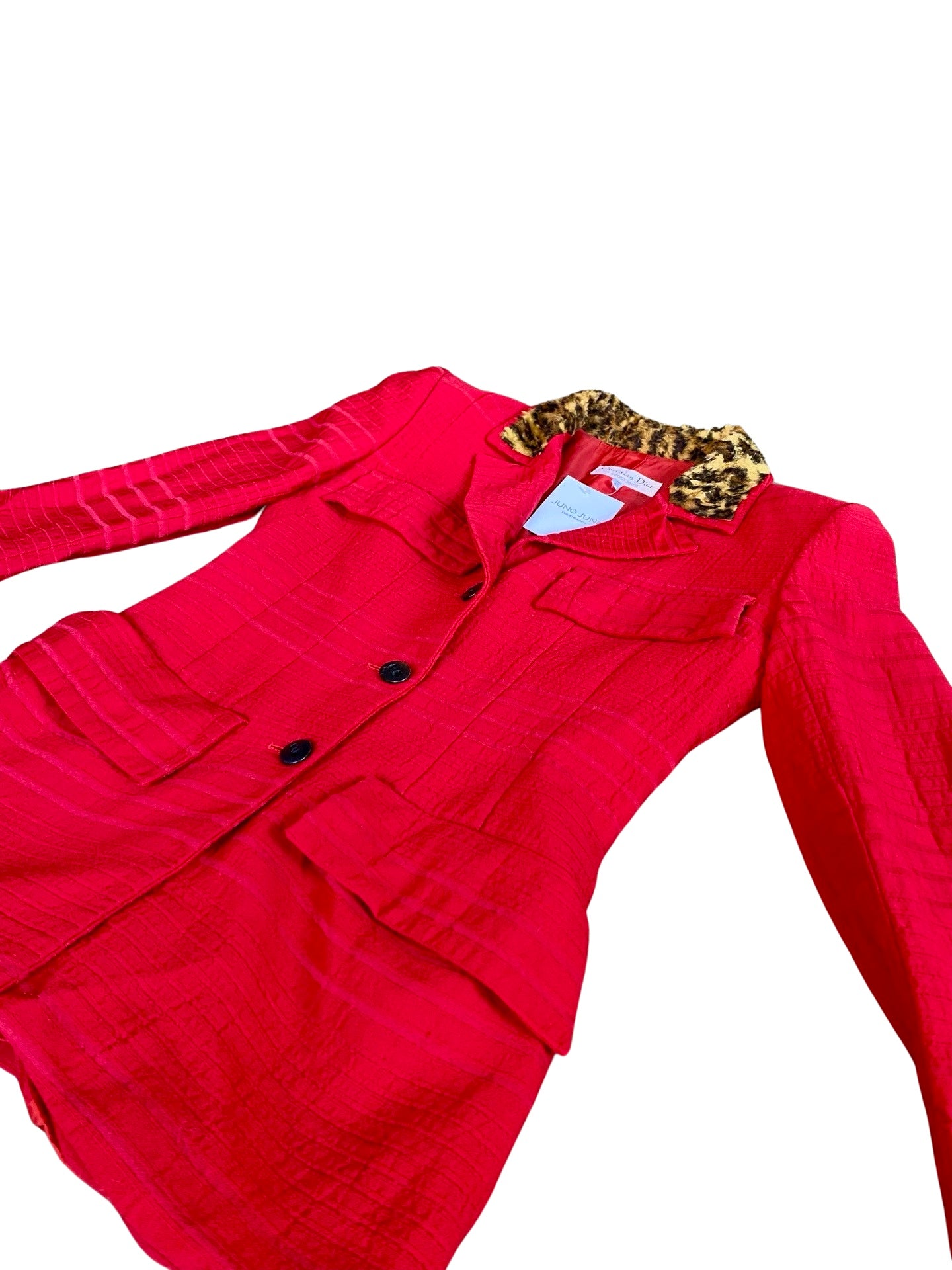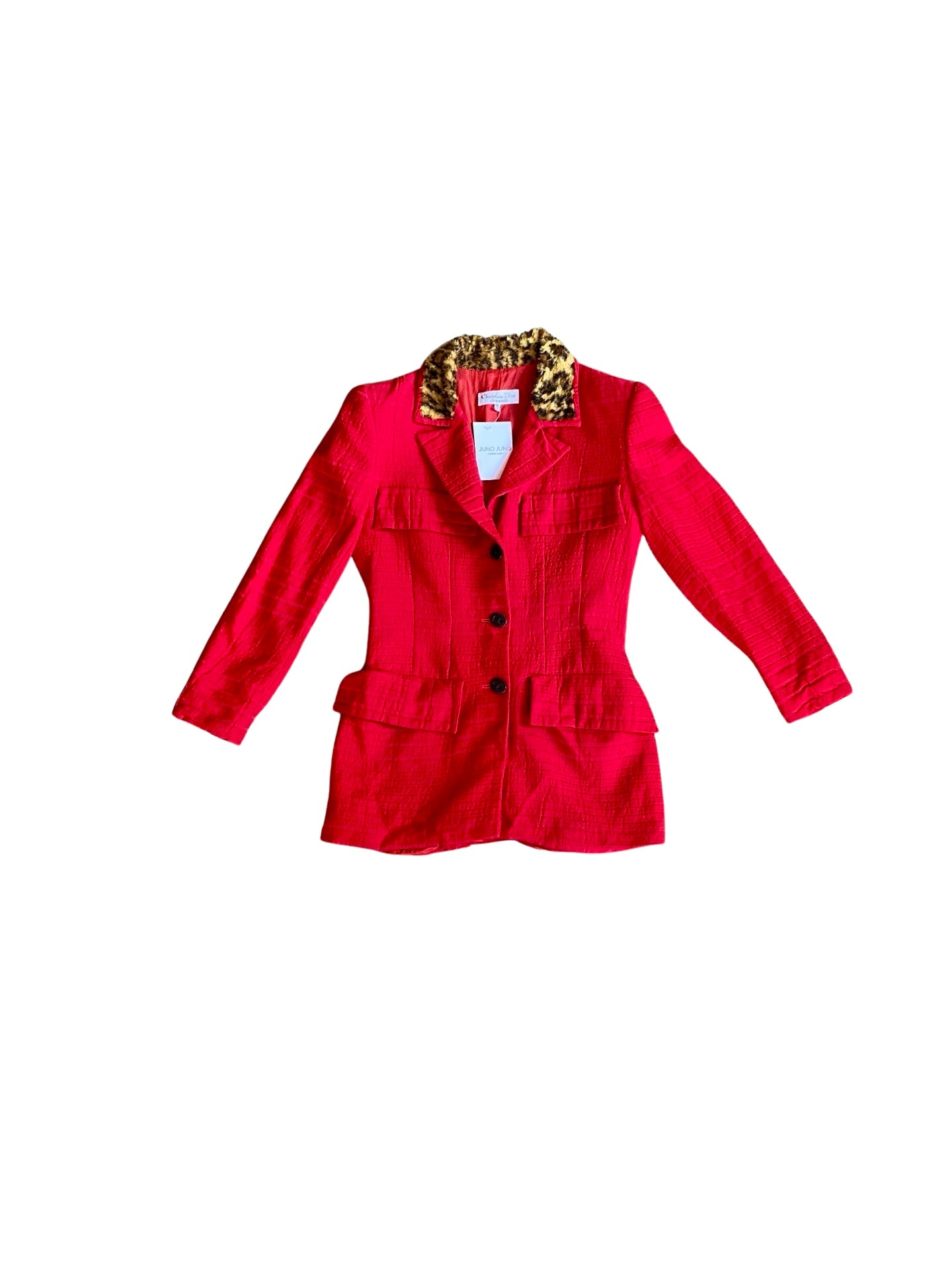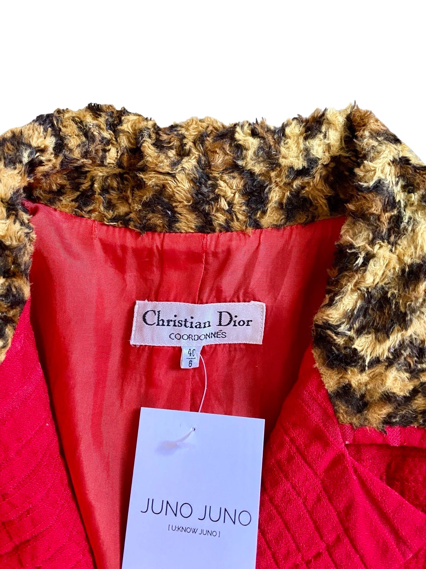 This bright red Christian Dior blazer has a fitted design and a fluffy animal printed collar. Horizontal stripes and thick shoulder pads. This blazer is the definition of luxury vintage, giving us dressy 80´s vibes.