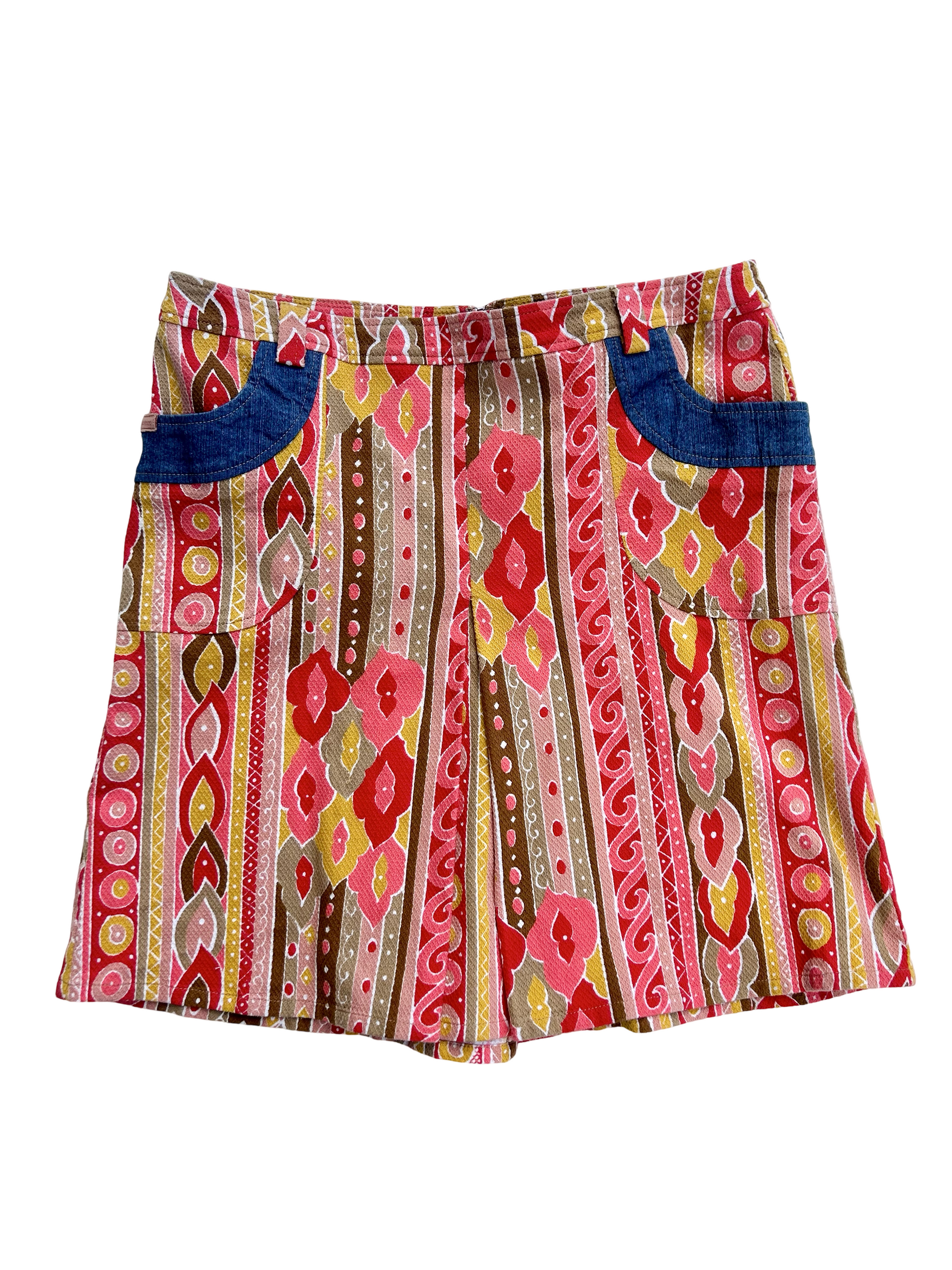 Gorgeous mini skirt by Dolce & Gabbana in a beautiful structured fabric full of colors with denim details and brown leather tag with D&G.