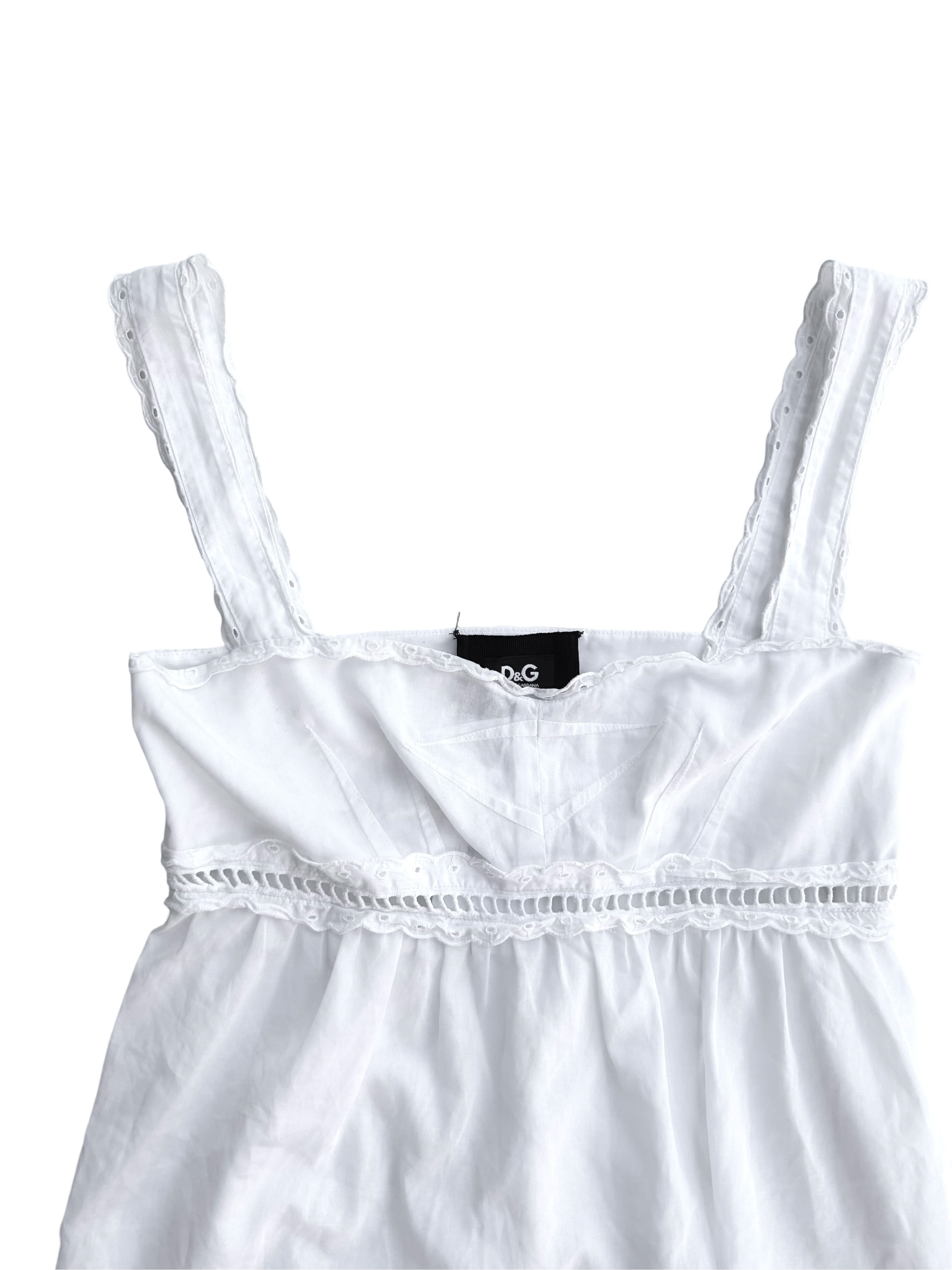 An A lined design with broad shoulder straps and bardot design around chest area for a romantic and flattering fit. A soft and light fabric and lace details. Zipper on side.