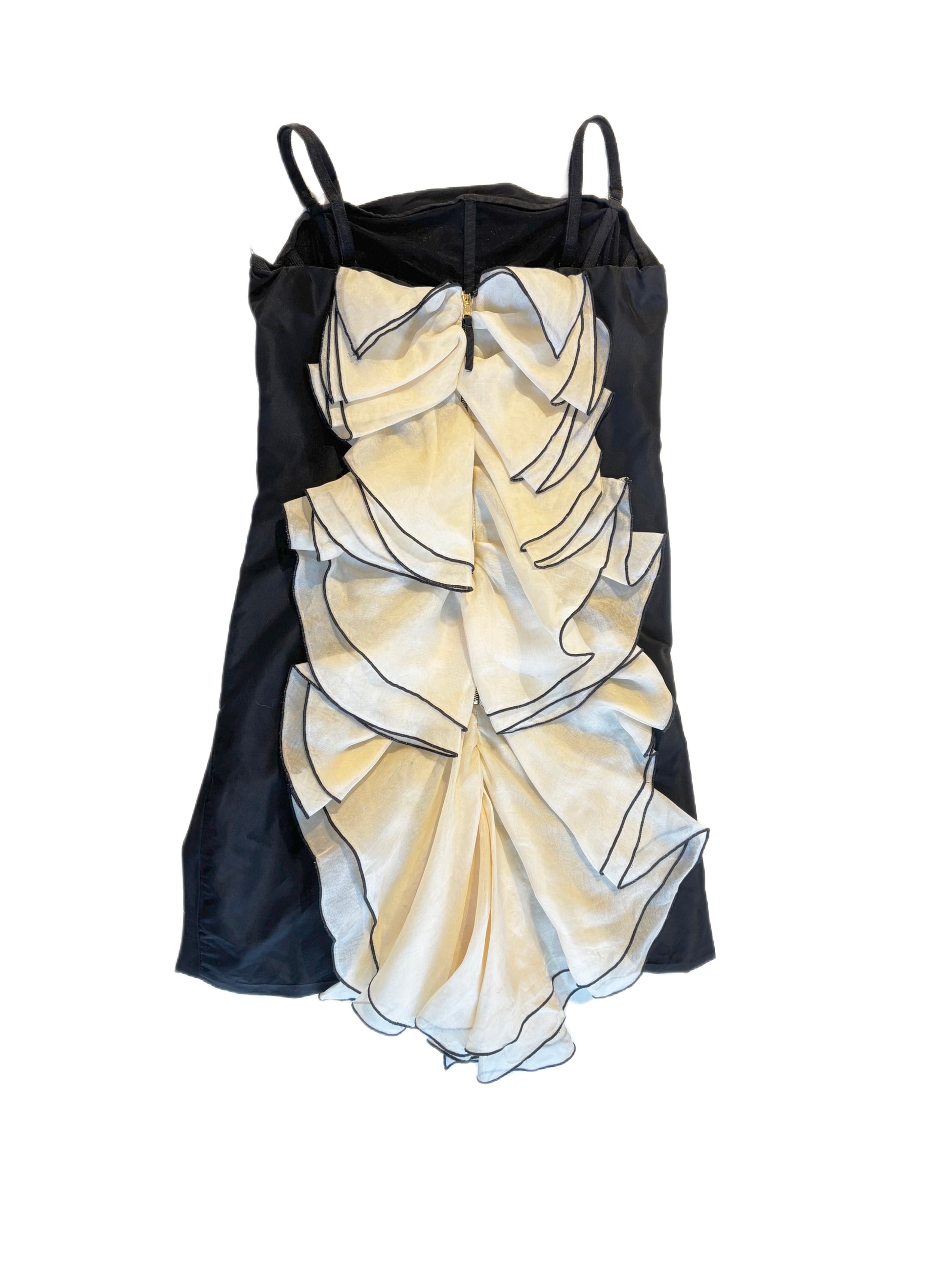 A true Dolce & Gabbana statement — this mini dress blends romance and structure. Crafted in silk with a black body and cascading cream ruffles, it embodies the house’s signature mix of sensuality and softness.