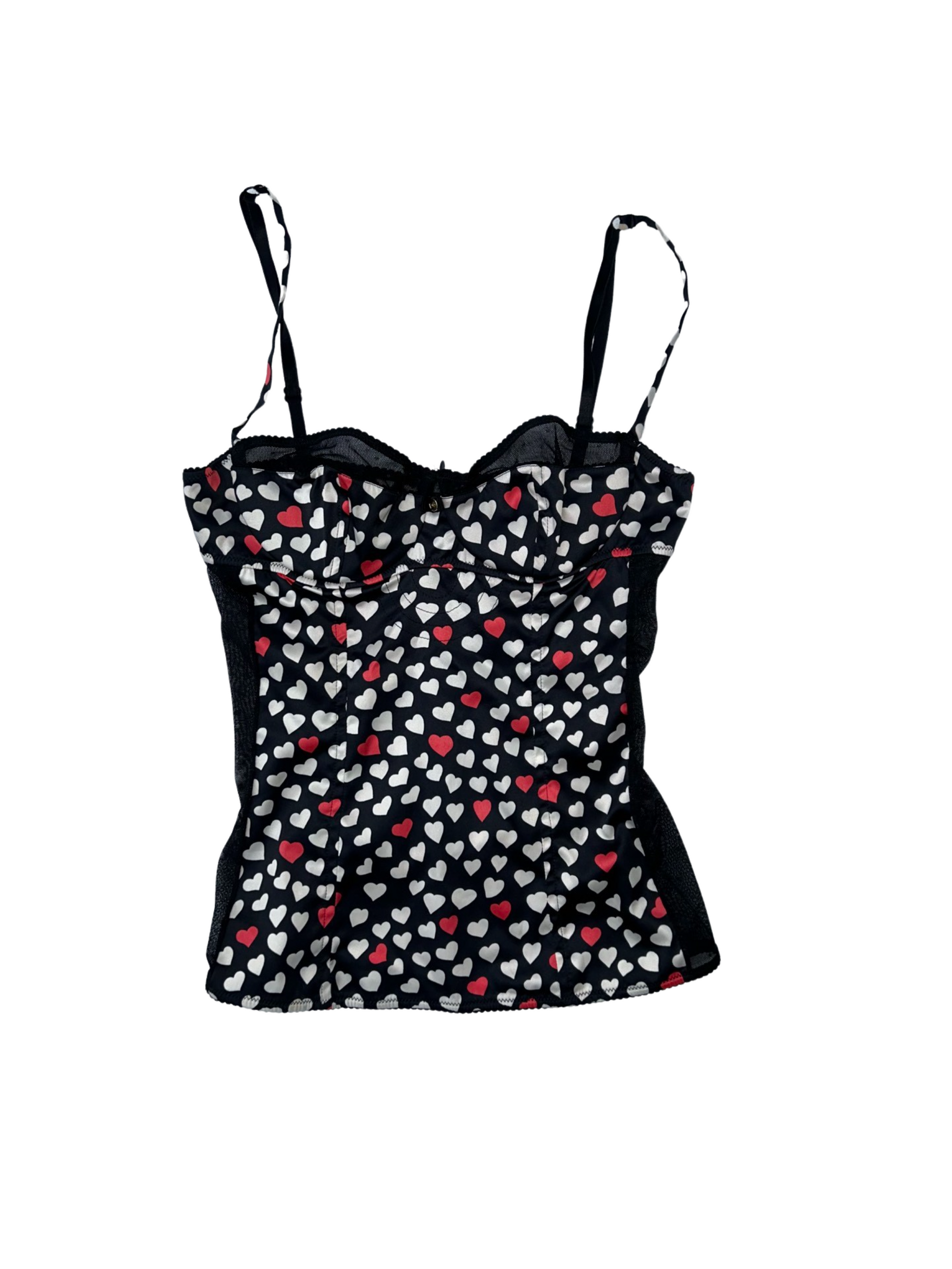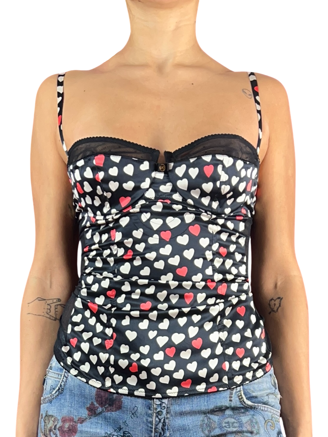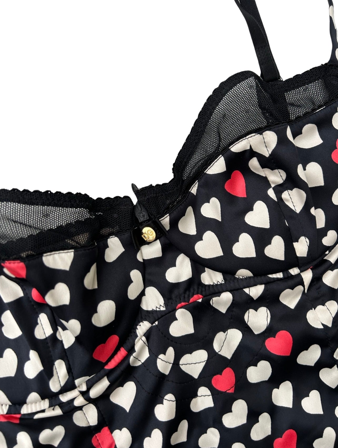 Dolce & Gabbana 2000’s black heart bustier corset. This rare bustier top made with stretch satin-like material is flattering and flirtatious.