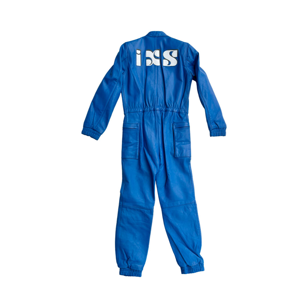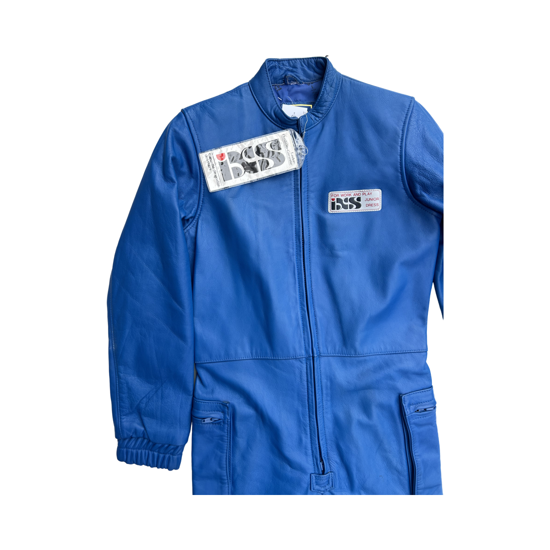 A unique vintage jumpsuit in electric blue leather, full racer core. A slightly lined jumpsuit with light padding on shoulders. Original tag still attached.