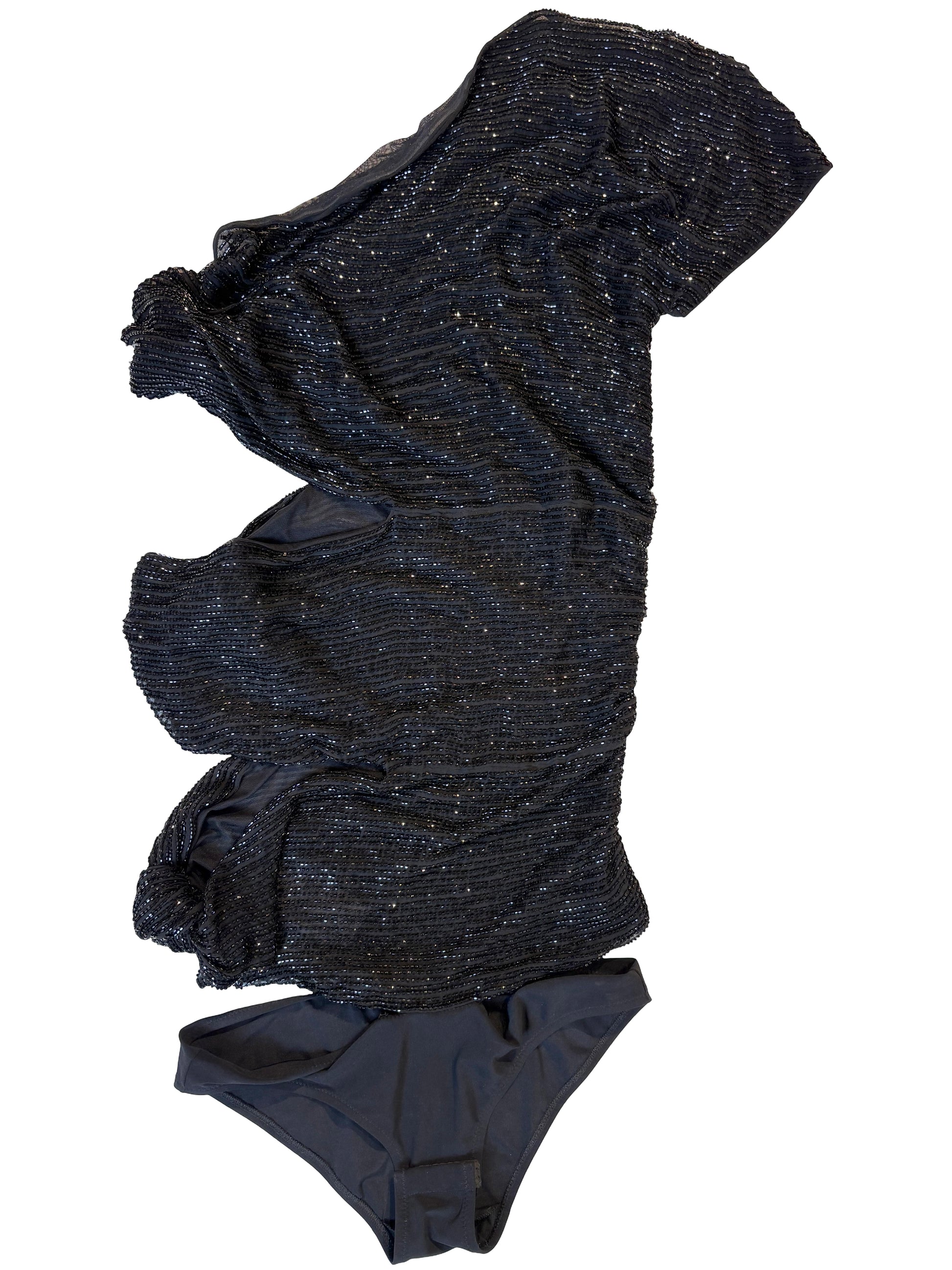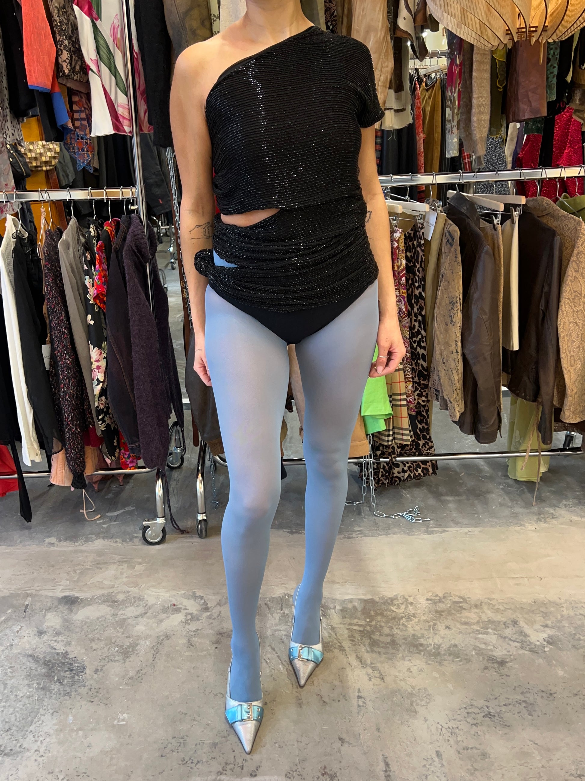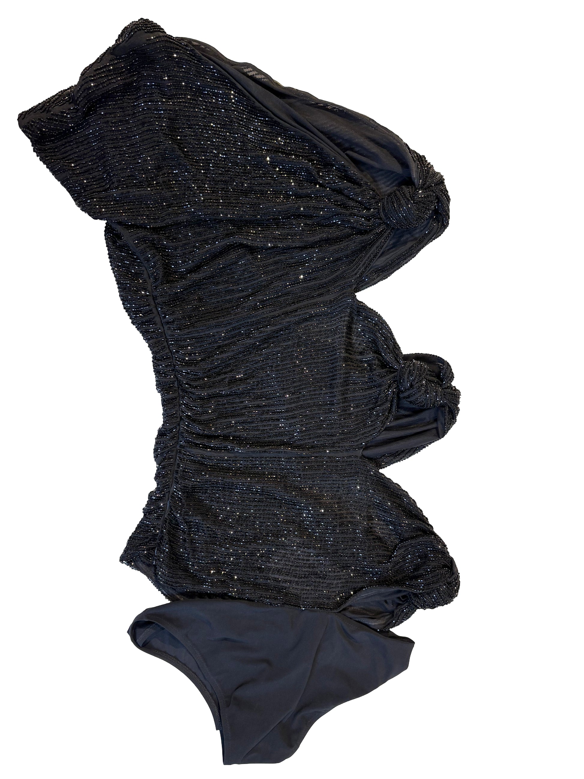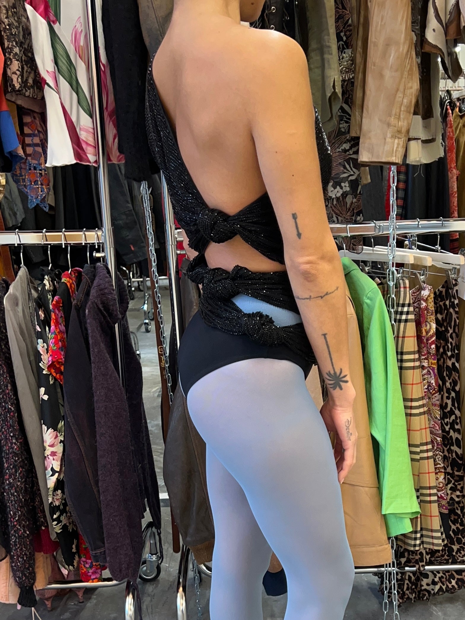 This heavy dramatic black bodysuit features sparkling bead embellishments and strategic cutouts that sculpt the waist and hips. A rare statement piece with glamorous ’80s undertones, ideal for evenings out or styled under blazers for contrast. One-shoulder design with elegant draping — equally at home on stage or at an art-world opening in Milan.