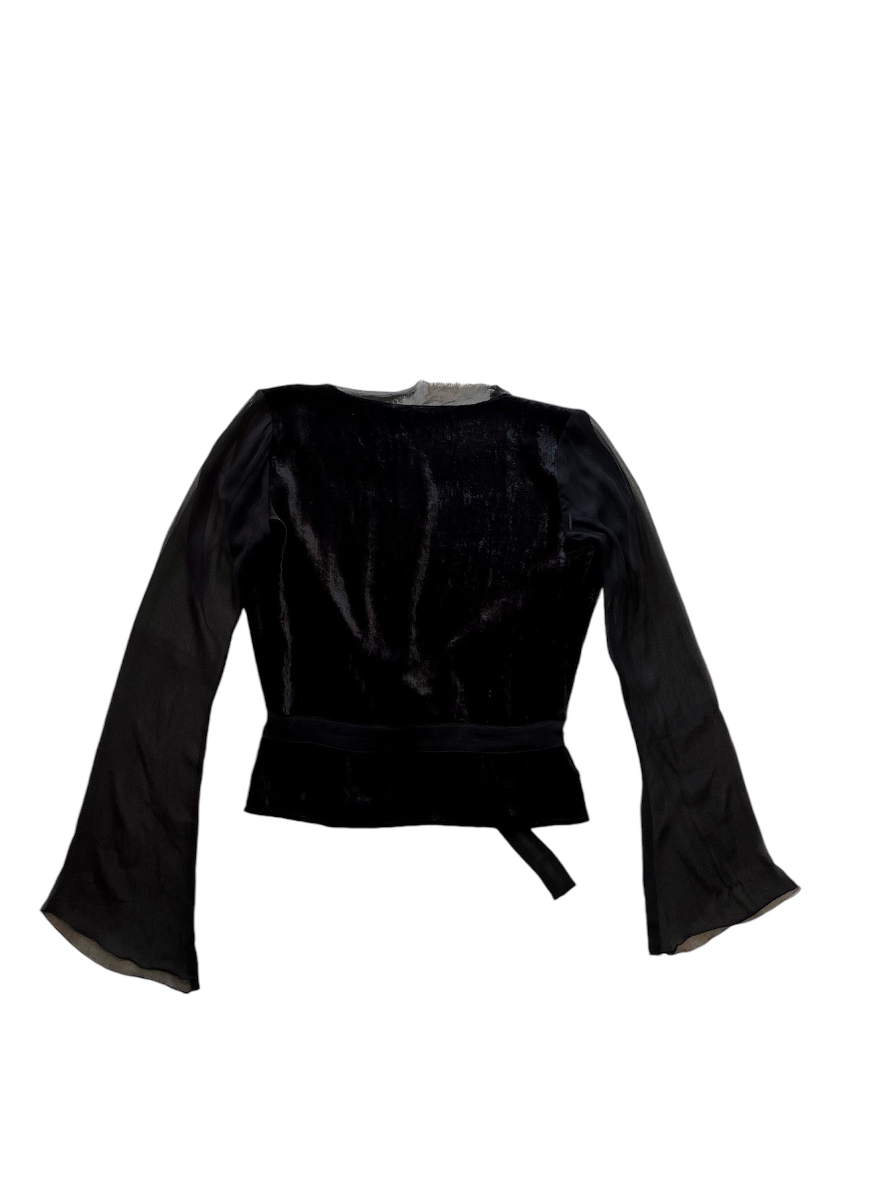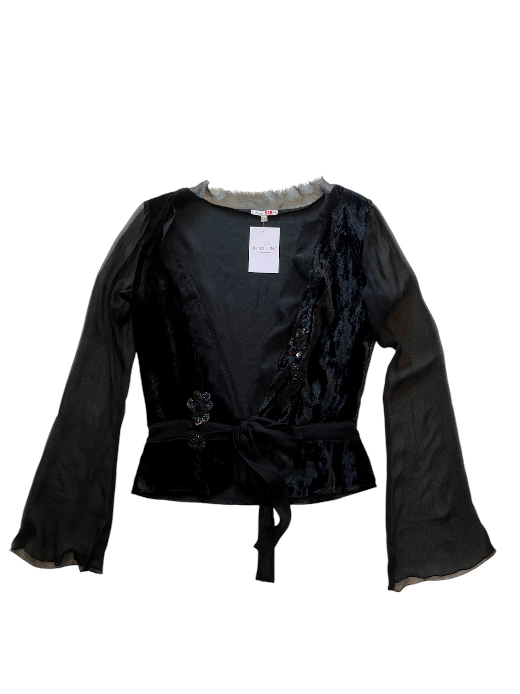 A cute blouse in a soft silk mix material. Mesh trumpet sleeves and ribbons to tie. Embroidered flowers in the front, embellishment with purple sequins.