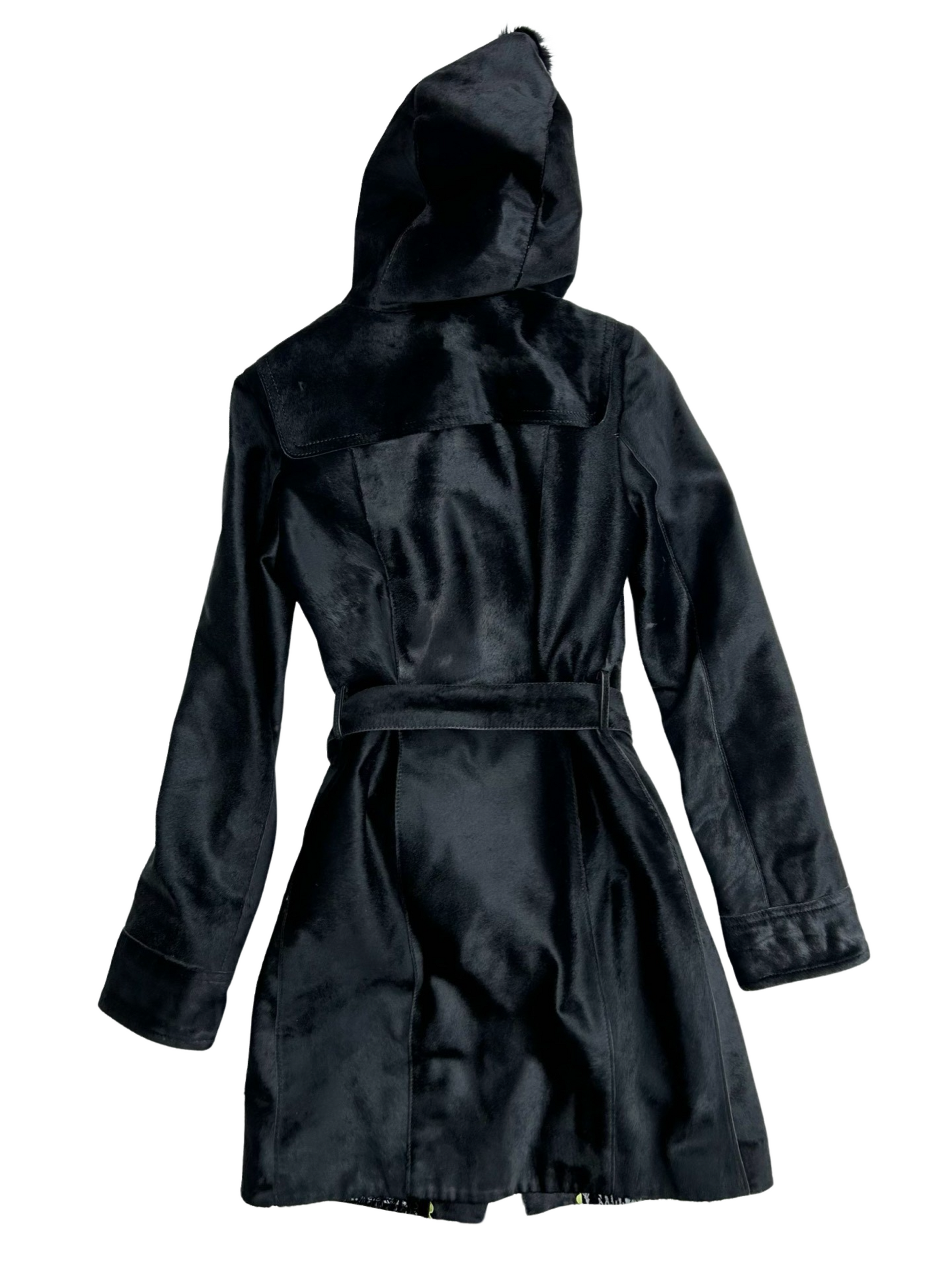 A luxurious black calf leather coat by ESCADA, a fitted design with a hood lined with fur. The coat attaches with covered snap buttons in the front as well as big dark silver colored button as a beautiful detail by the décolletage. The coat has a big belt to enhance the waistline and pockets in the front.