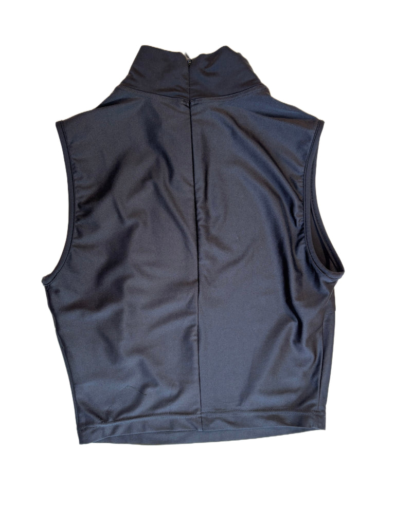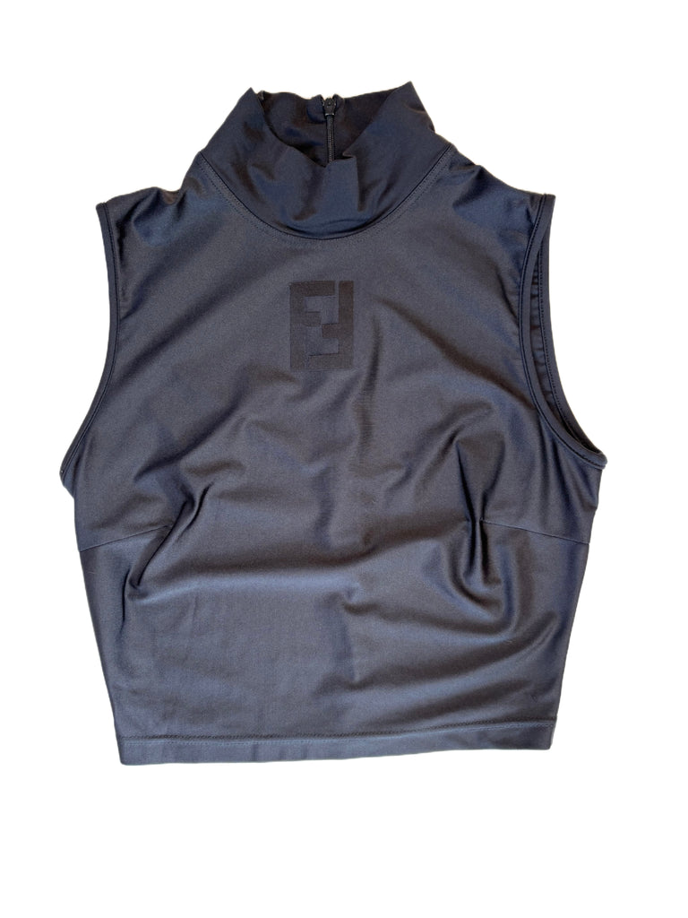 This futuristic sleeveless top by Fendi is a masterclass in minimalist tailoring with a sporty twist. Made from a structured tech jersey, it features a high funnel neck and tonal Fendi “F” logo embossing on the chest.