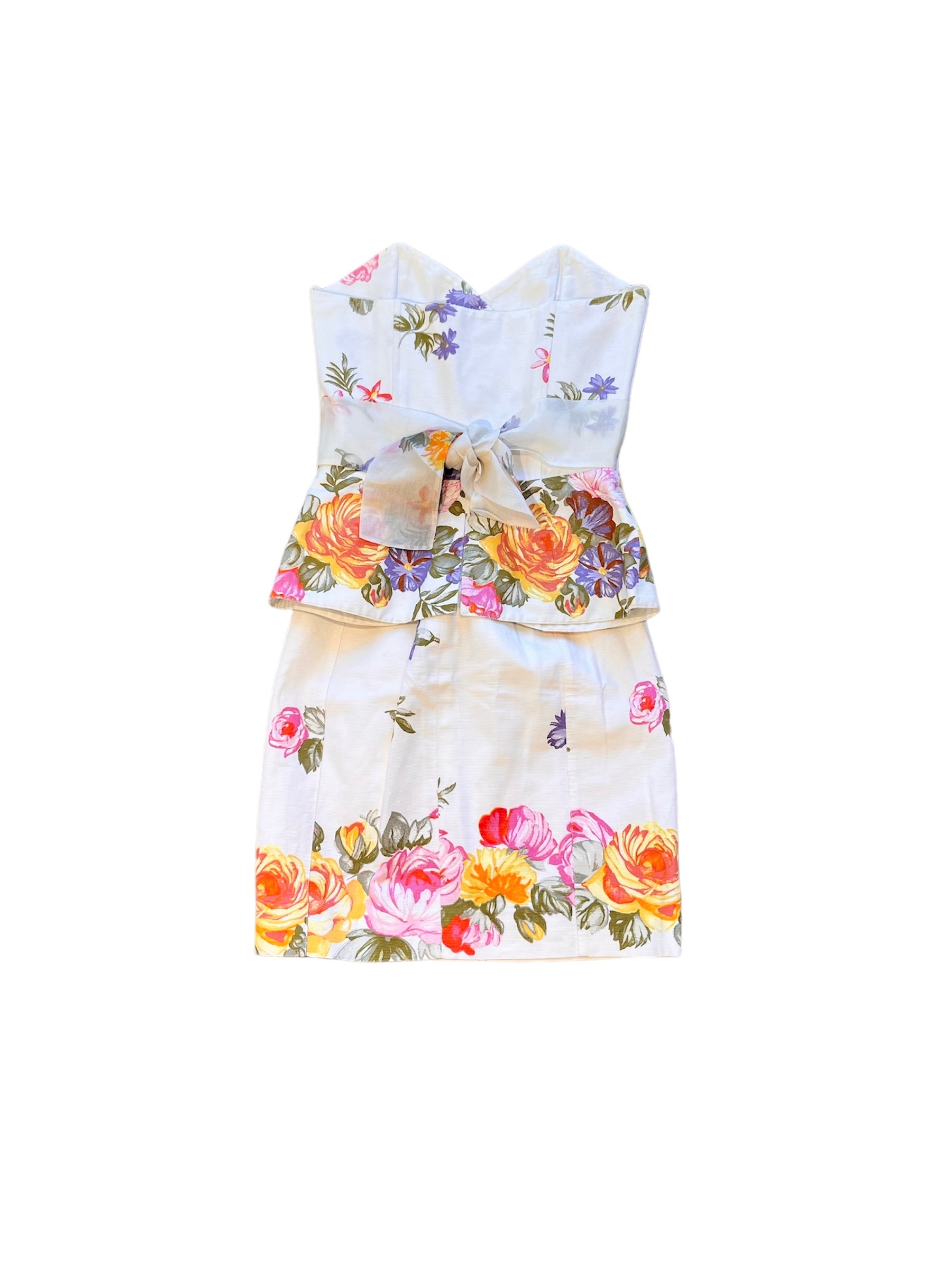 Gorgeous set signed Blumarine. Consists of a vest-like bandeau top with a matching mini skirt. Zipper on the side of the dress and the top closes with buttons in the front. Sheer ribbon detail on the back of the top.