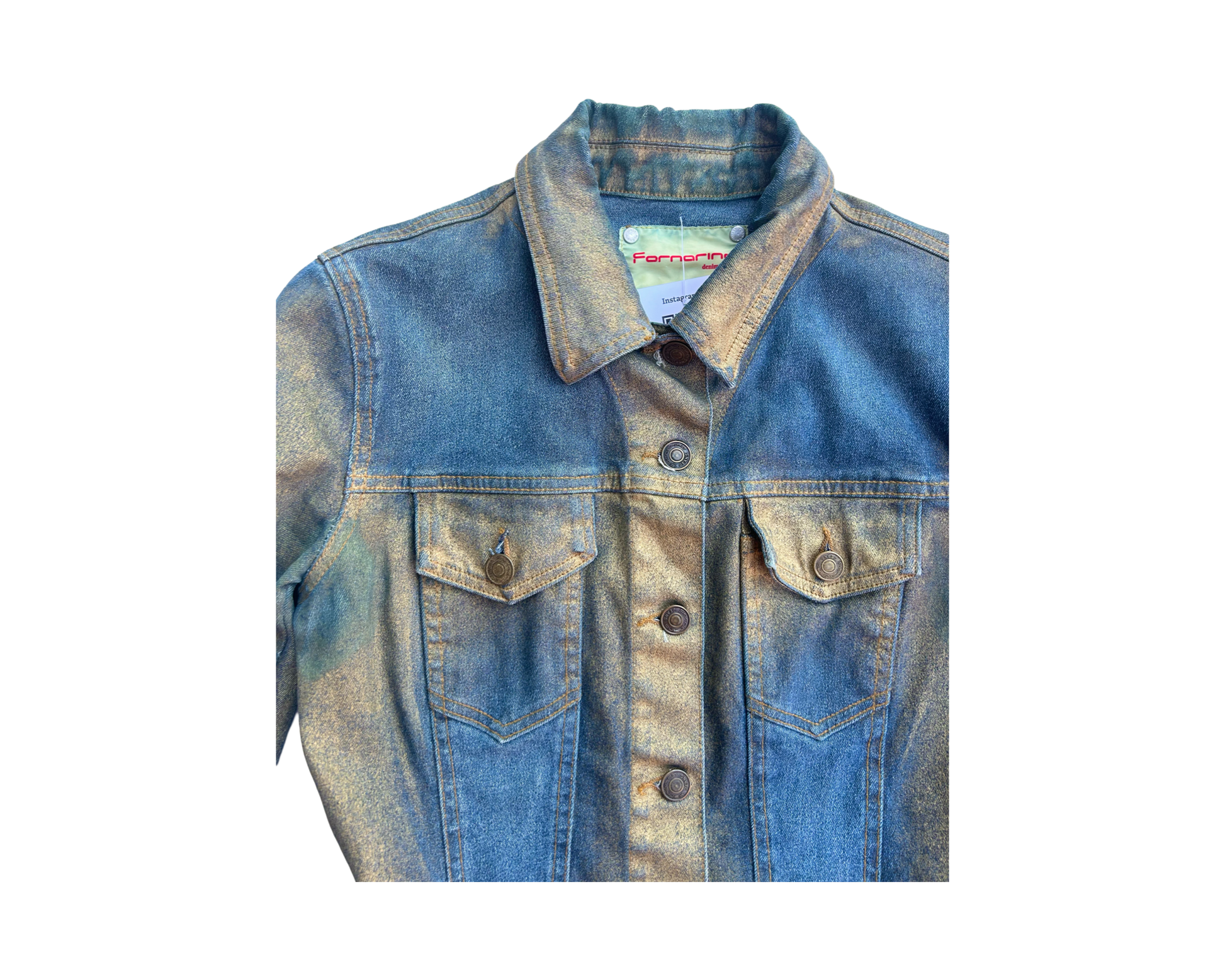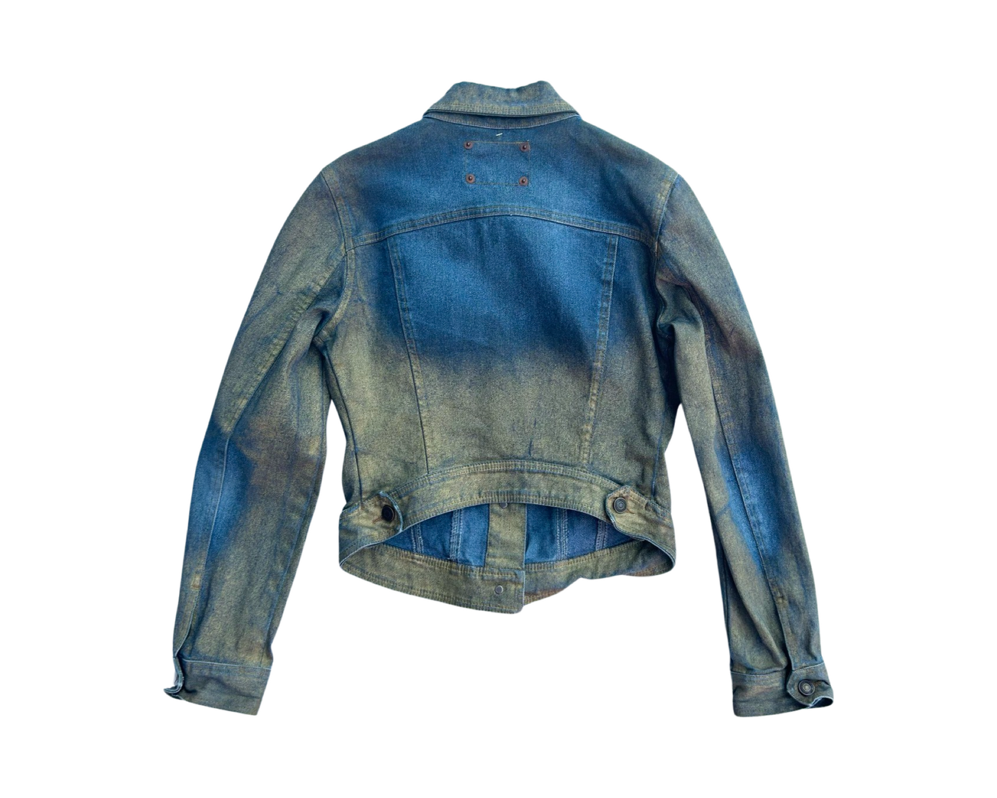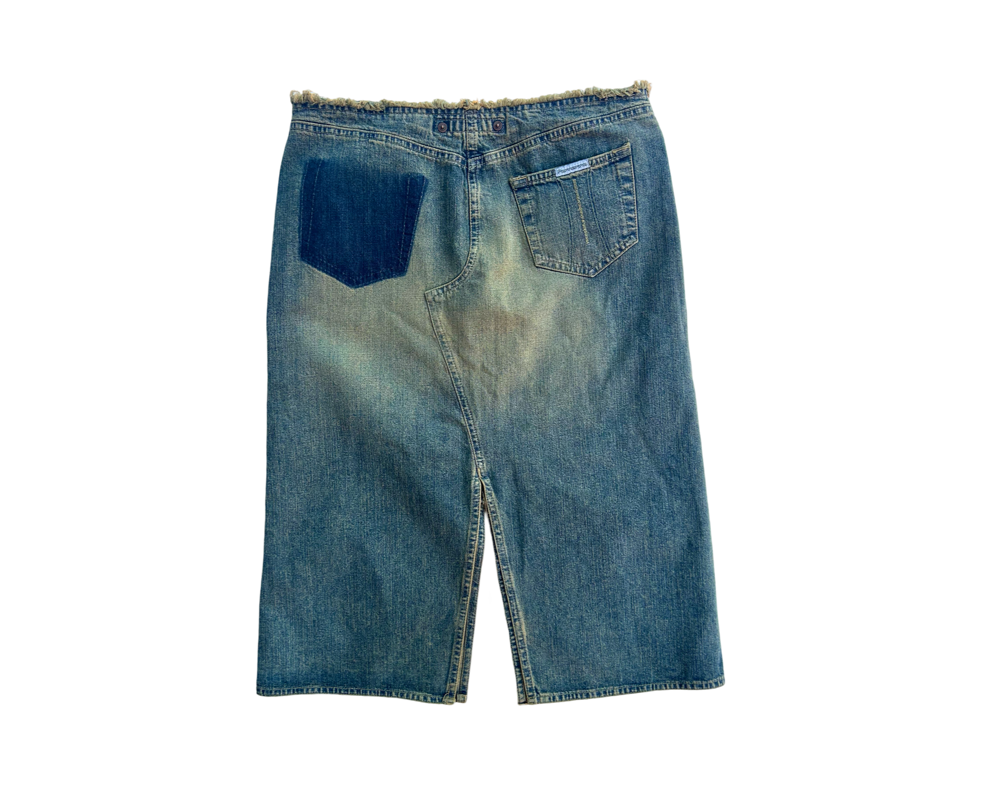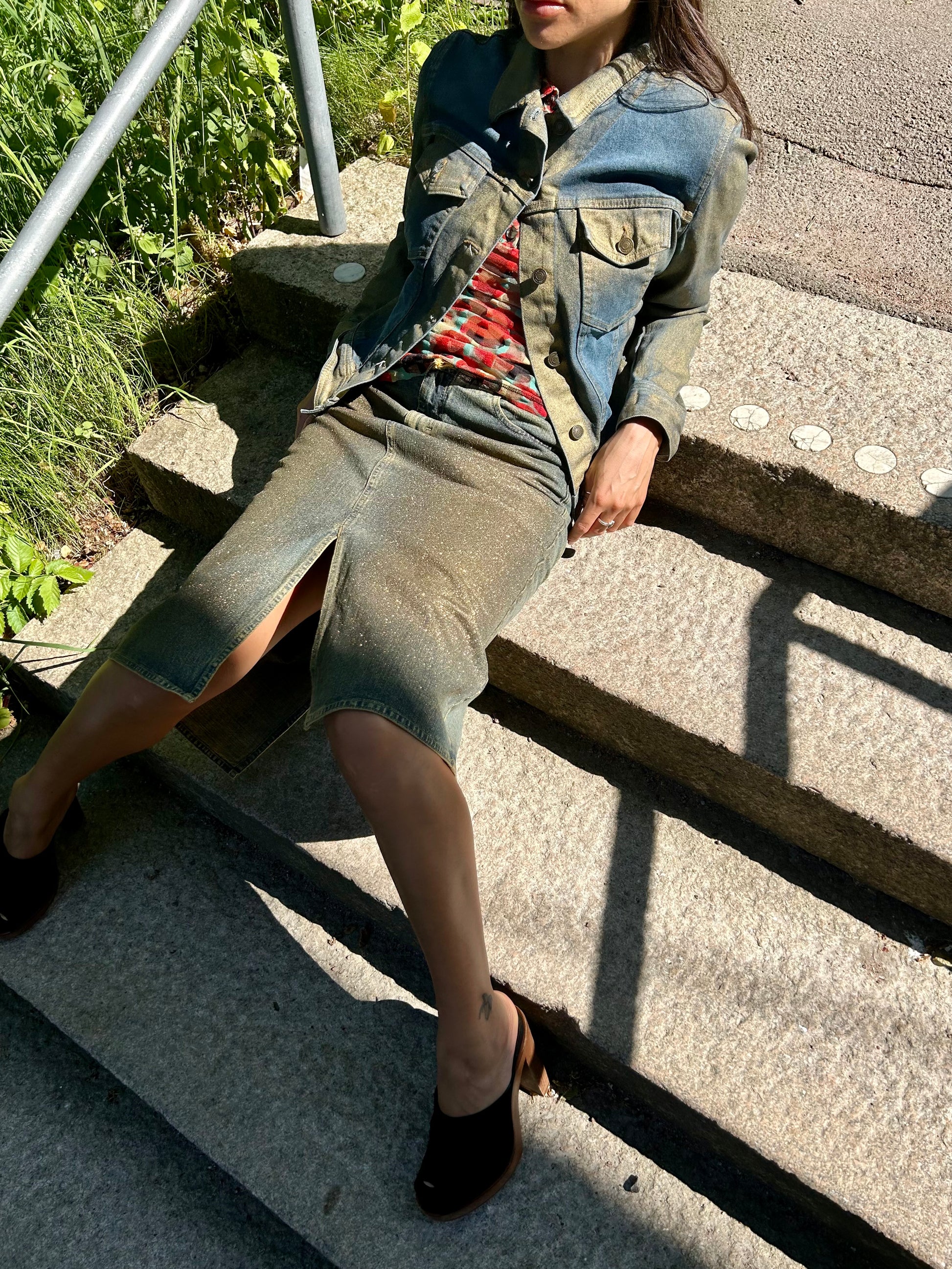 A rare set in denim with skirt and jacket both in denim. A distressed design to the denim with a greenish blue denim color and gold imprints. Skirt is a mid length skirt with a raw hem cut at the top and big slits both back and front. Jacket is a fitted classic design, slightly shorter in the back.