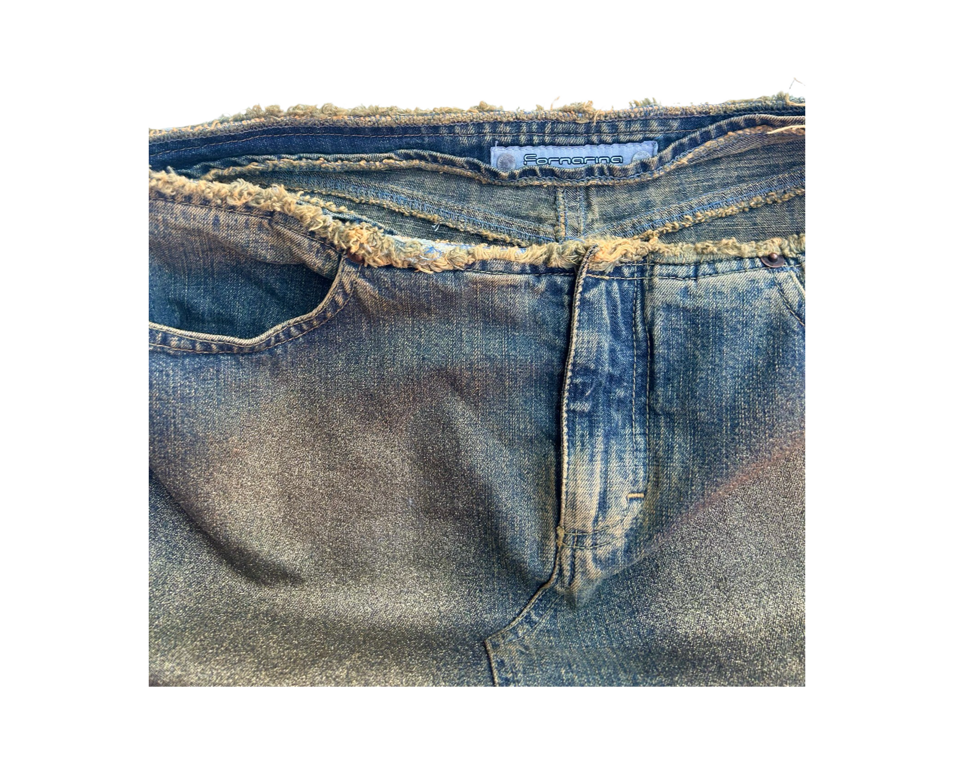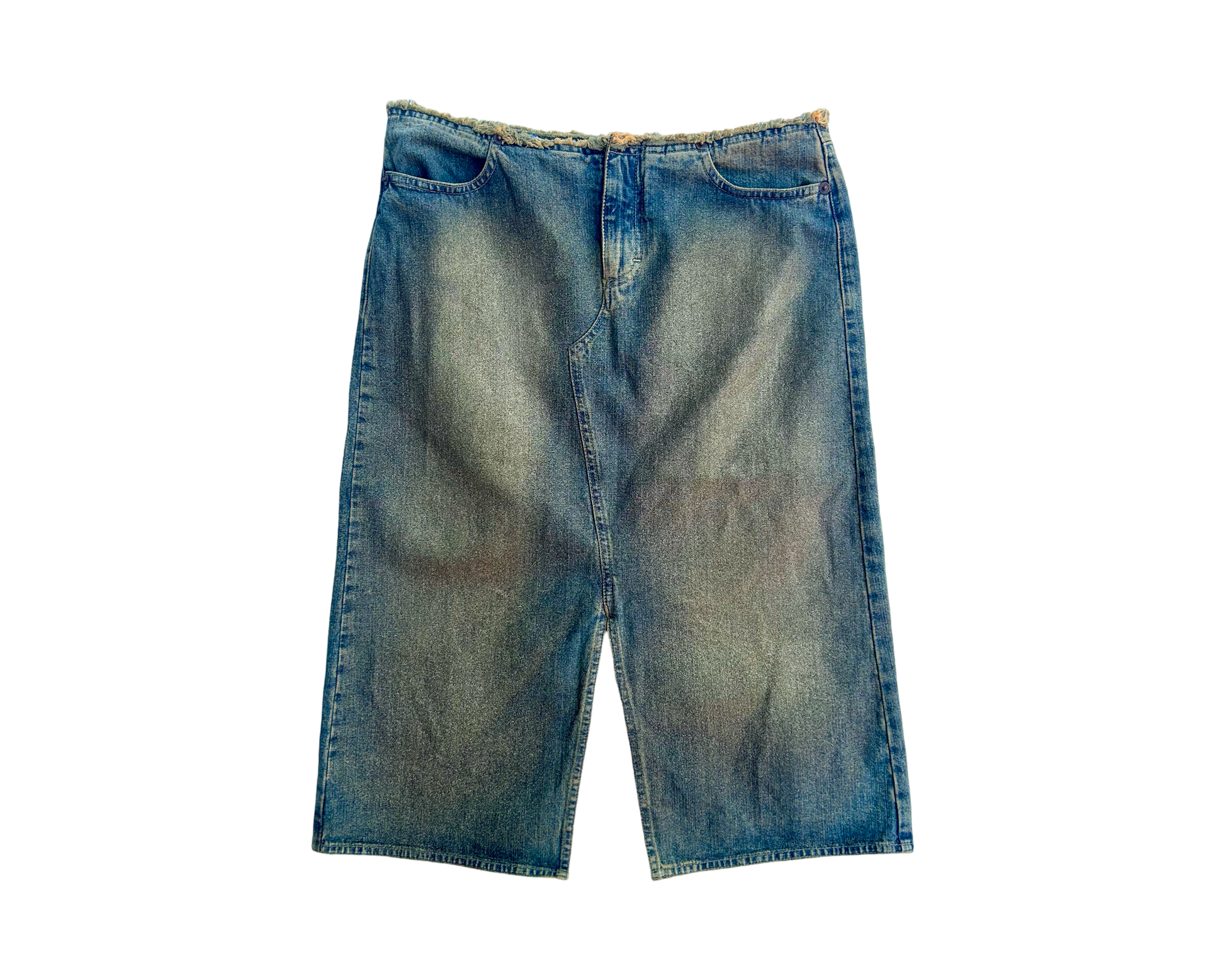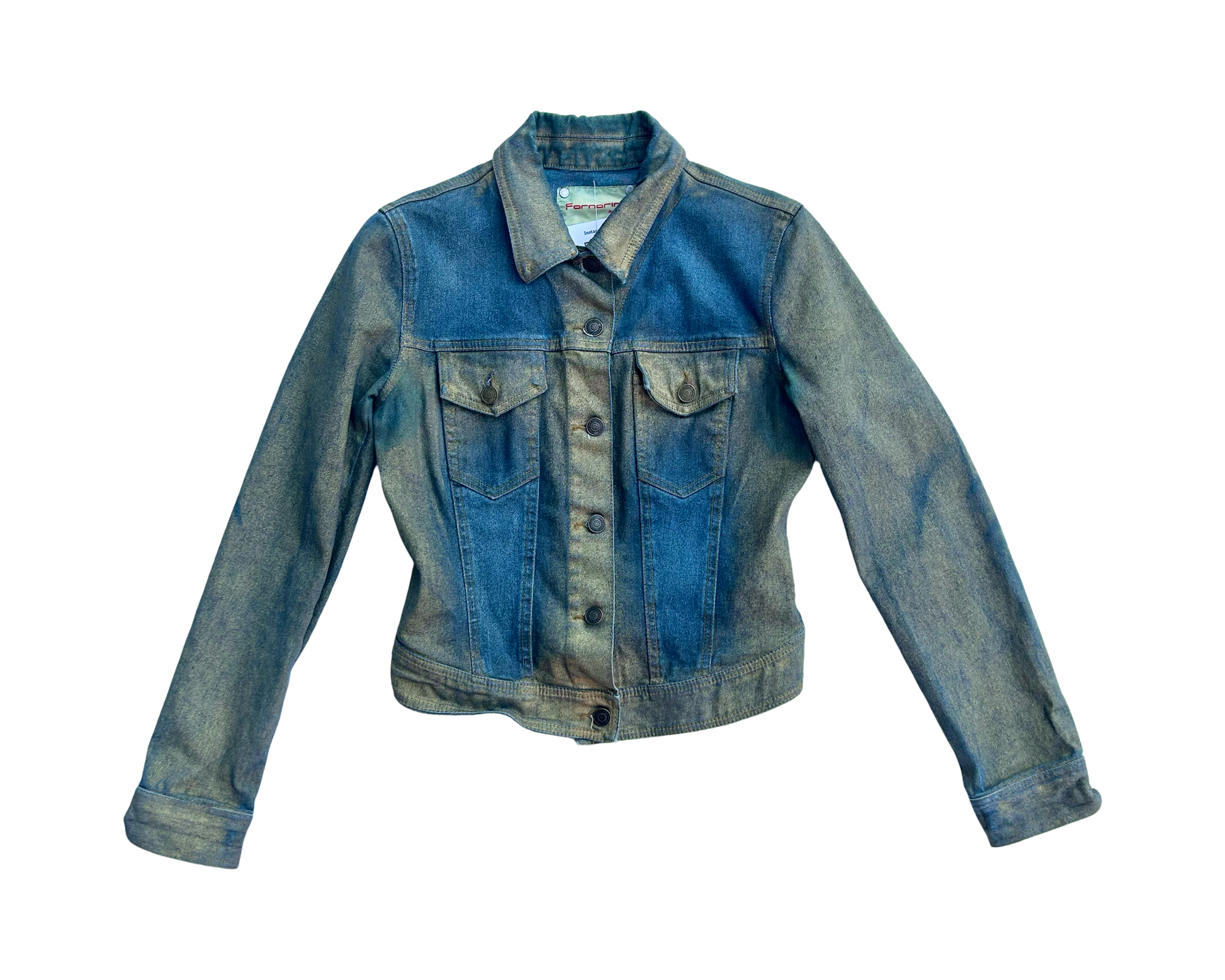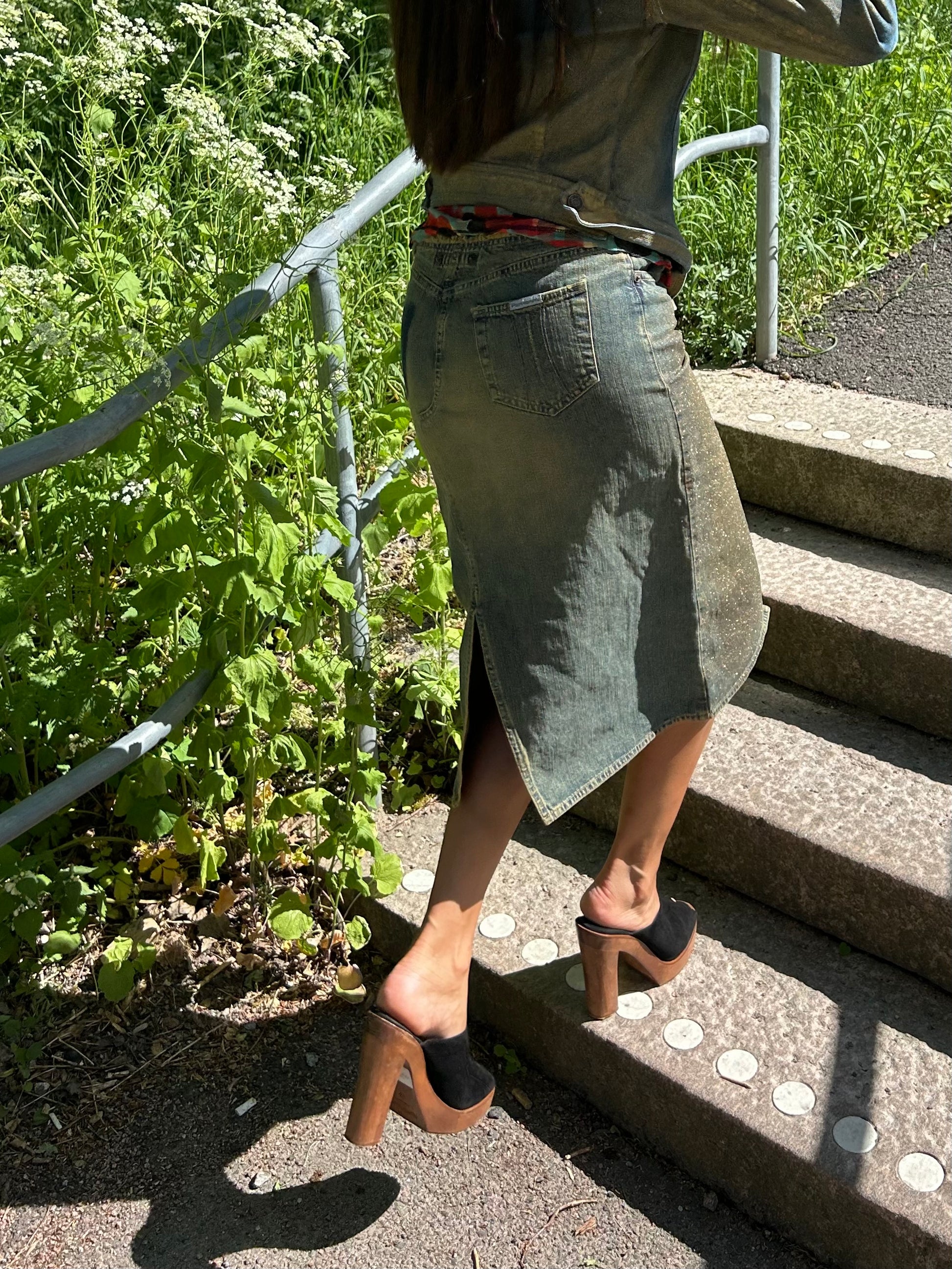 A rare set in denim with skirt and jacket both in denim. A distressed design to the denim with a greenish blue denim color and gold imprints. Skirt is a mid length skirt with a raw hem cut at the top and big slits both back and front. Jacket is a fitted classic design, slightly shorter in the back.