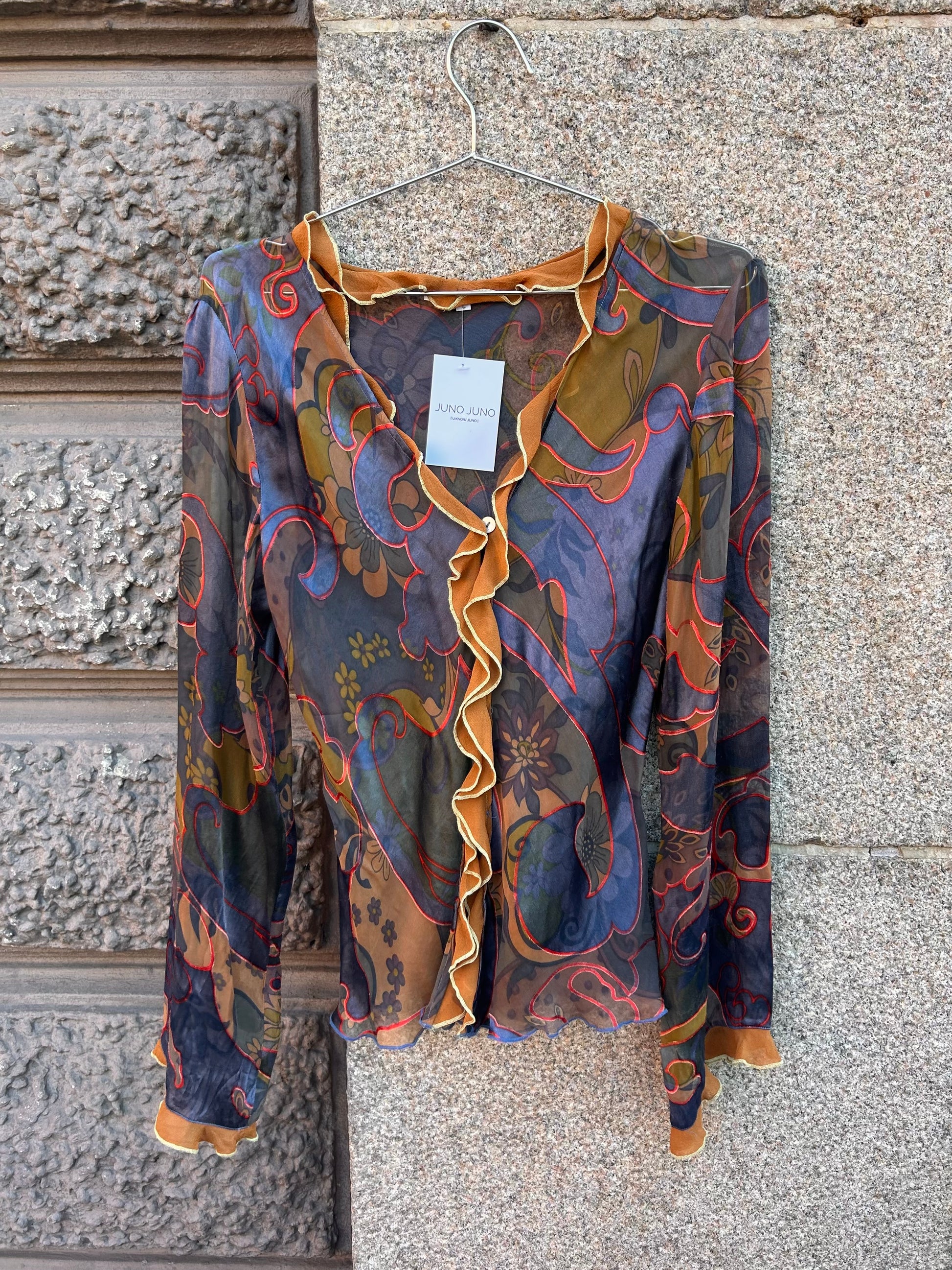 A silk blouse in a thin material and frill details, seashell buttons in front.