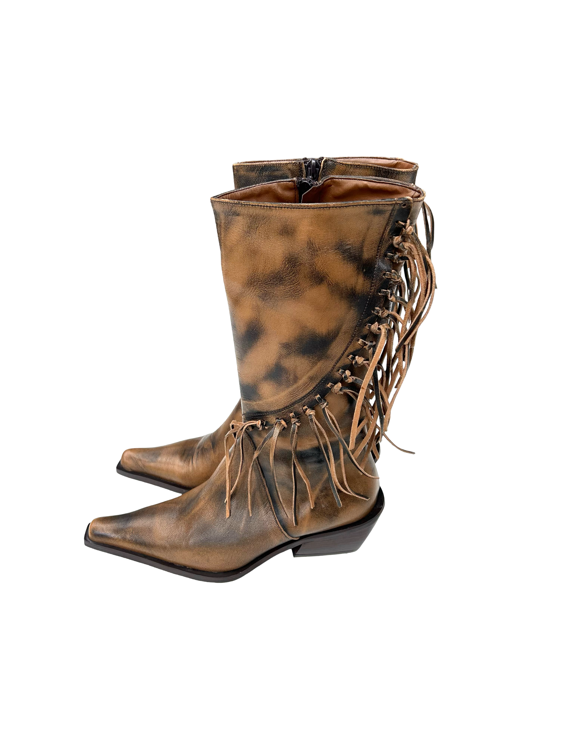 A mid high brown cowboy boots in a distressed look and square pointy toe. Zipper on inside of leg