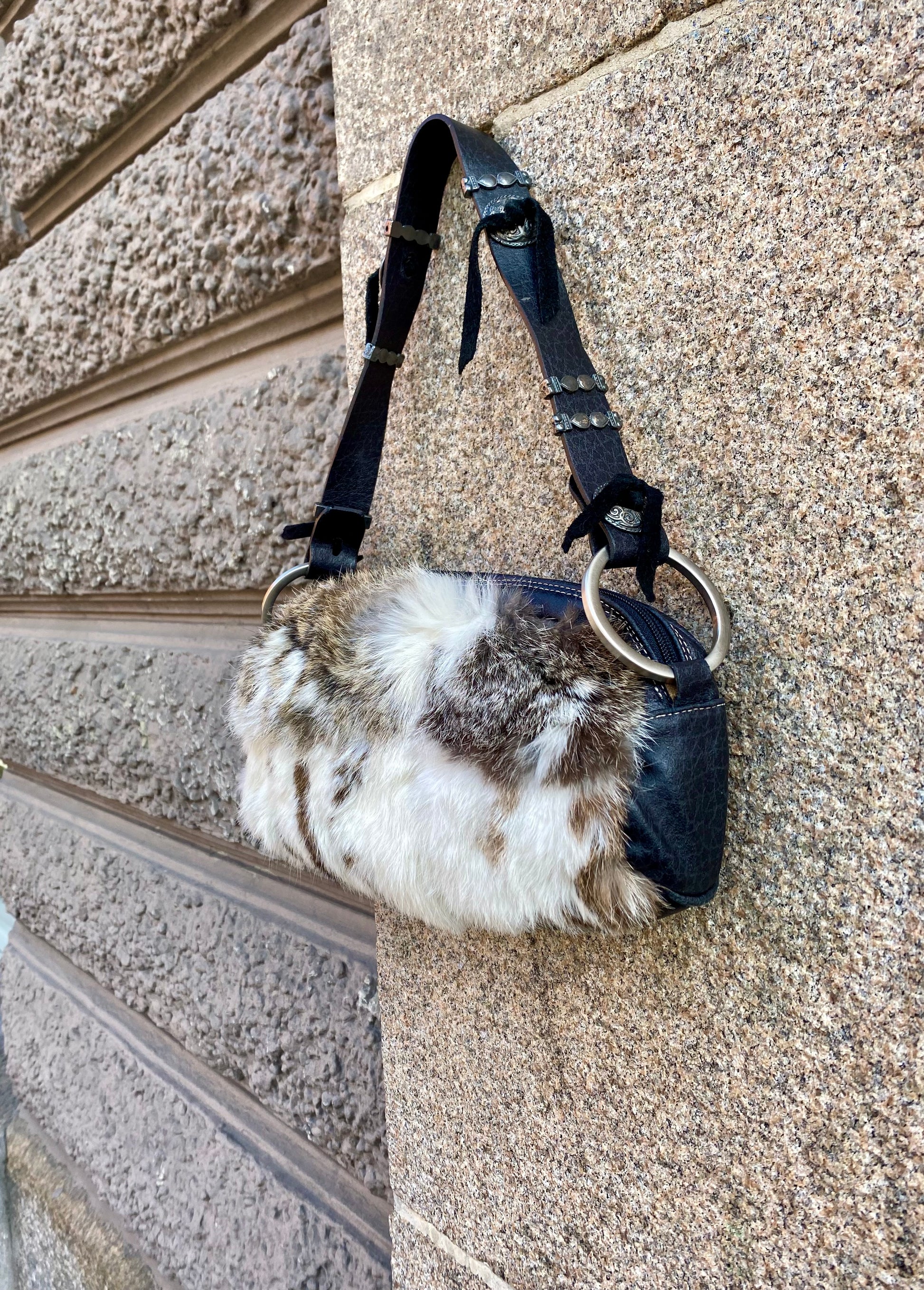 Fluffy fur front and leather back. Metal details and leather strap. Chic and unique!