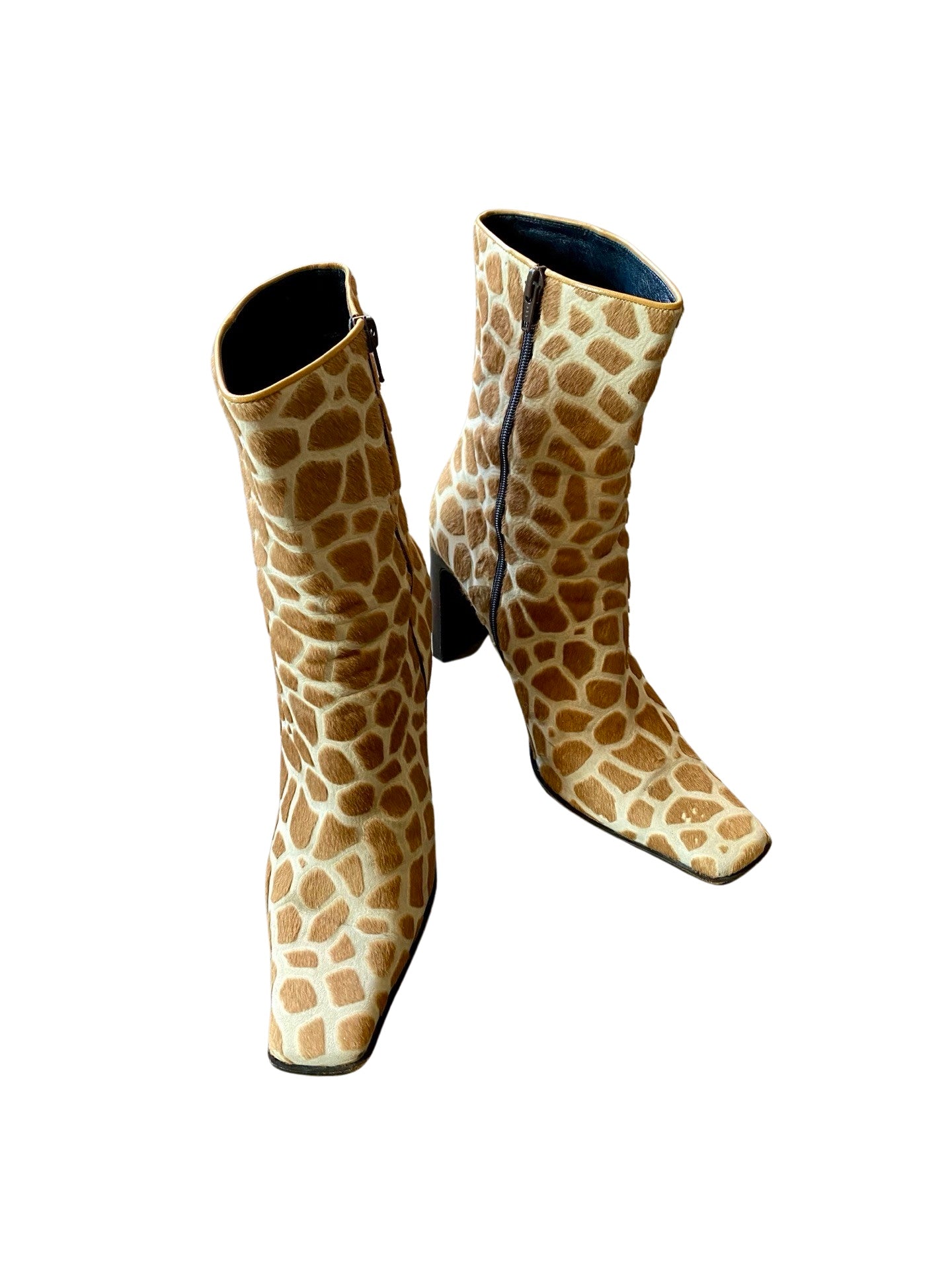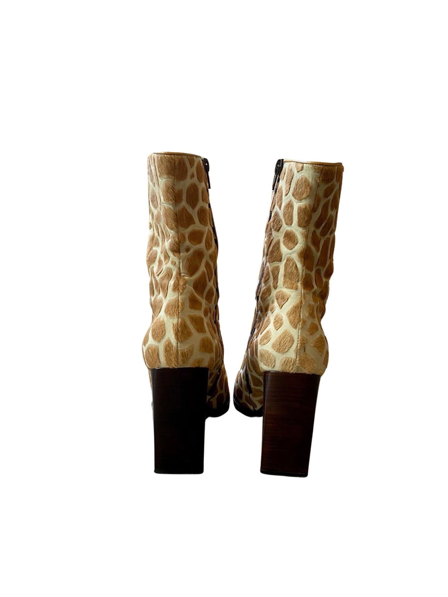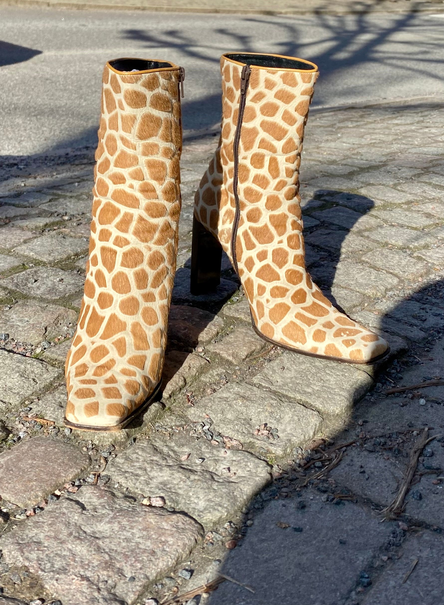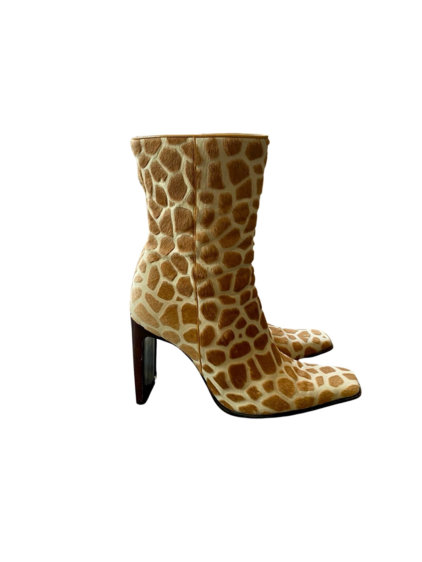 These gorgeous boots have a shaved out fur giraffe print and a flat rectangular heel. The ultimate boots for a true diva!