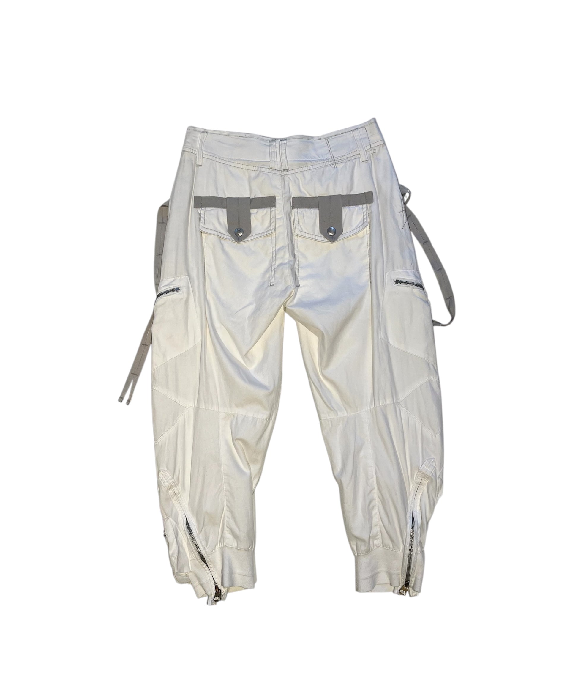 Capri pants from Marithé + Francois Girbaud in a flattering cargo model. The pants are in a white, lightweight fabric with details in gray. Patchwork details in white. They have zipper pockets, and cuffs at the end of the legs, as well as zippers. Closes in the front with a zipper, button and hook.