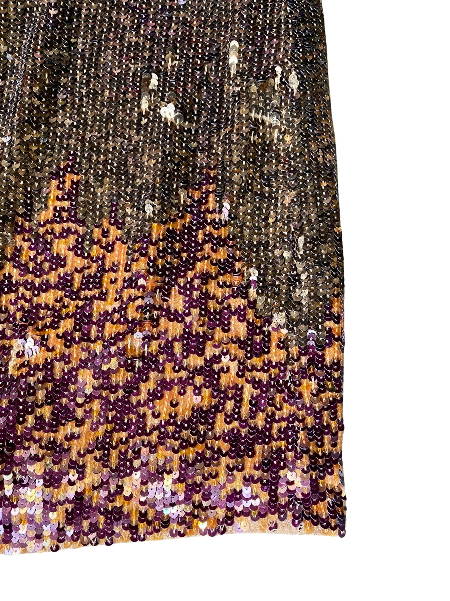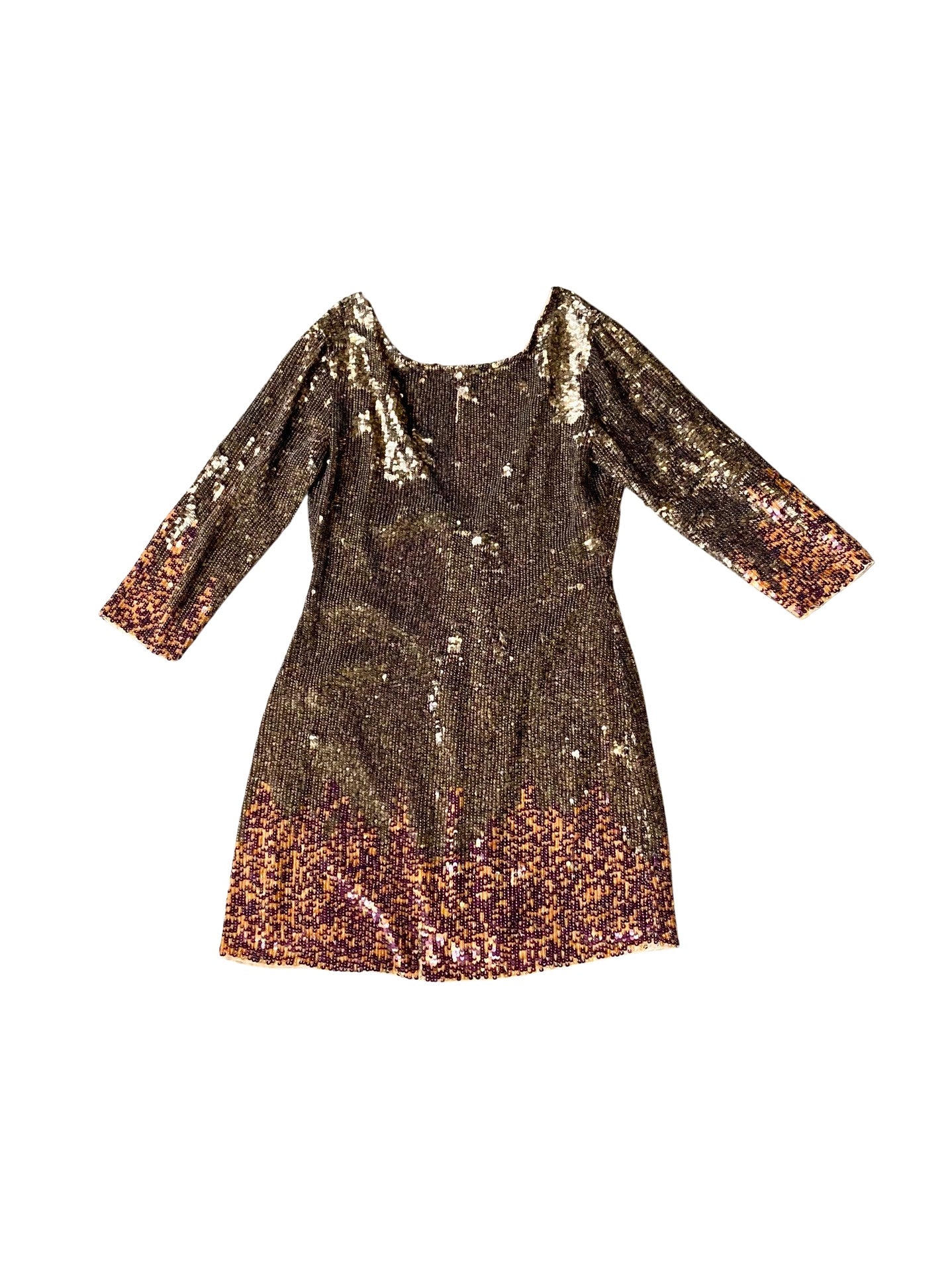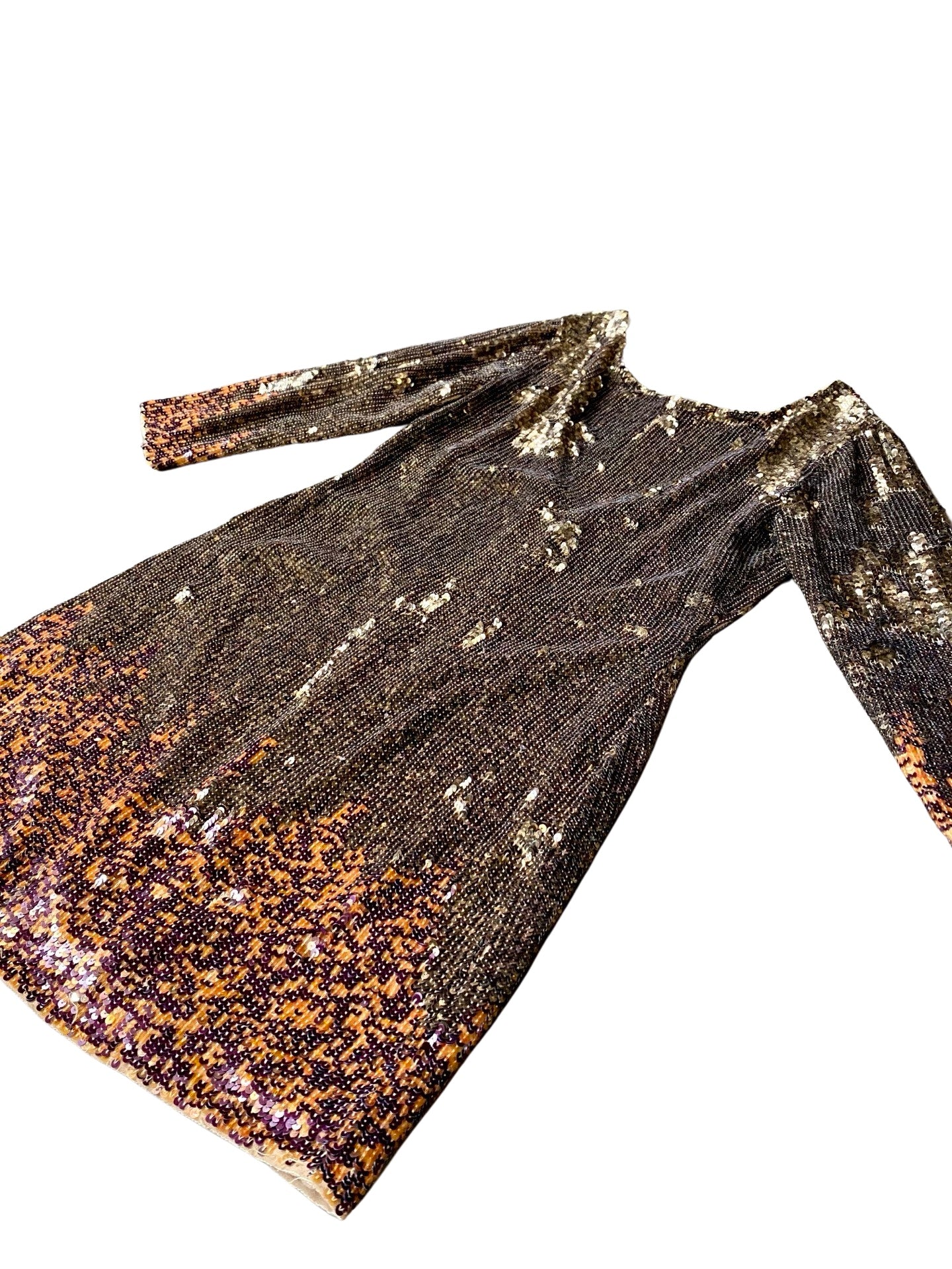 Vibrant golden sequin dress, orange and purple details along the hemlines. Be the center of the dance floor in this shiny disco dress!
