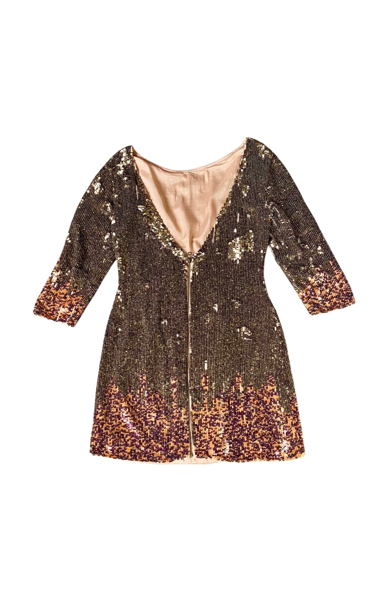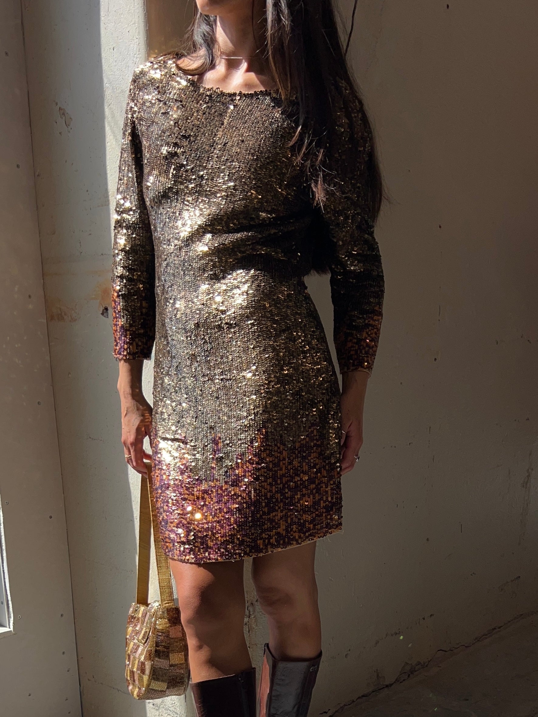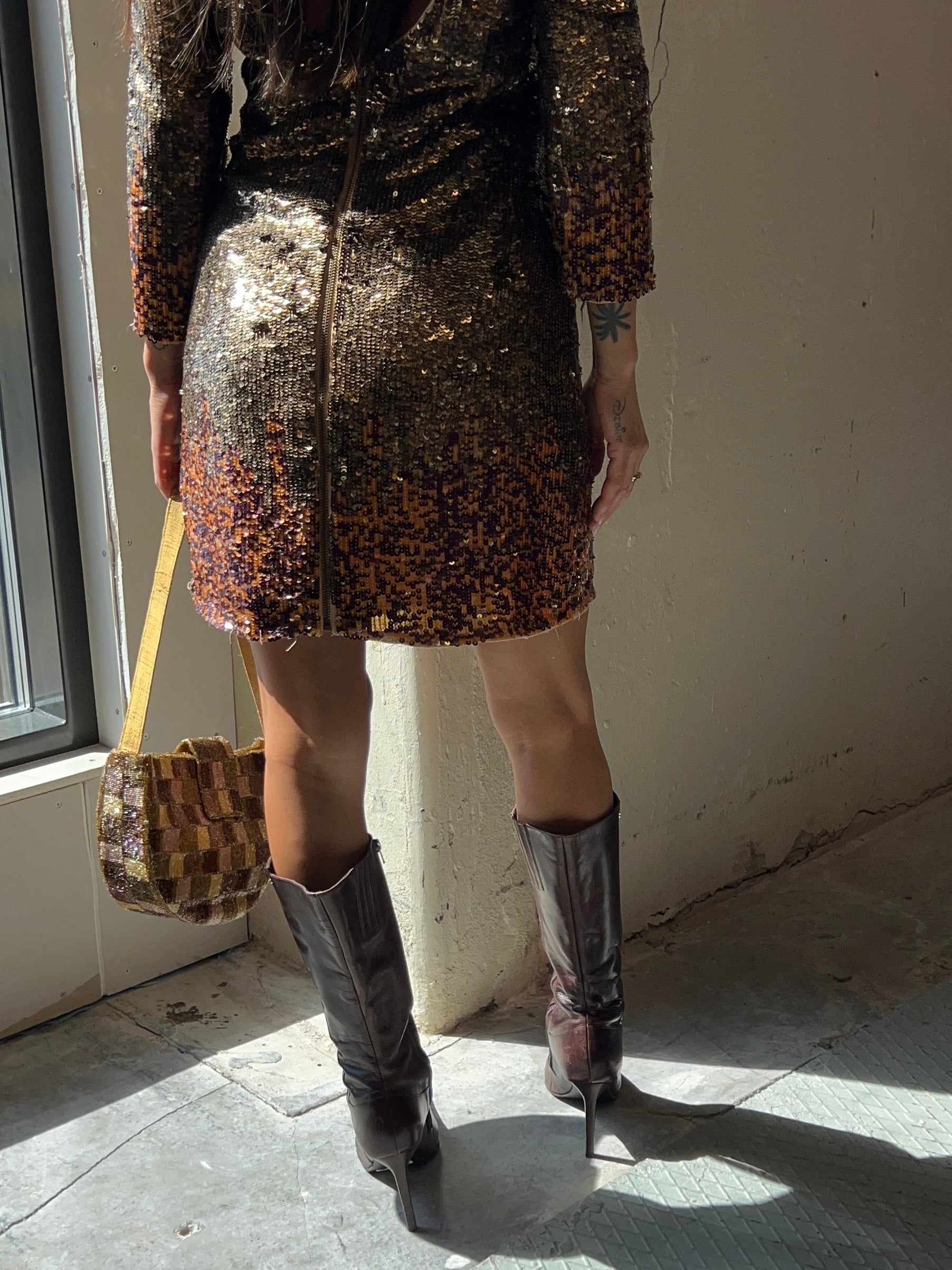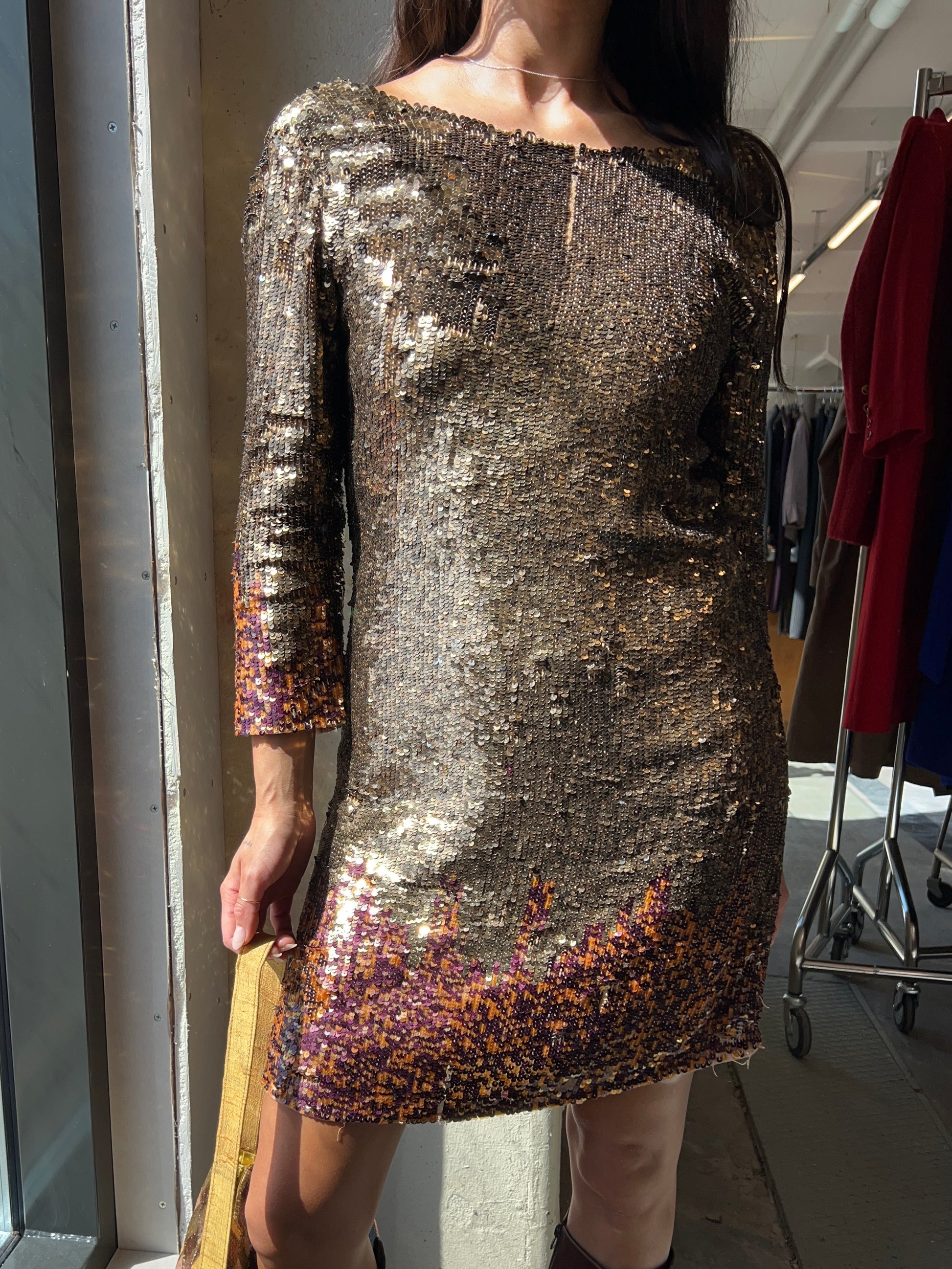 Vibrant golden sequin dress, orange and purple details along the hemlines. Be the center of the dance floor in this shiny disco dress!