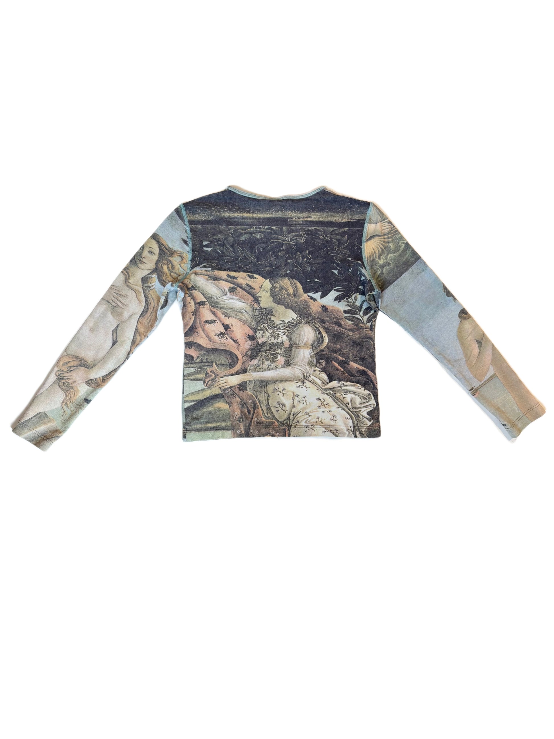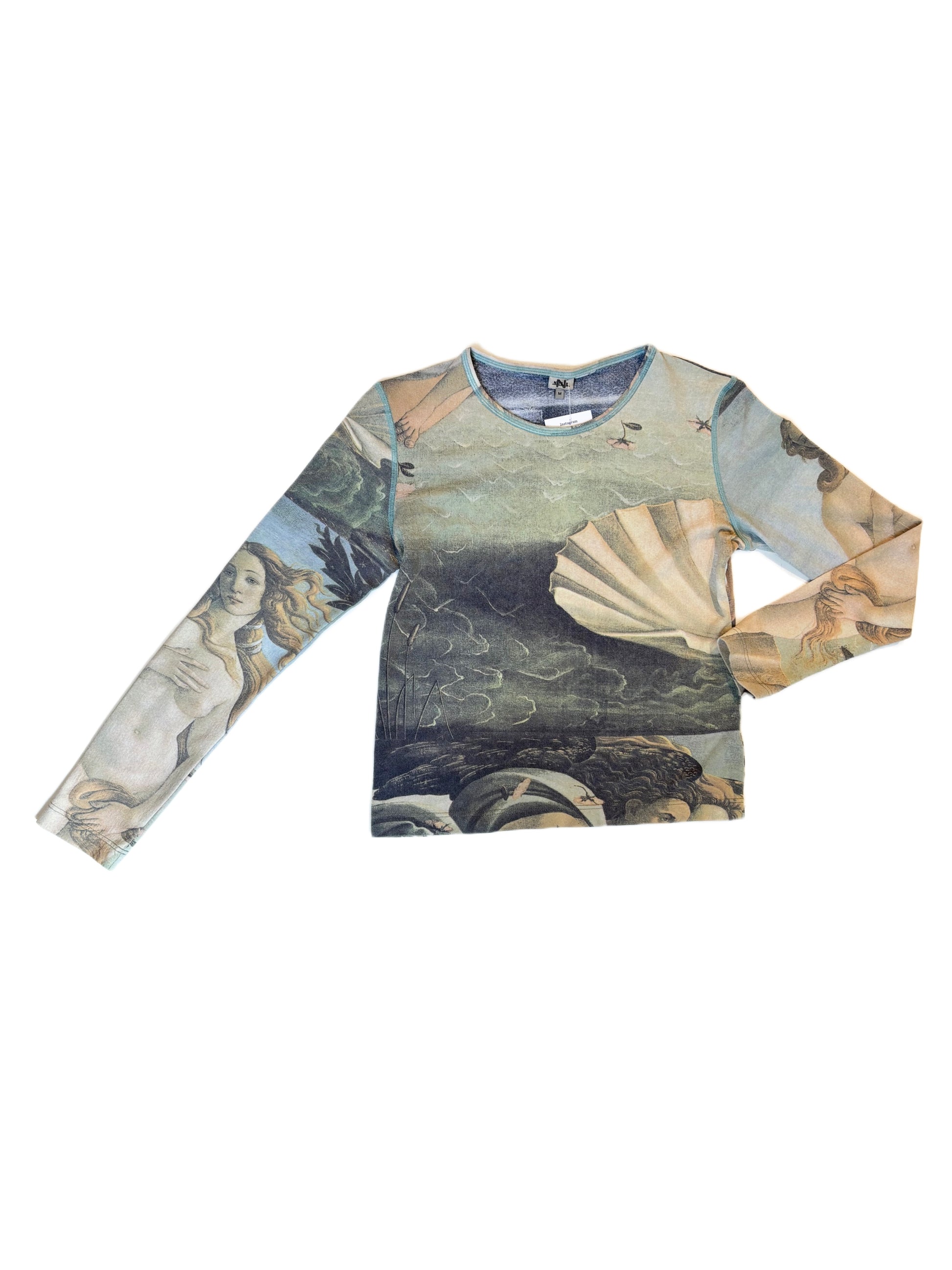This printed top is a wearable masterpiece. Featuring Sandro Botticelli’s iconic Birth of Venus, it brings Renaissance romance to your modern wardrobe. The sheer stretch mesh makes it breathable and easy to layer, while the slim fit creates an effortlessly sleek silhouette. Ideal for art gallery outings, late-night dinners, or making a statement in the everyday.
