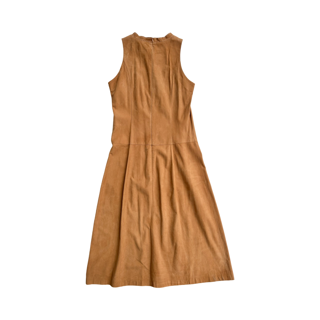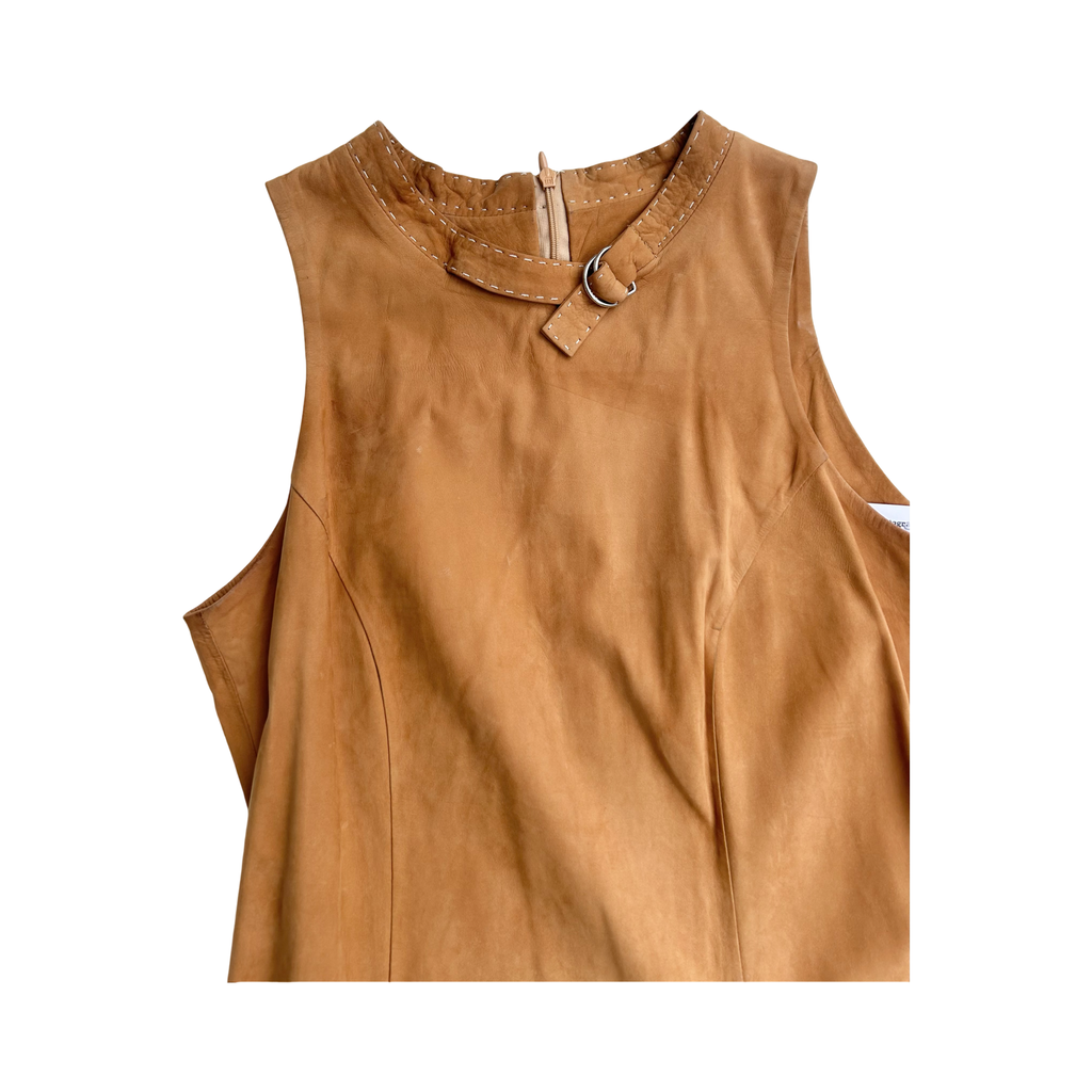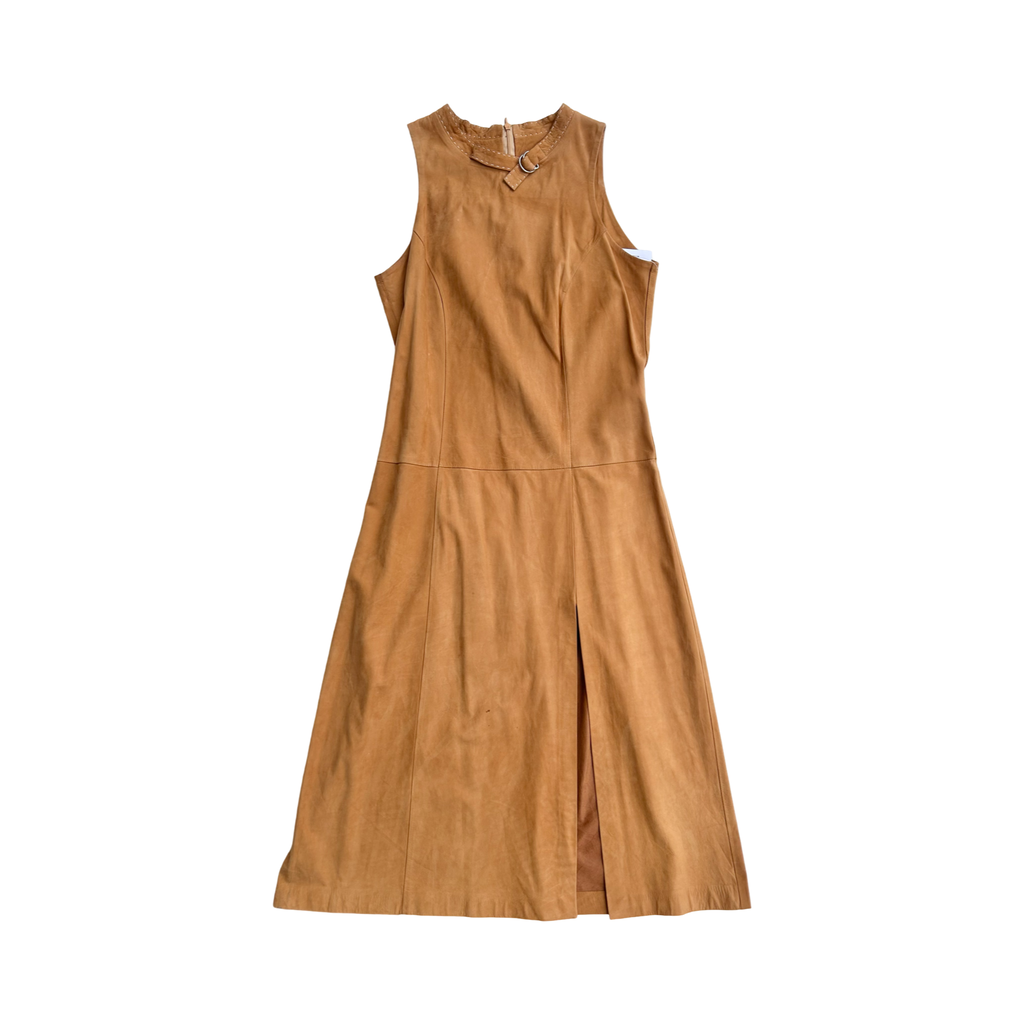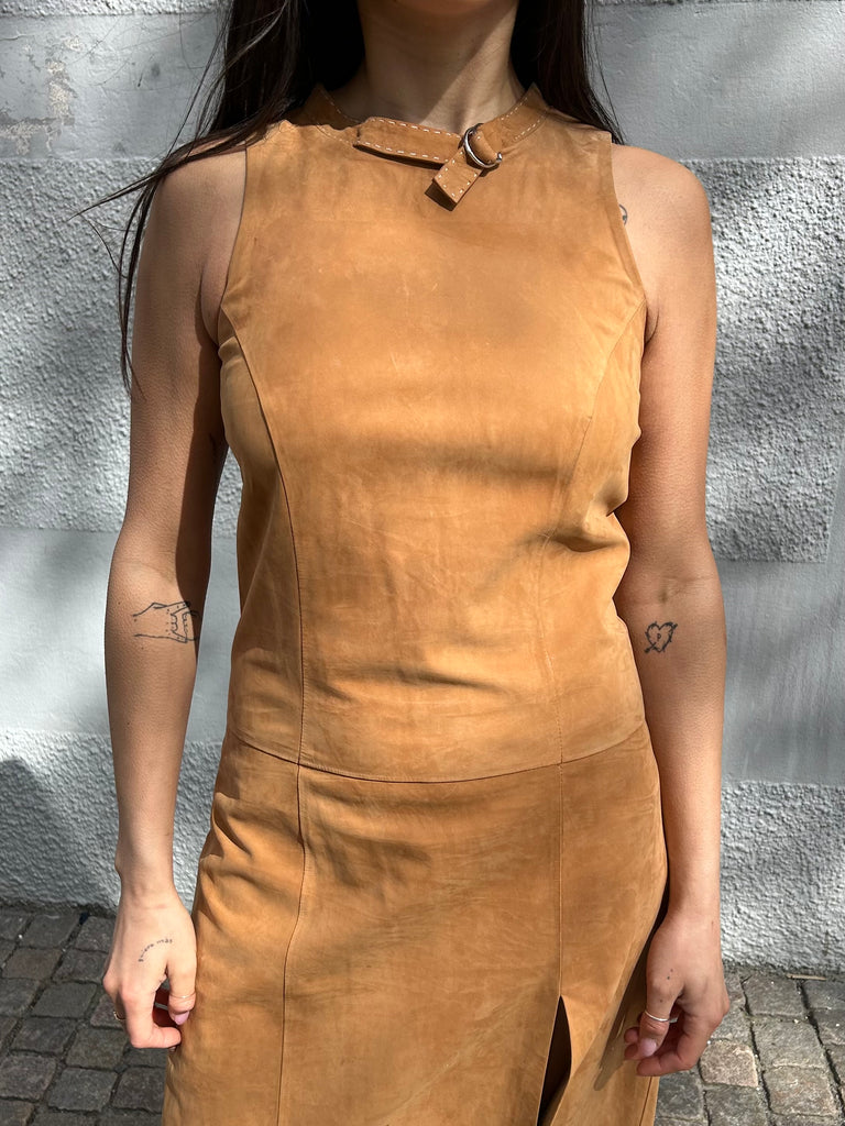 A beautiful dress in softest calf leather in a high neck design with buckle detail and high split.