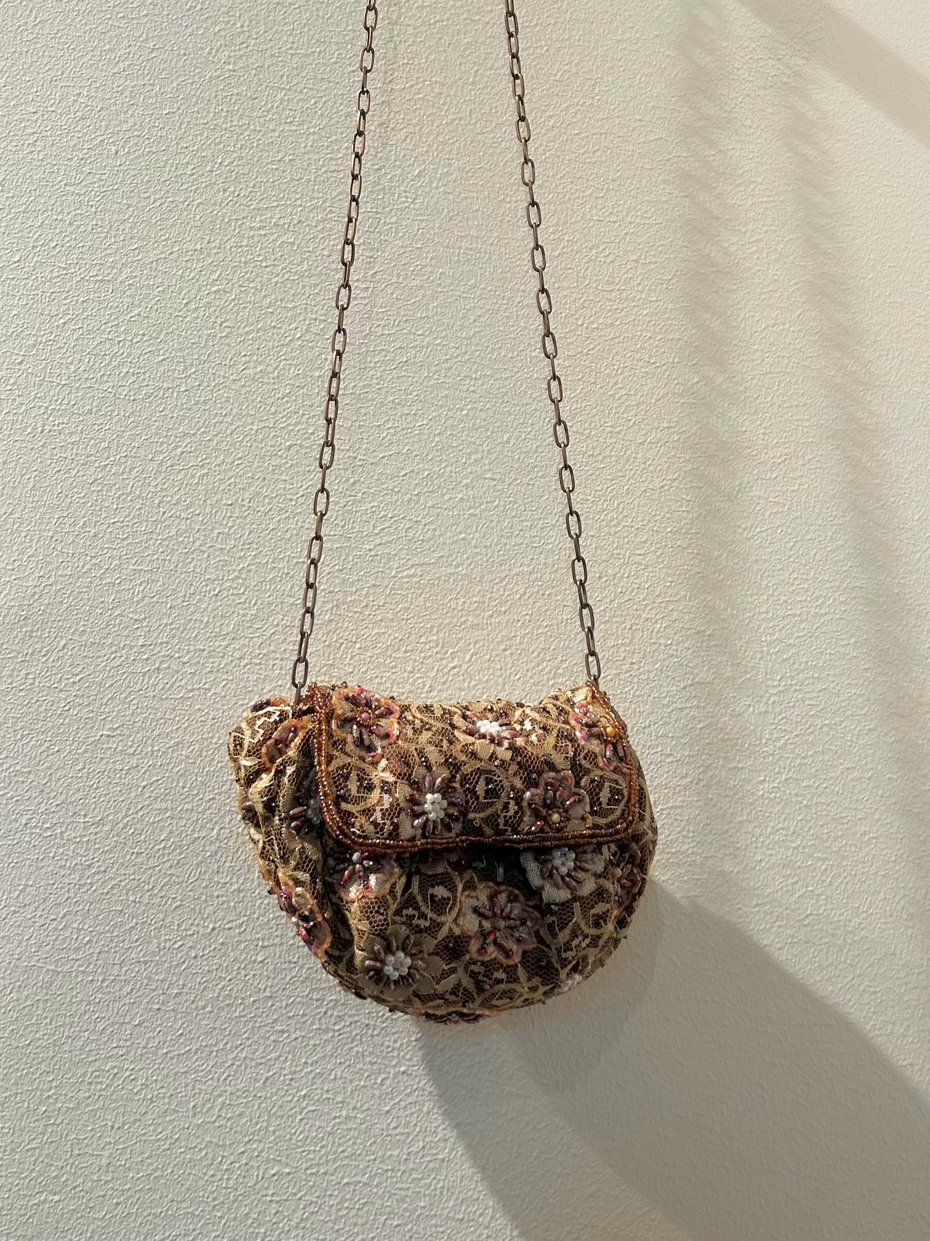 A very detailed mini bag with brass chain strap. Snap button to close under flap and under beautiful embellishment is a beautiful golden lace fabric.