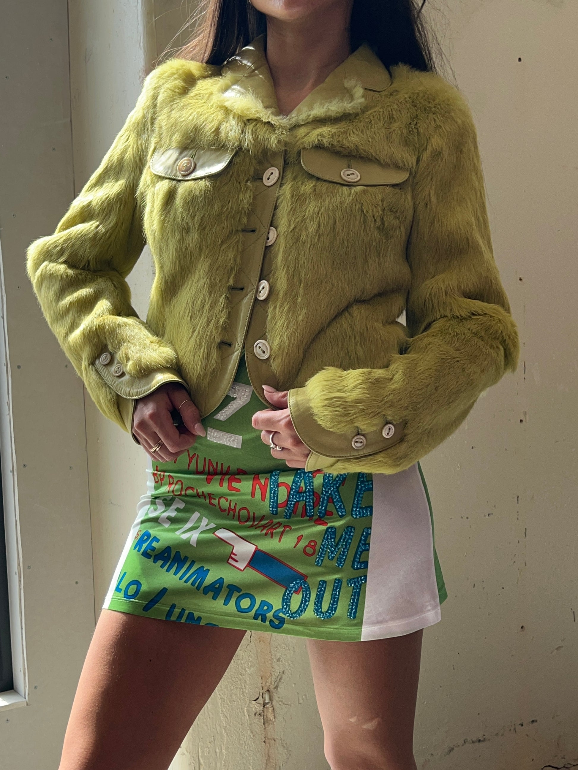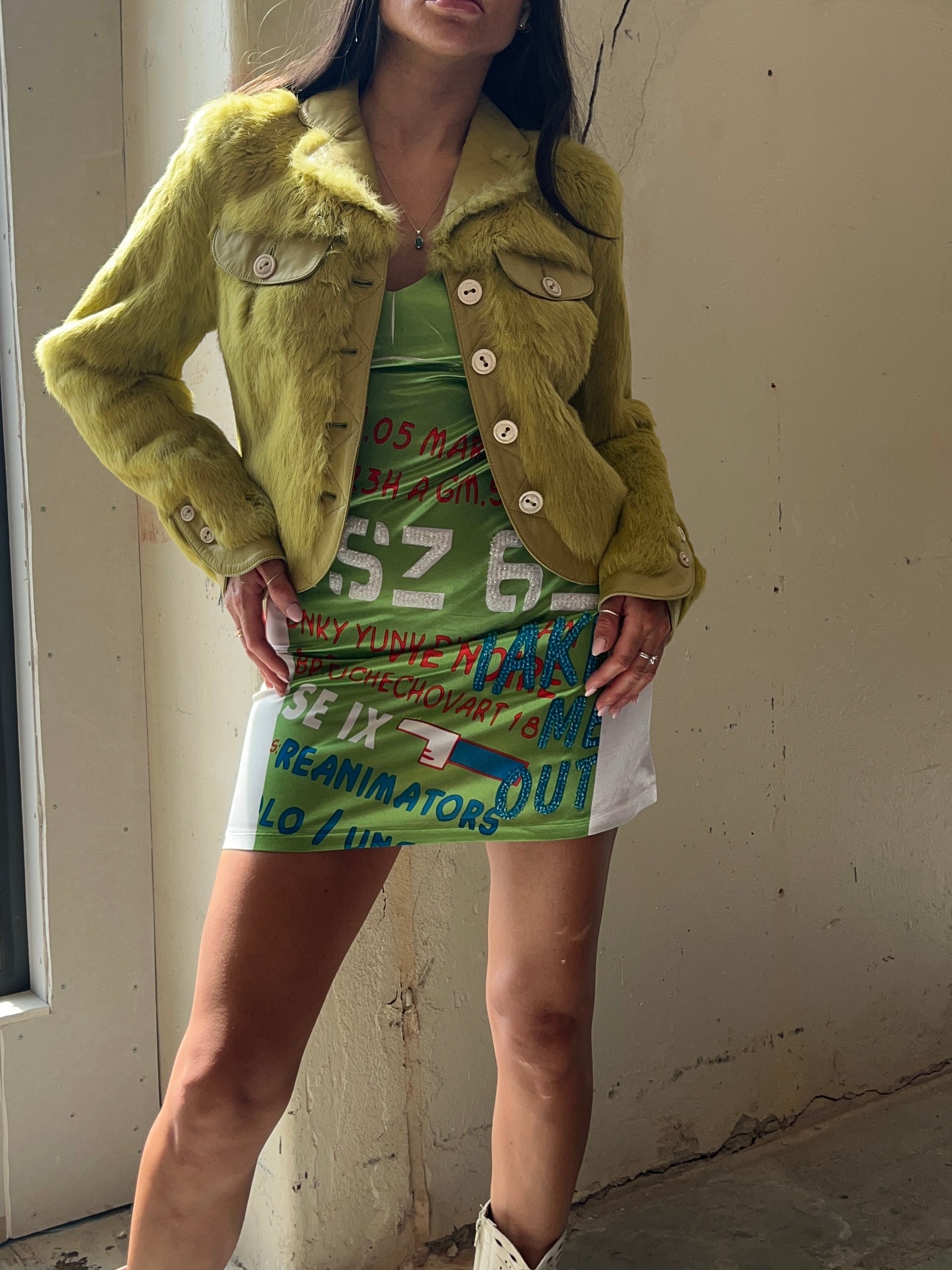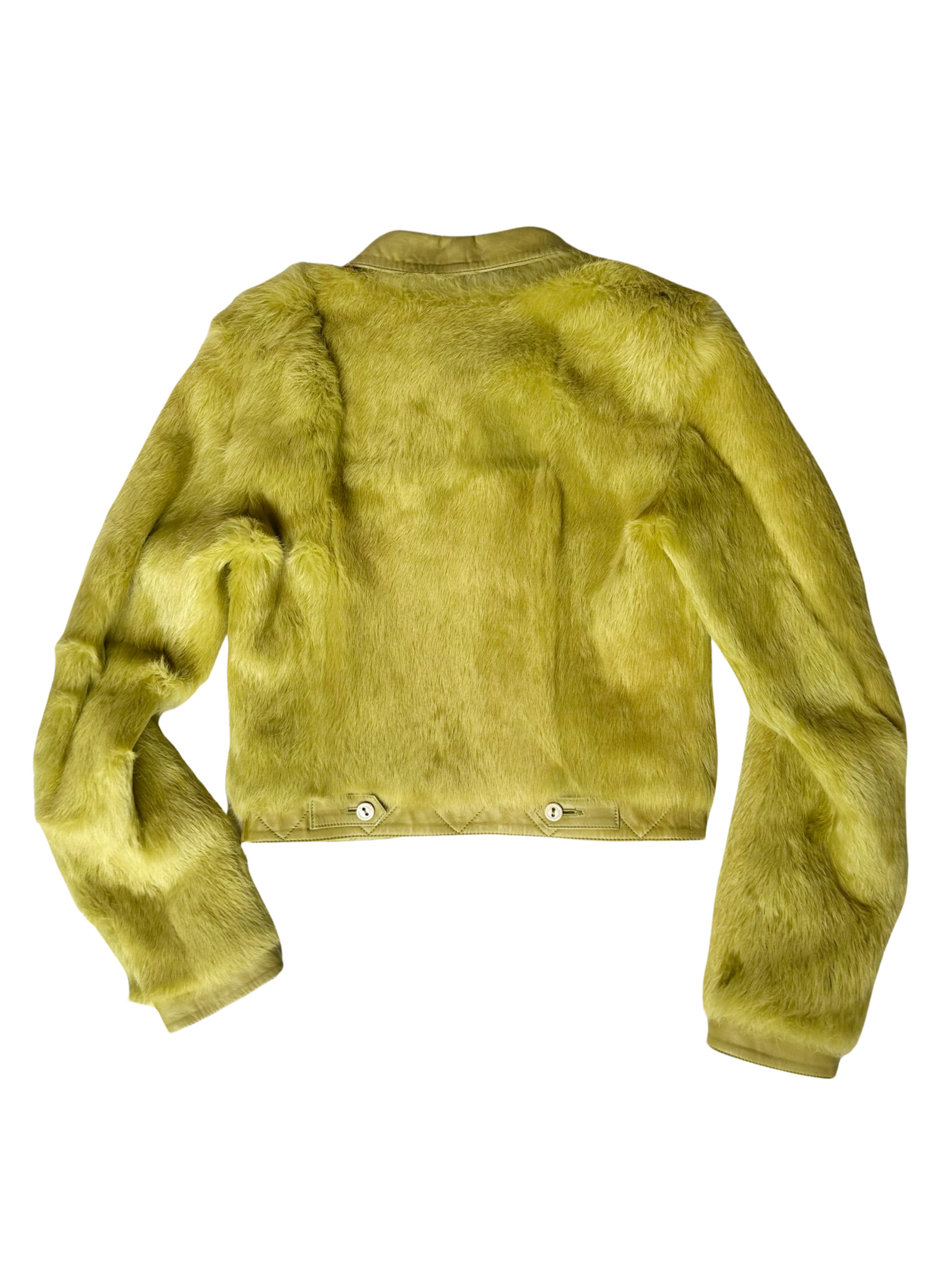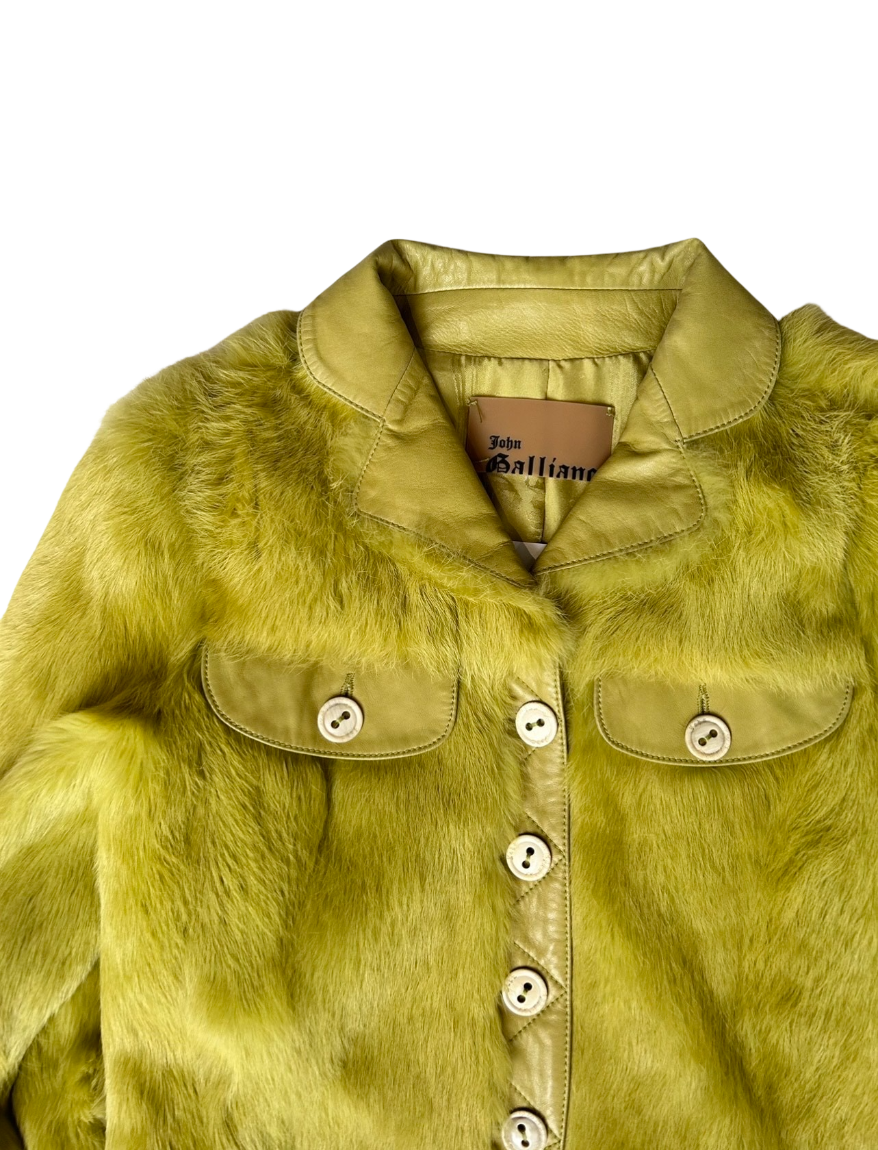 This beautiful jacket is a work of art signed John Galliano. A short and fitted design and buttons in front and on pockets. A soft jacket with a luxurious green color.