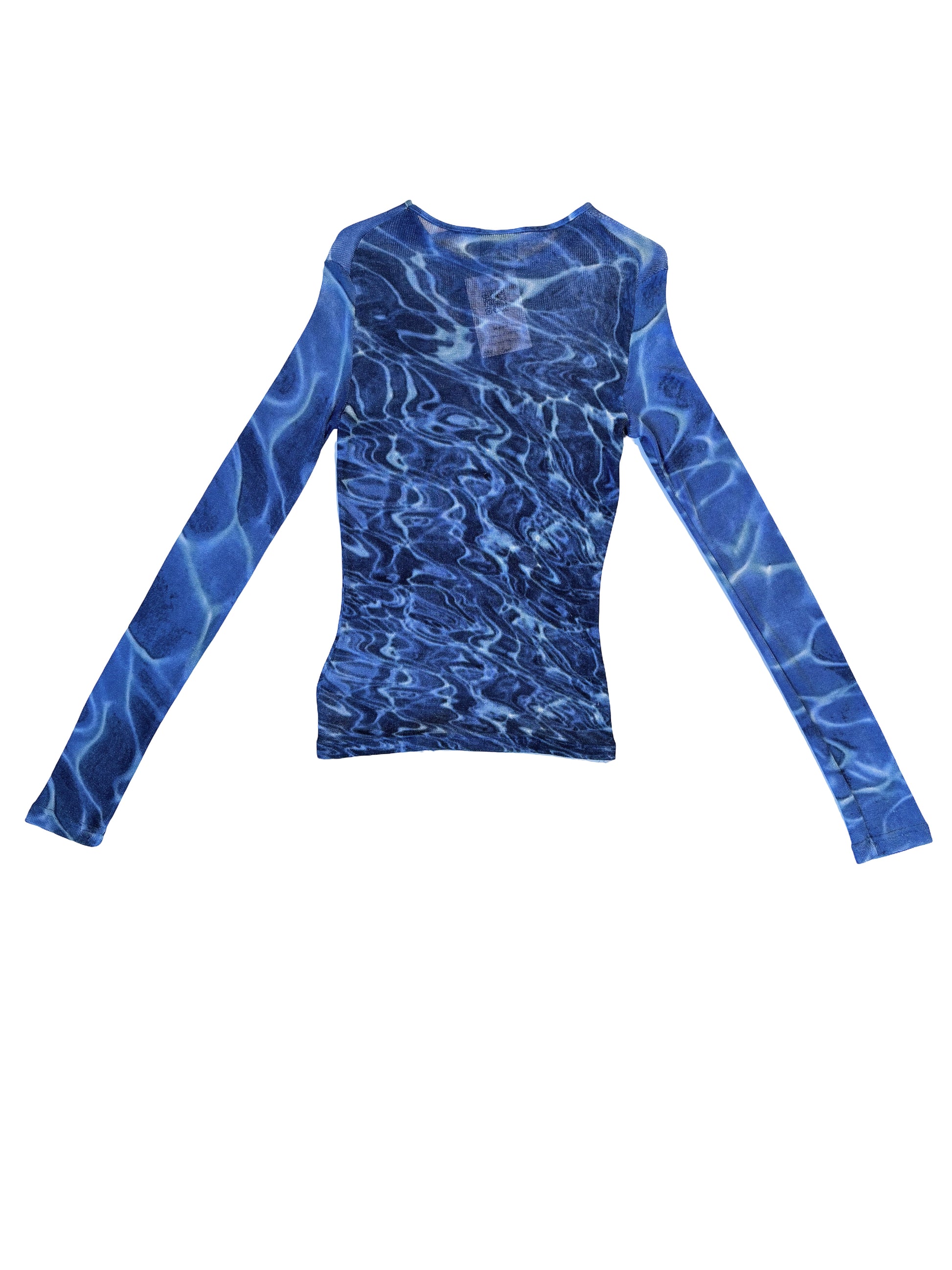 A bold and eyecatching longsleeve top by Just Cavalli in a stretchy mesh fabric. Features a vivid blue water ripple print that adds a dynamic, fluid feel to the silhouette. Fitted cut for a flattering shape. A statement piece ideal for layering or wearing on its own.