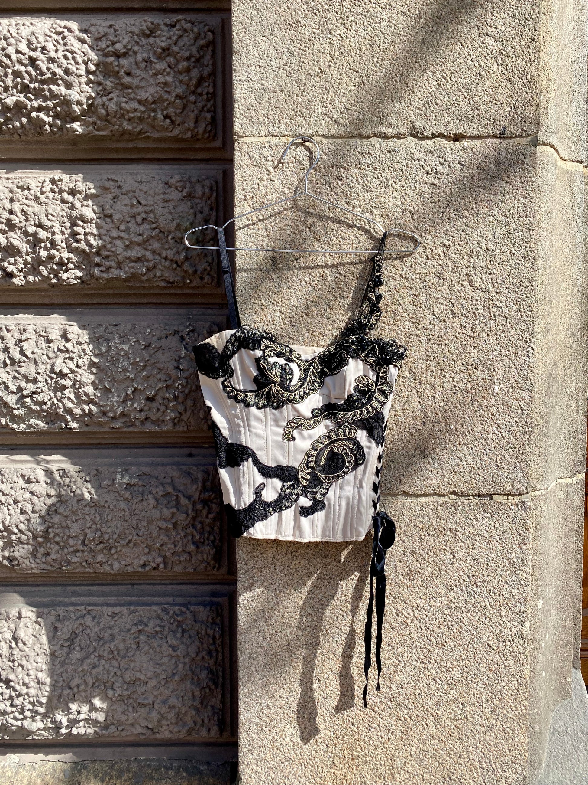 Shiny Karen Millen off white corsage with lace and pearl embroidery. Shoulder strap can be removed for an off shoulder look.