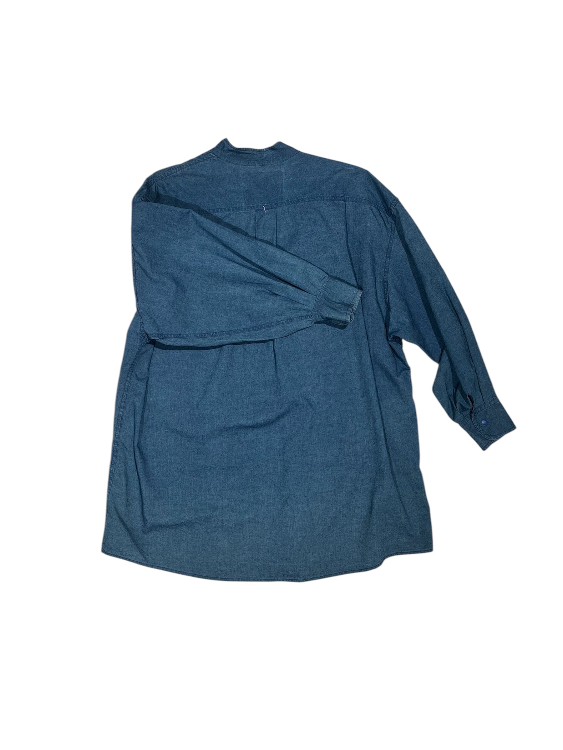 A denim shirt from Kenzo Jeans. The shirt also doubles as a dress. It has ballon sleeves with a fitted cuff, and a high neck collar. The shirt also has a small embroidered flower on the right side of the bust, next to the buttons. Closes on the right side with buttons.